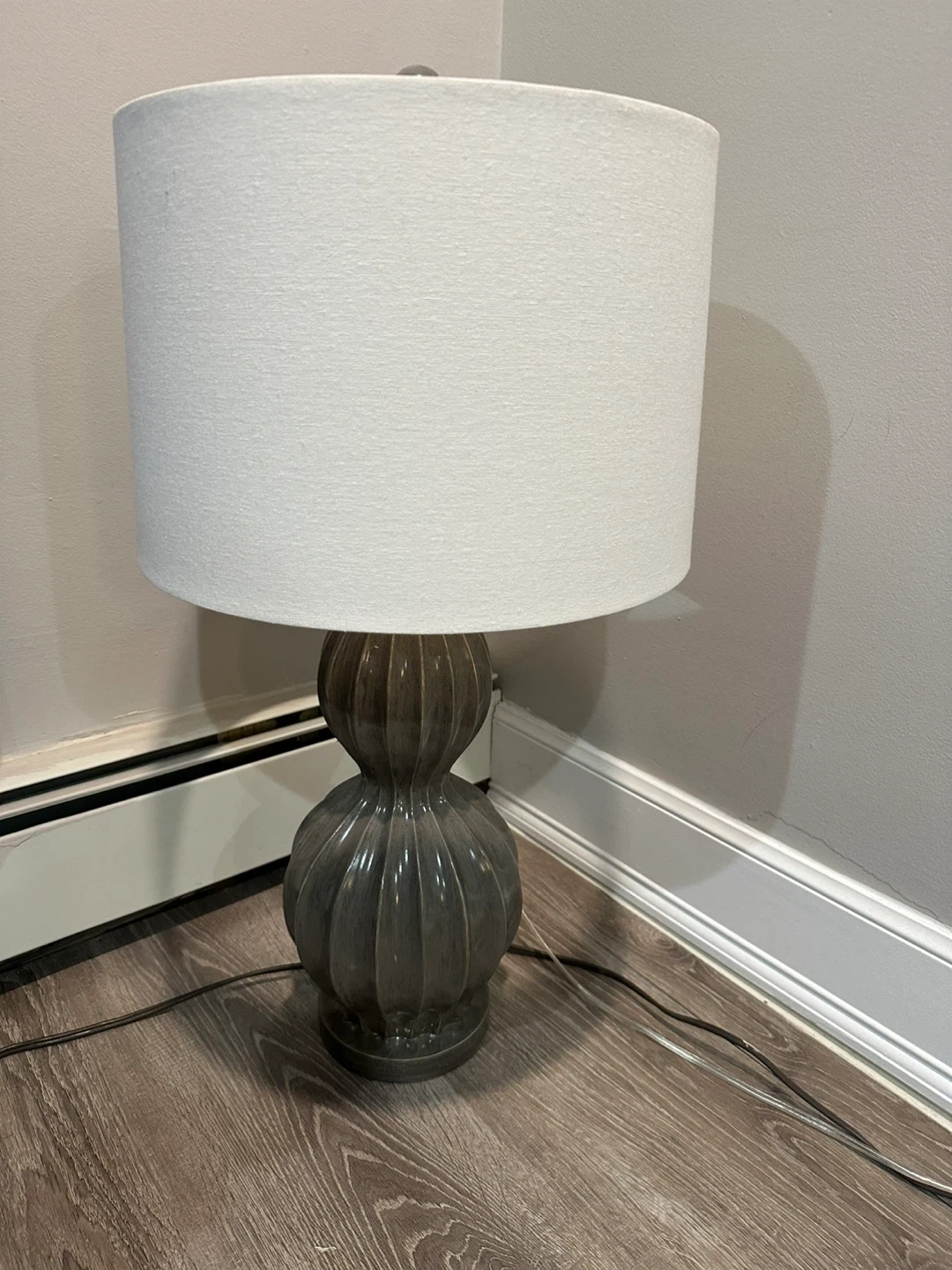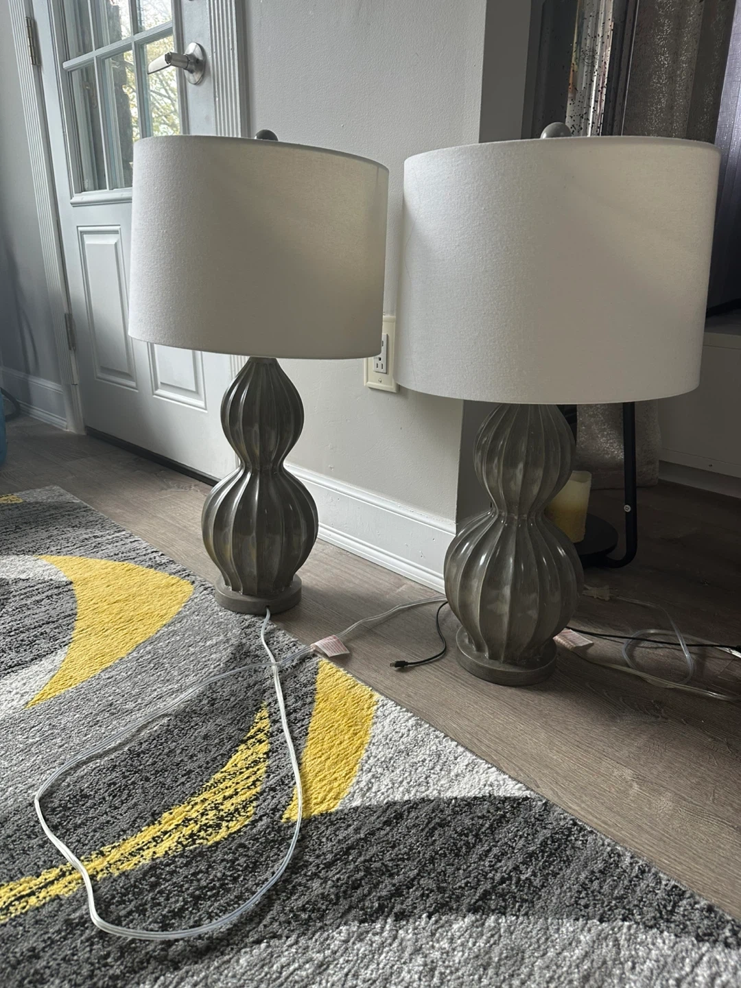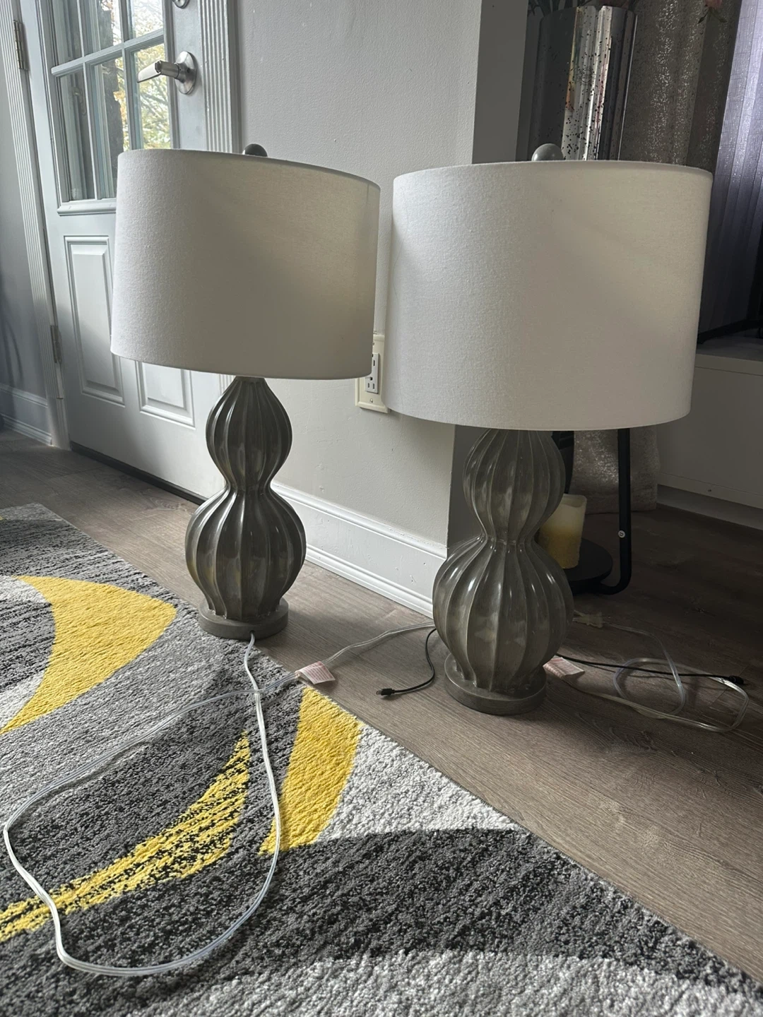 10Selling a set of two table lamps. They have a gray, gourd-shaped base and a white fabric shade. They're in great condition and would look lovely in any room!