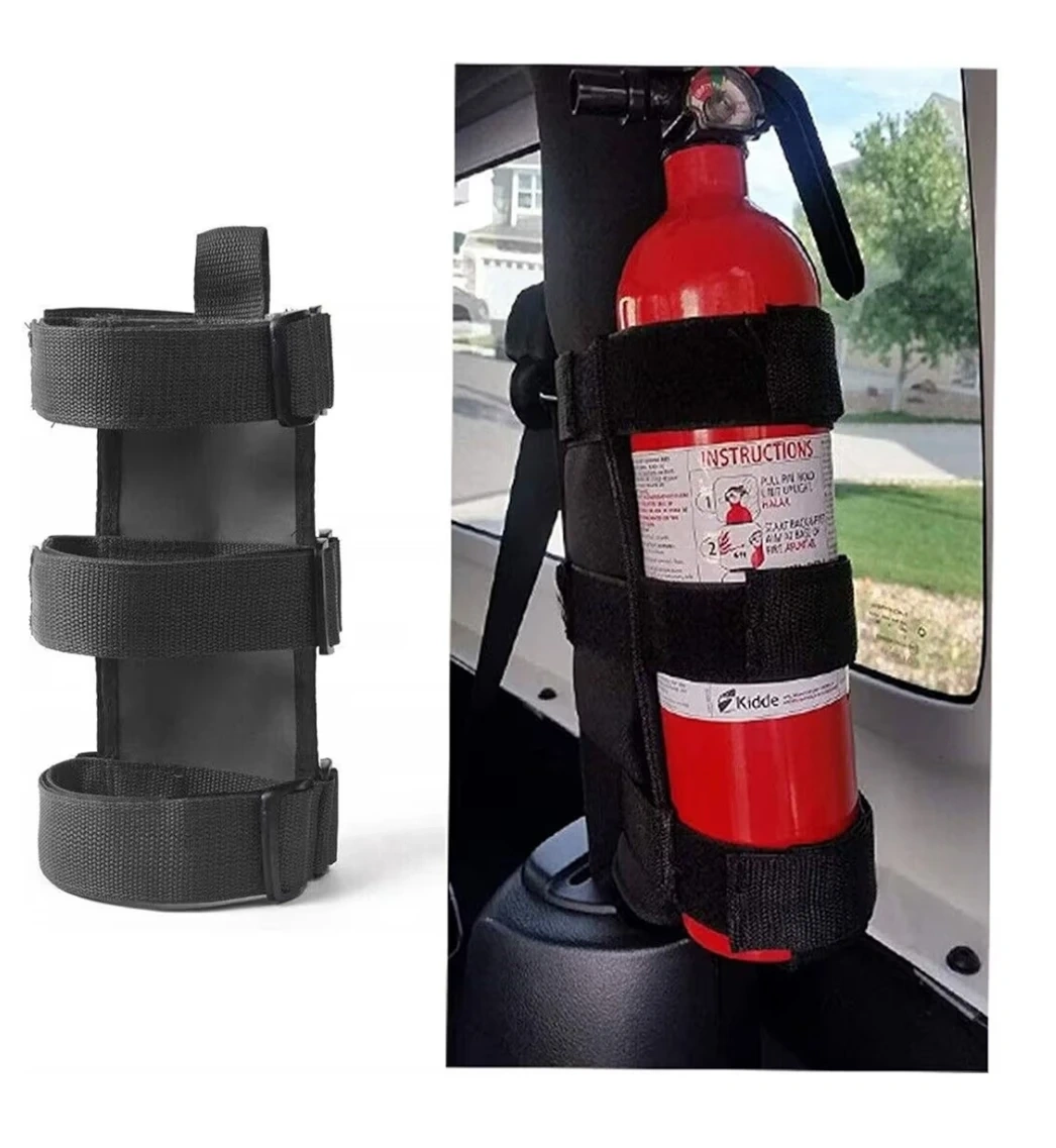 15This is a Sevens fire extinguisher holder designed to fit most sizes of extinguishers suitable for a Jeep Wrangler roll bar. It's highly adjustable and made of black material.