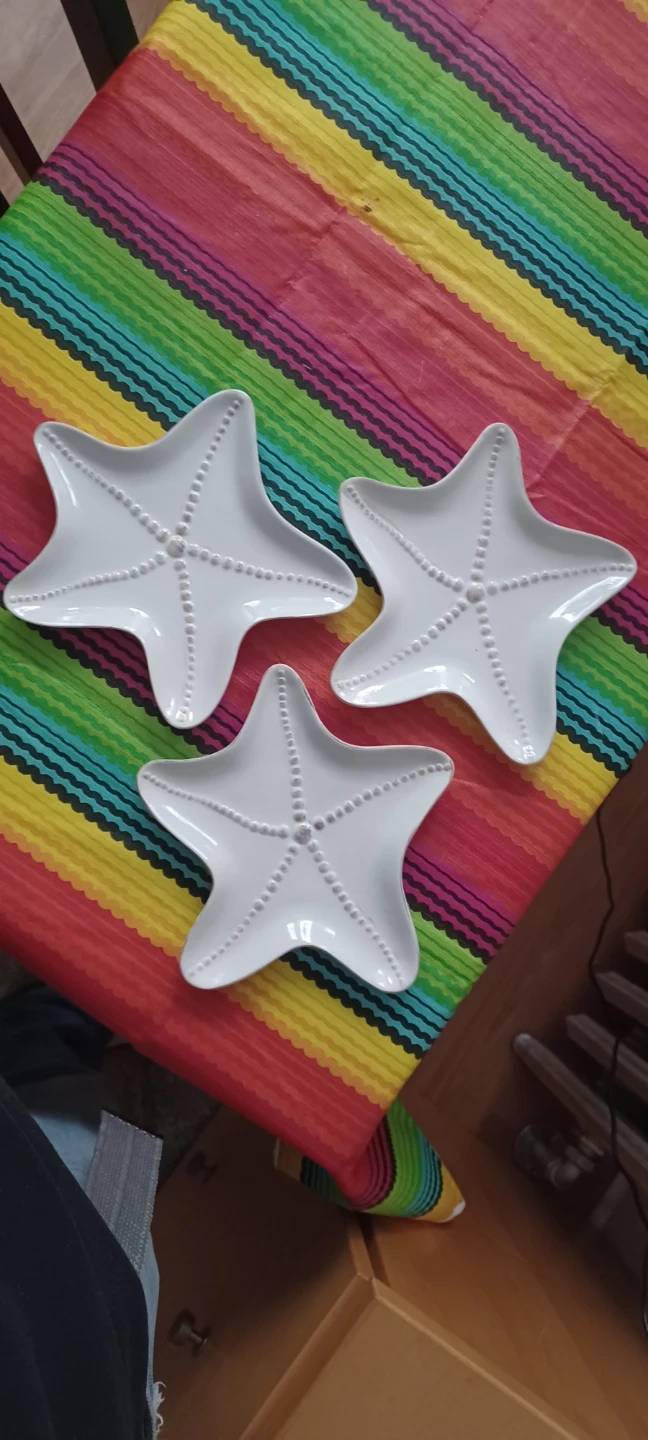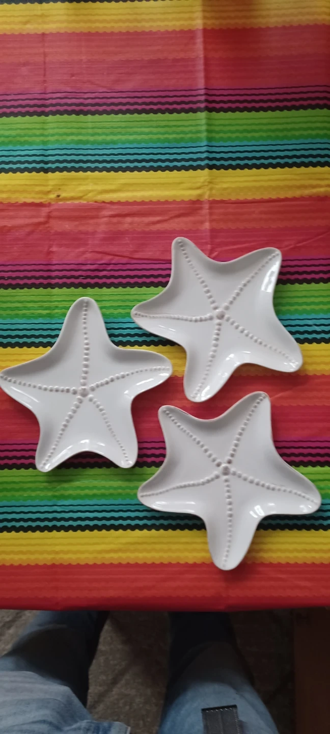 Set of 3 white ceramic plates shaped like starfish. Each plate features a beaded rim and center detail. Dishwasher and microwave safe. Great for appetizers or small snacks!