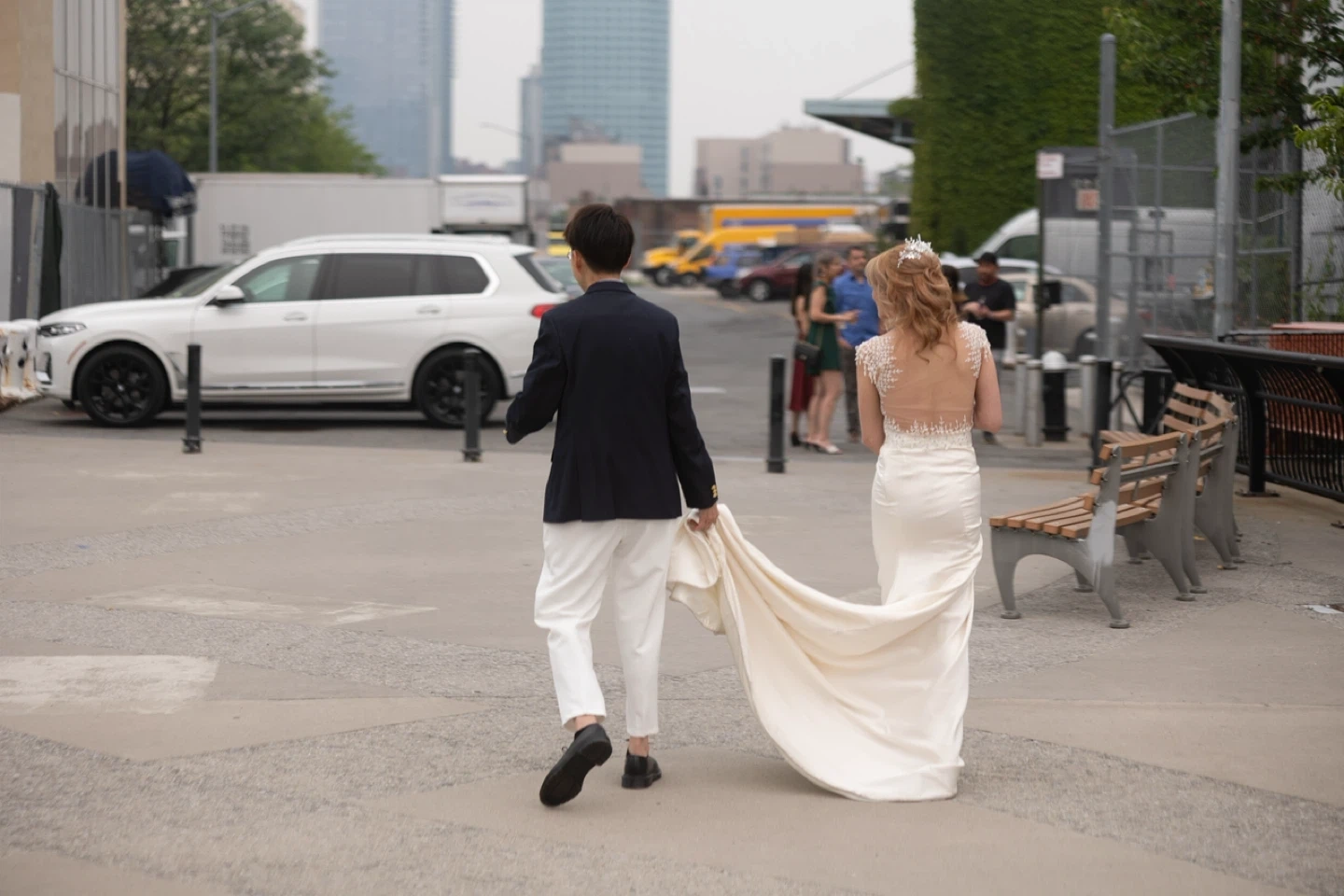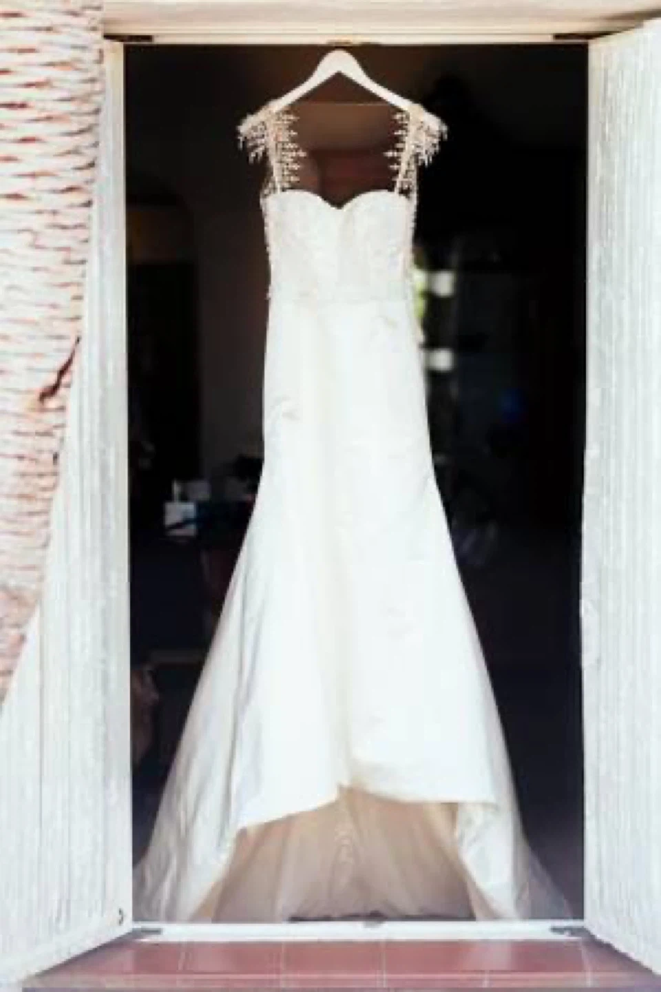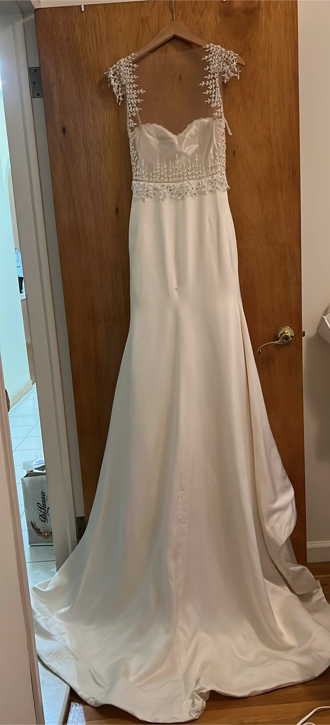 Dress features a long rounded train with "horsehair hem"-The gown features a side zip and strap "snap" button on theleft strap-Worn once for a wedding and organically dry cleaned three times.