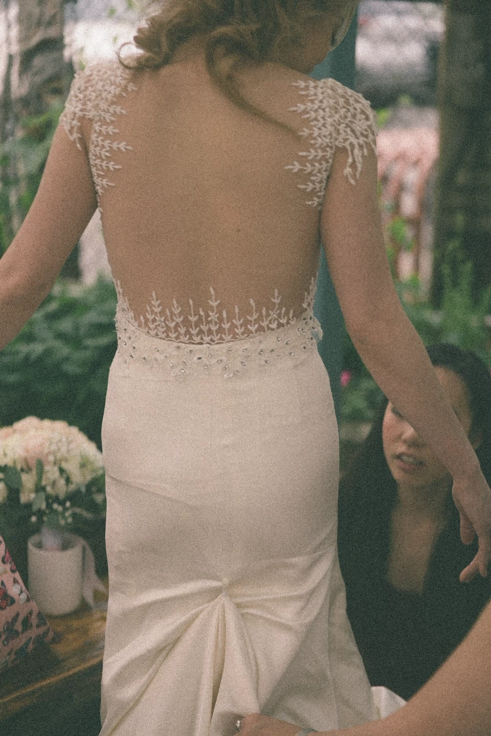Street size 0-32" bust, 25" waist-Trumpet style ivory-colored duchess satin beaded gown withsweetheart neckline and beaded "invisible" cap sleeves.-Hemmed for 5'3" but with 3.5 inch heels=5'6.5"-Custom beaded bodice with intricate leaf-design back beadingand cap sleeves-Features dramatic ivory beads and baby crystals that rightbelow the waist. Patterns include small doilies,flowers,andleaves.-Cap sleeves are made of "invisible" nude netting with anintricate "hanging vine" beading design that hang off theshoulder.-Back details include a bare-back look made of nude nettingoutlined with a leafy vine beaded design that is inspired by theGalia Lahav "Gisele" gown.-