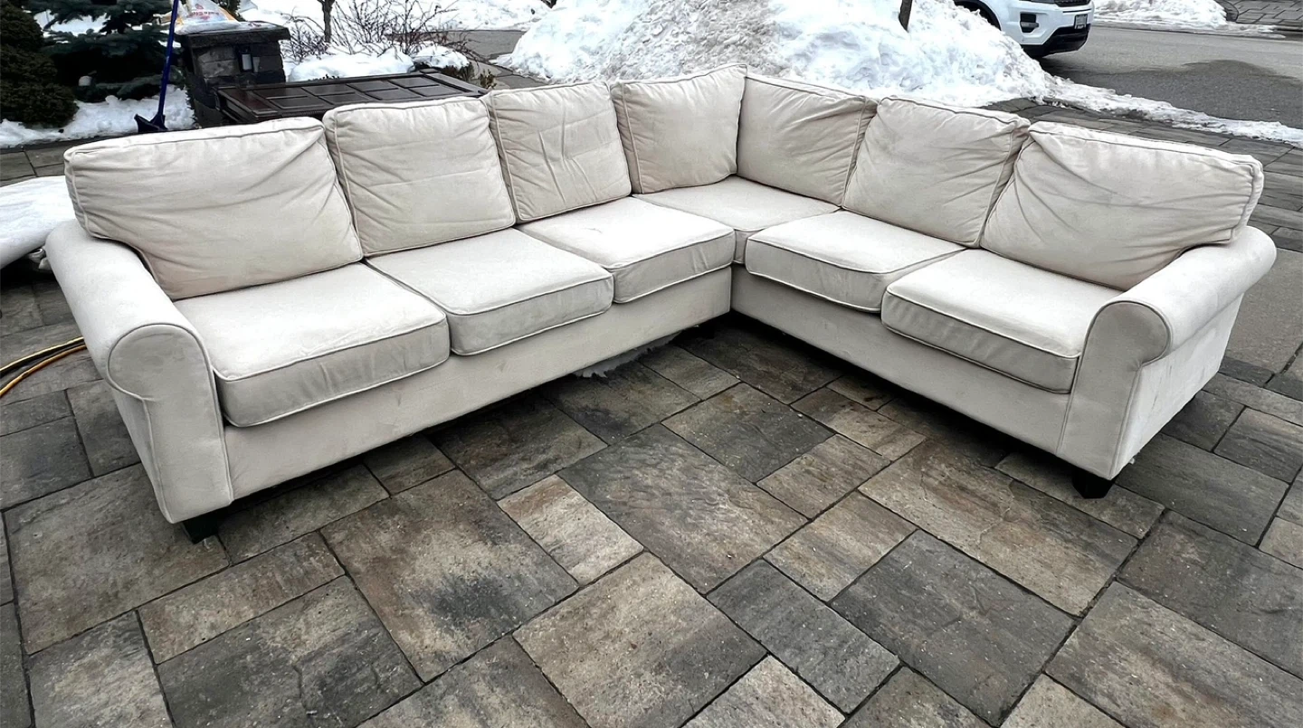 Comfortable sectional sofa in a light beige fabric. It has plush cushions and a classic design that fits well in most living spaces. This sofa offers ample seating for family and guests.