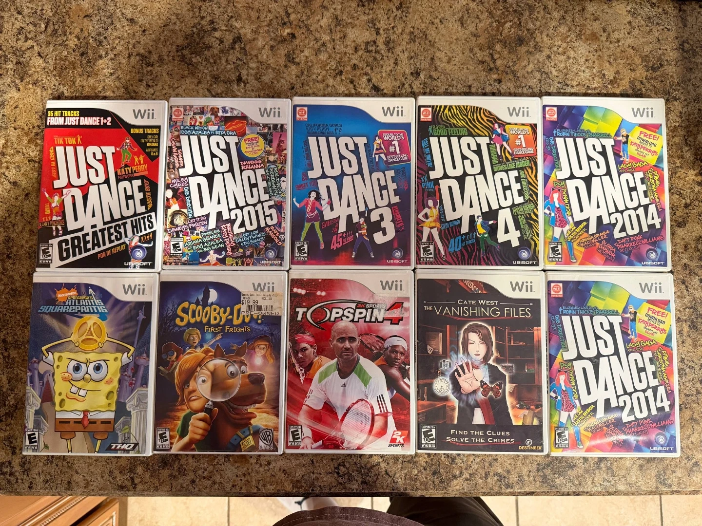 This is a bundle of Wii video games, including Just Dance Greatest Hits, Just Dance 2014, Just Dance 2015, Just Dance 3, and Just Dance 4. It also includes SpongeBob Atlantis SquarePantis, Scooby-Doo First Frights, Top Spin 4, and The Vanishing Files. These are all for the Nintendo Wii console.