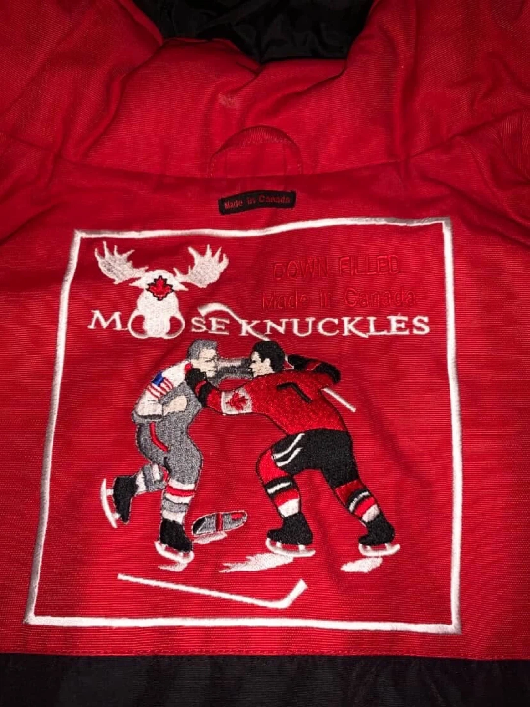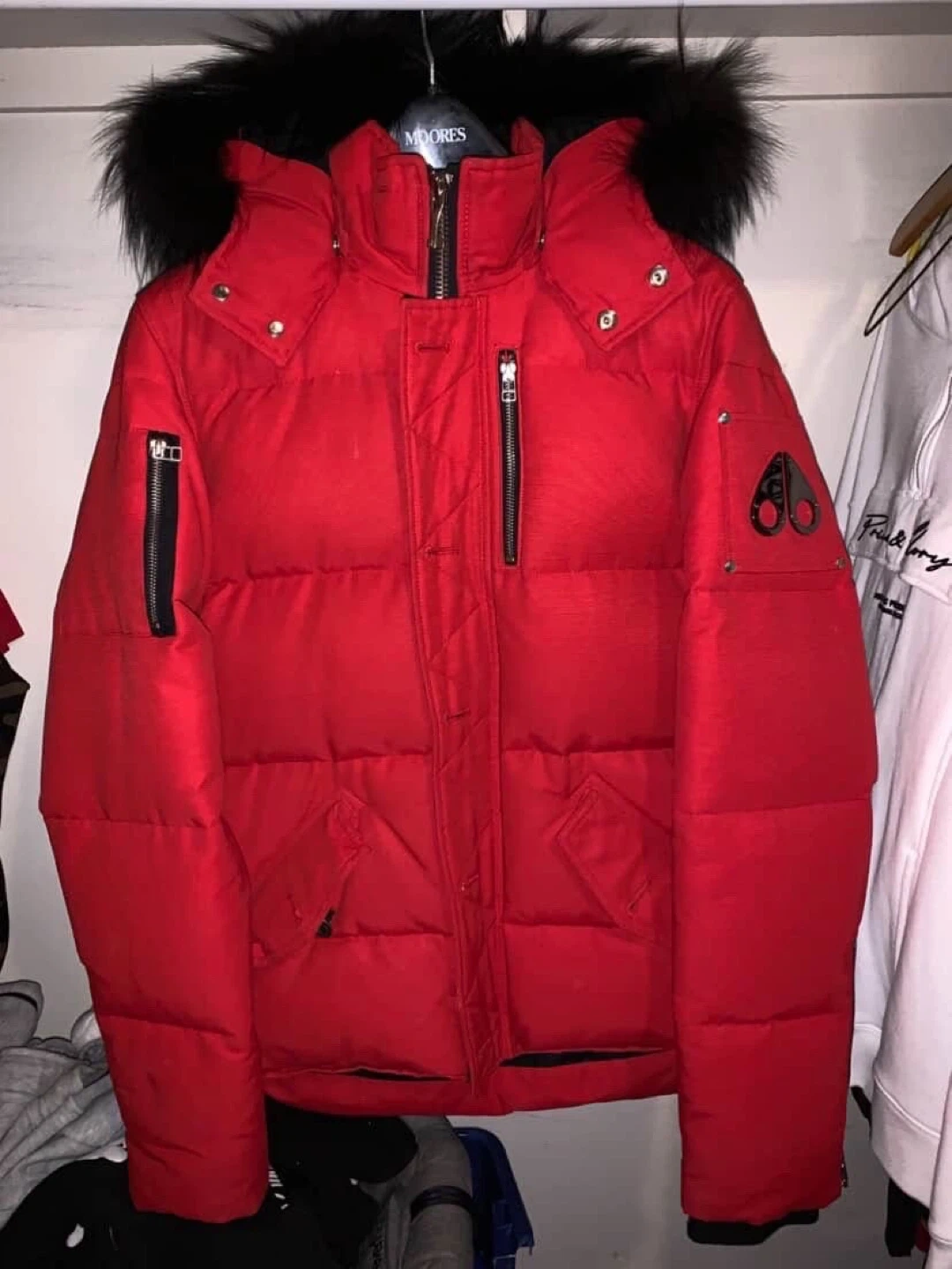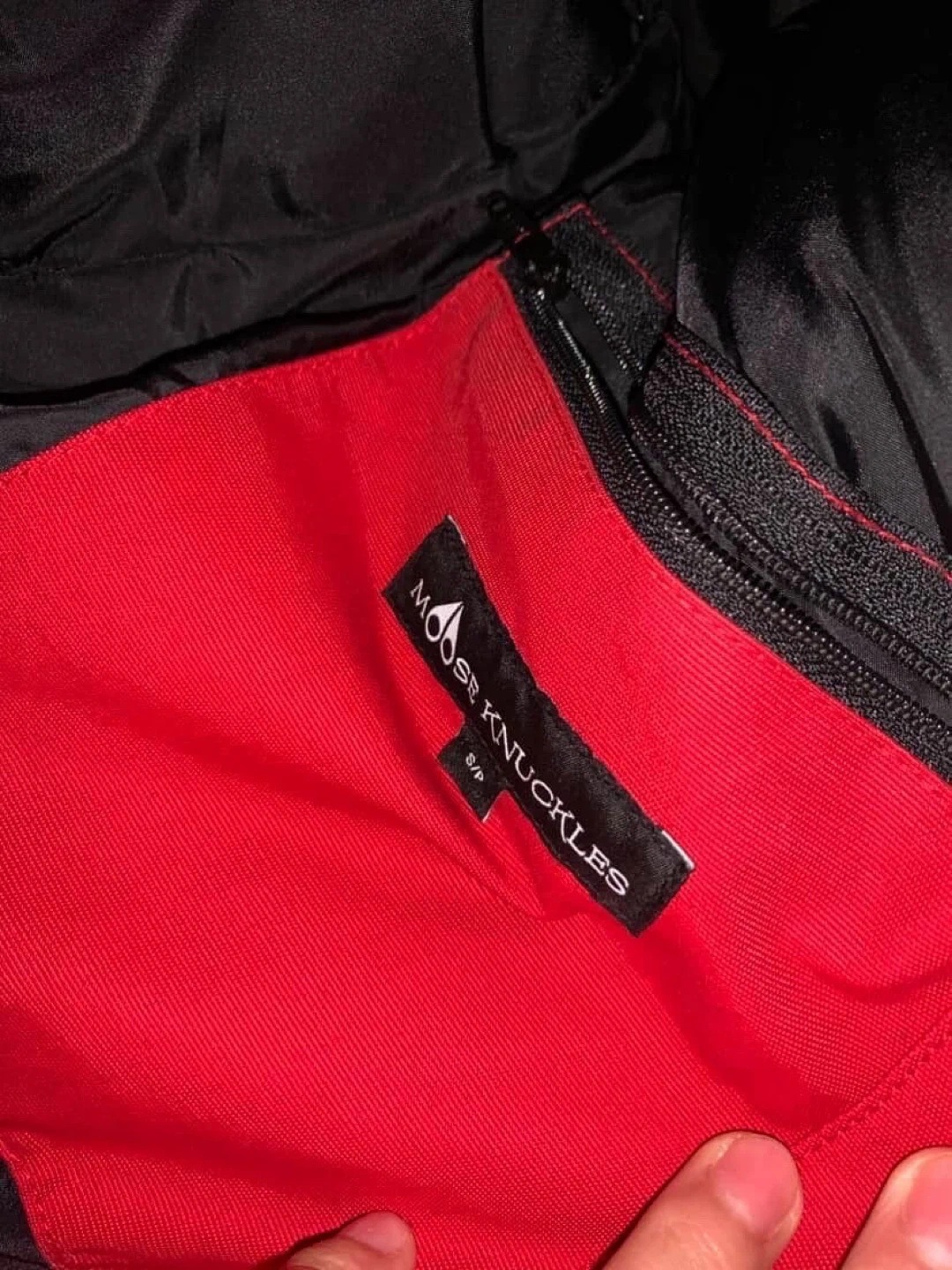 This Moose Knuckles jacket is down filled and made in Canada. It features a fur-lined hood and multiple zippered pockets. The interior label indicates a size S/P.