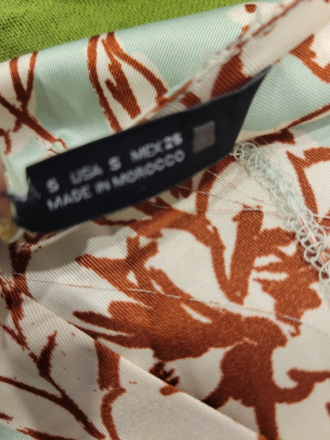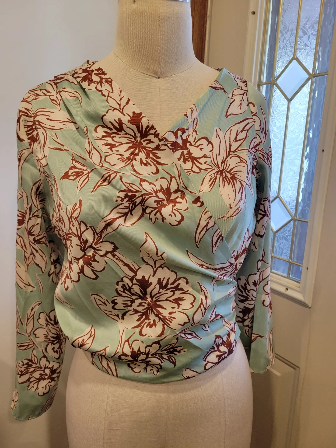 Lightweight mint green blouse with a brown and white floral print. It features a V-neckline and long sleeves. Size S. From a smoke free home meetup location eglinton and dufferin area