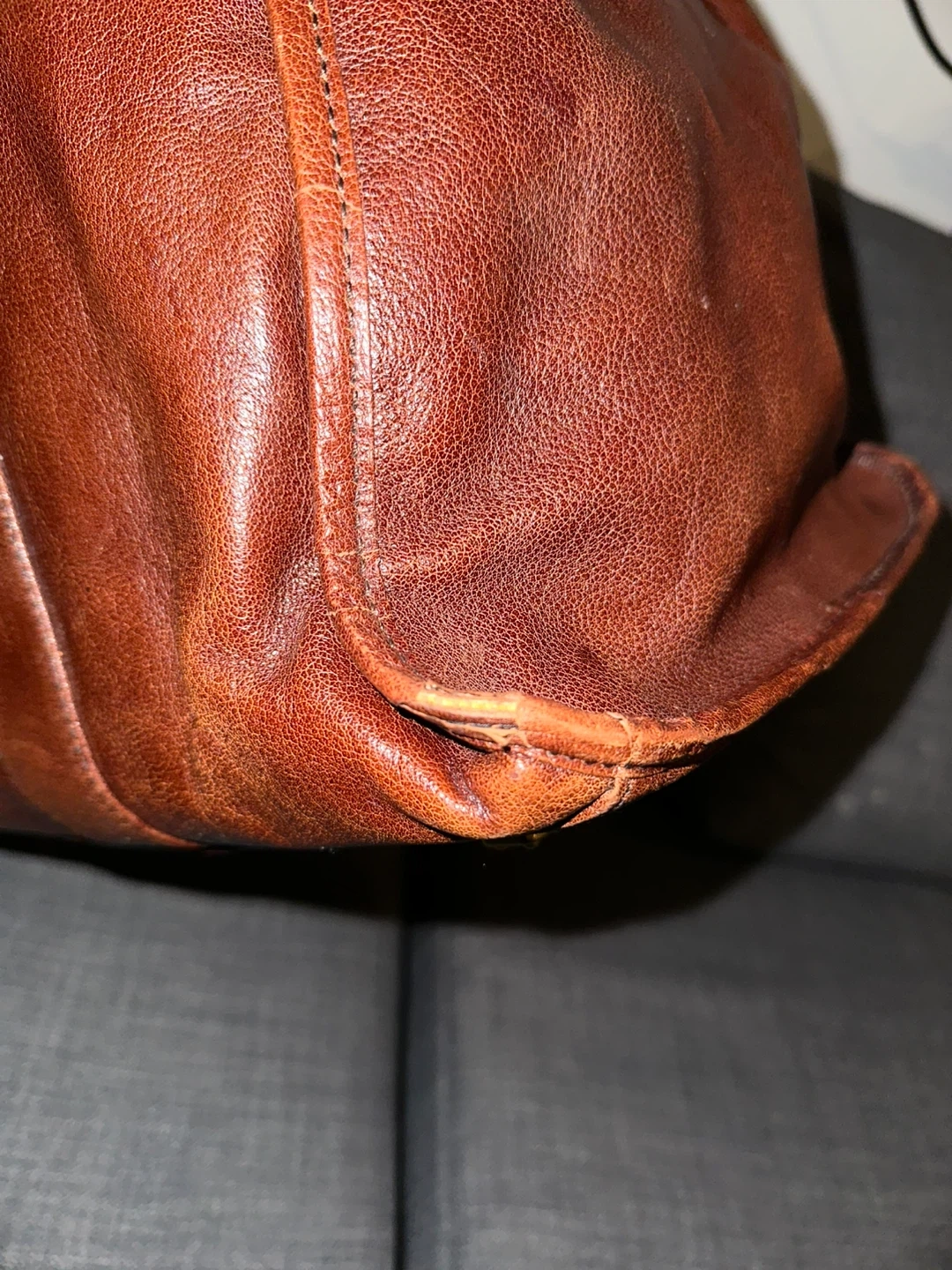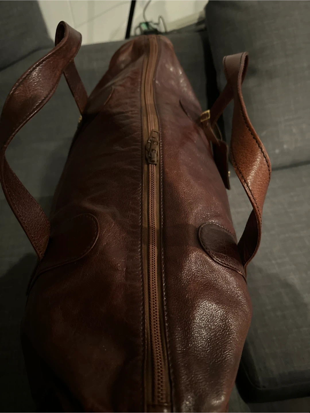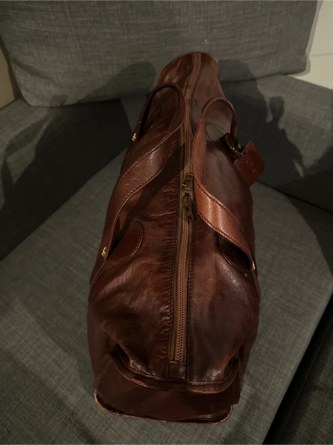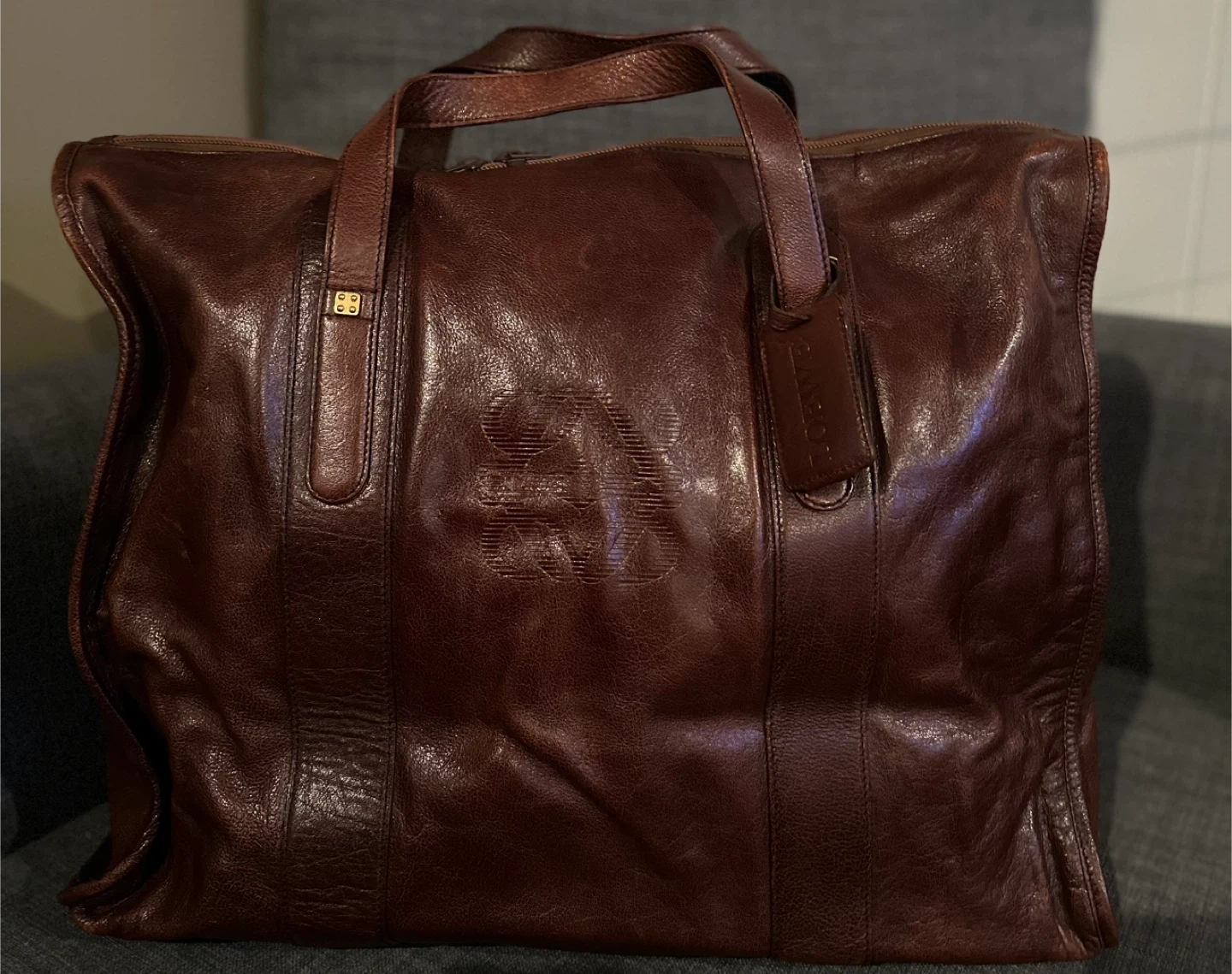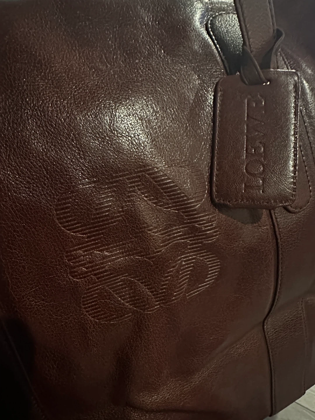 Brown leather duffle bag with embossed logo. Some scuffs on bottom corners. It's a stylish piece for weekend getaways!