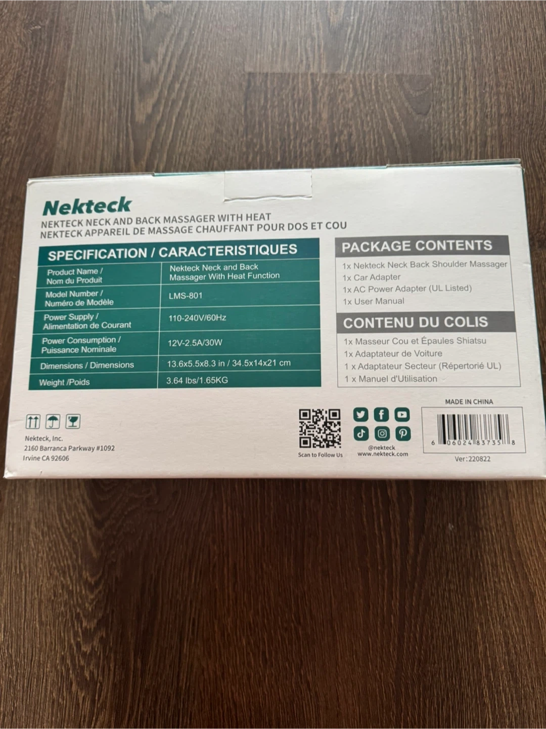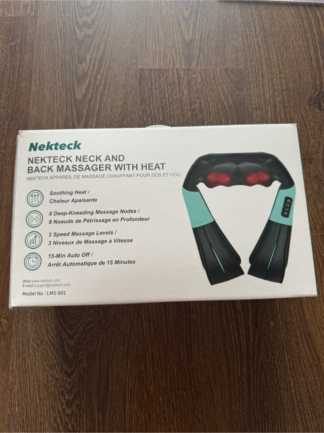 Nekteck neck and back massager with heat function. It features 8 deep-kneading massage nodes and 3 speed levels. It has a 15-minute auto-off timer. This would be useful for relieving muscle tension after a long day. Opened but never used