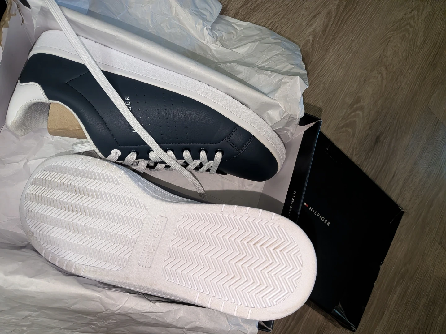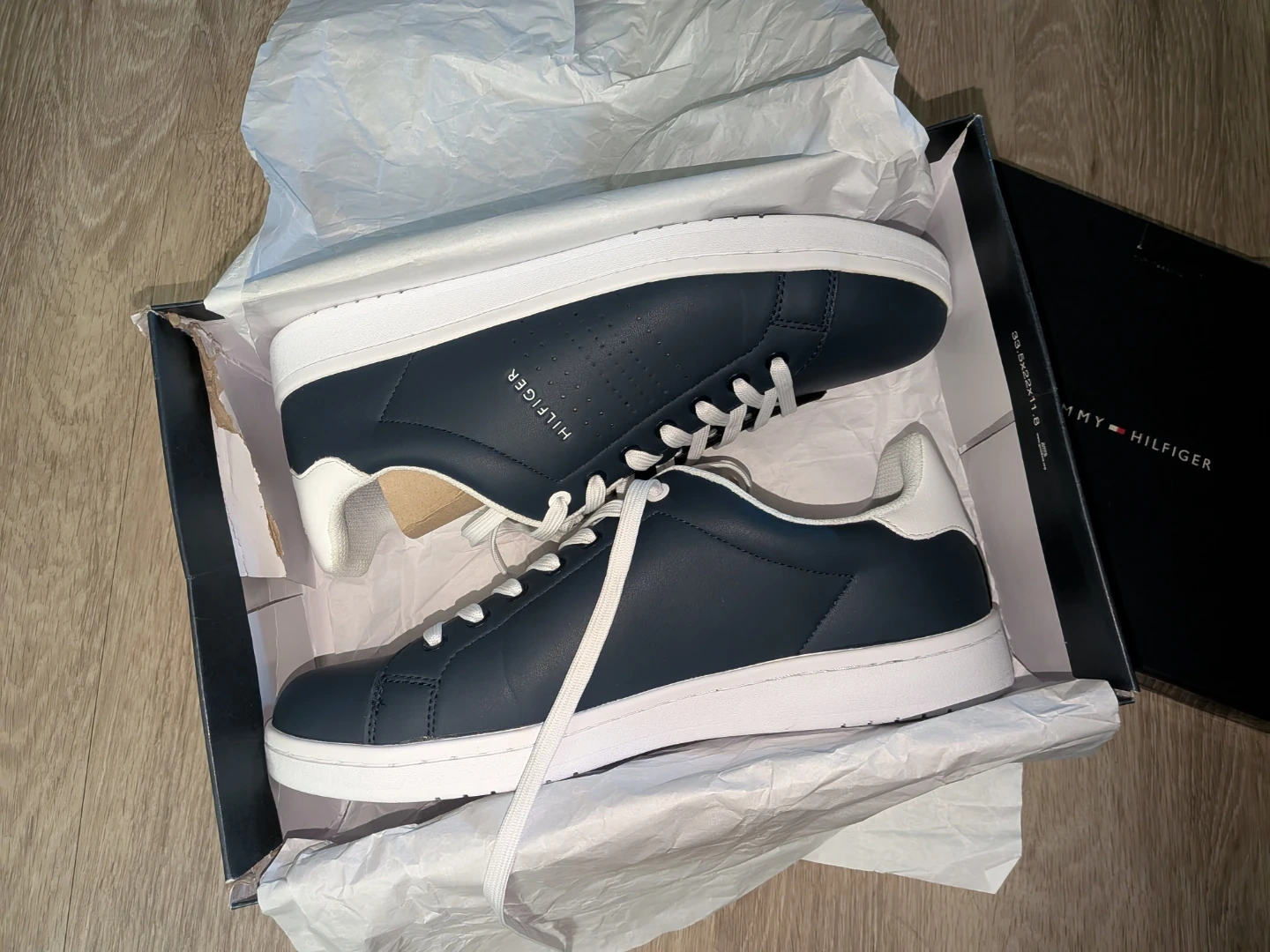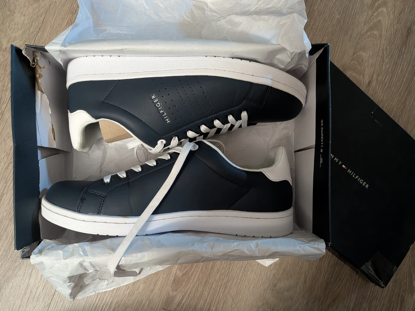 These are Tommy Hilfiger sneakers in a classic navy colour. They're complete with white laces and soles, and come in the original box. A sharp addition for casual wear!