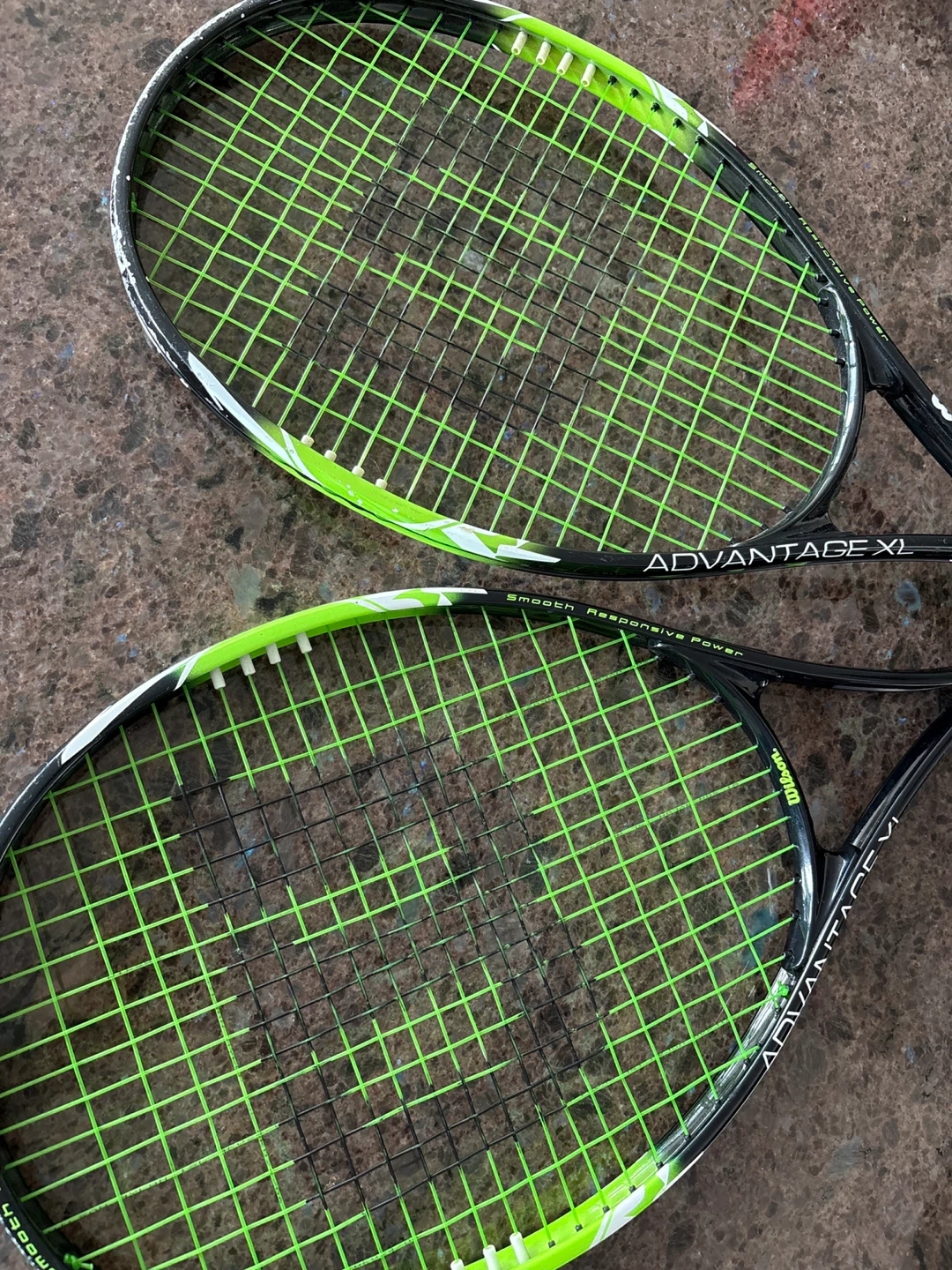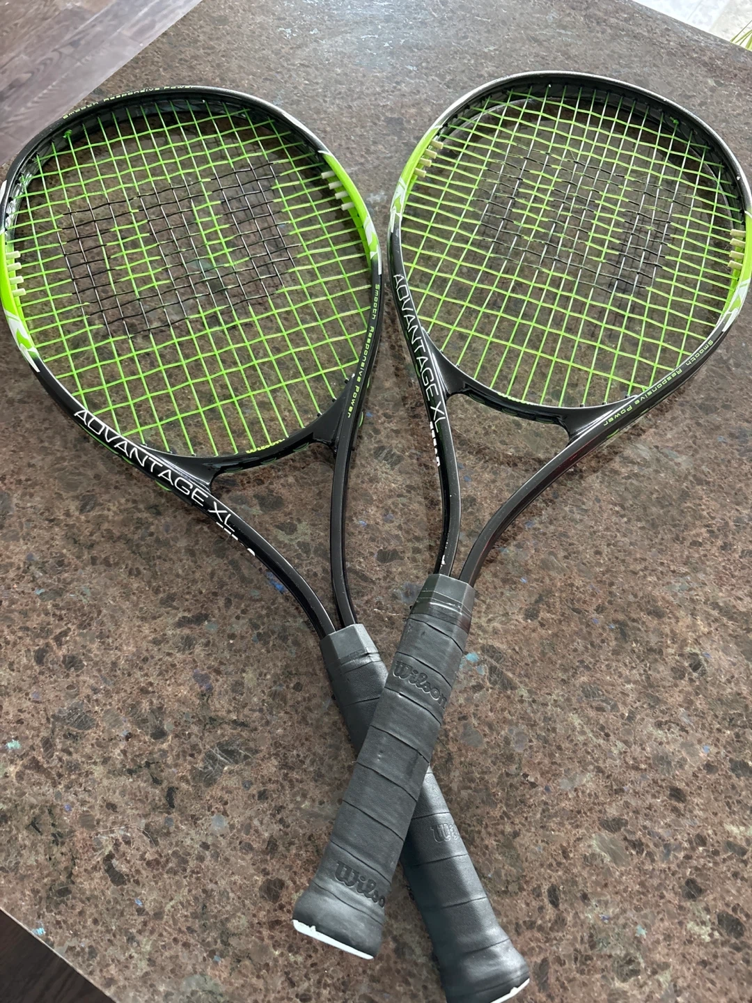 Two Wilson Advantage XL tennis racquets, used but in good condition (one has more scratch marks) - Black frames with green strings and accents. Ready for the court and super confortable!