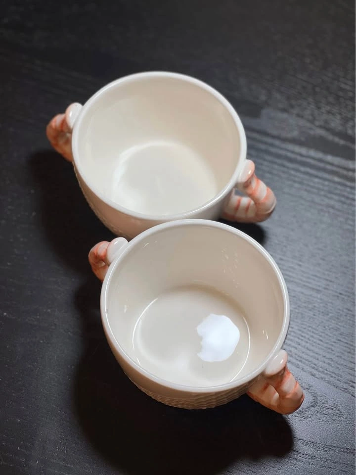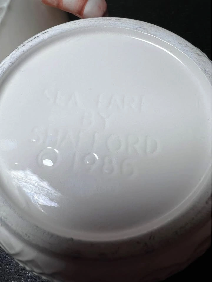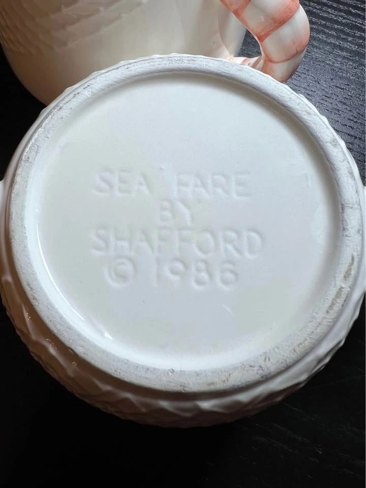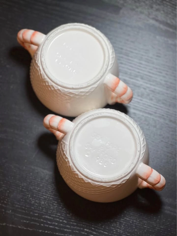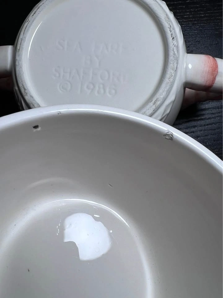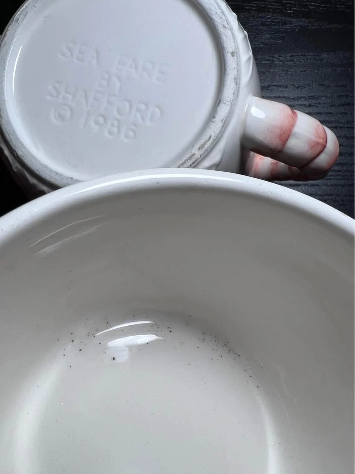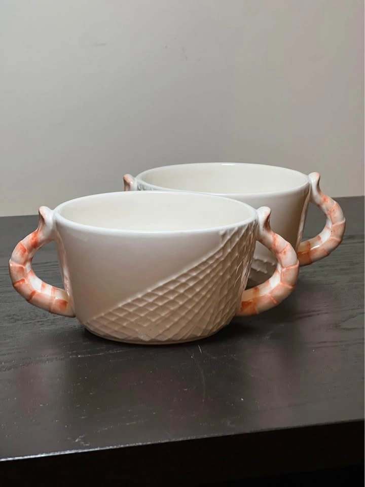 98Shafford Sea Fare shrimp tail bowls are vintage porcelain soup bowls from the 1980s. These collectible items feature distinctive pink trompe l'œil shrimp tail handles and a white body with a subtle fishing net or basketweave pattern. Brand/Collection: Shafford Sea Fare. Material: Ceramic or porcelain. Origin: Made in Japan. Year: 1986. Features: Hand-painted, double-handled design with shrimp tails. Capacity: Each bowl holds approximately 12 ounces. Some imperfections as seen in photos. Sold as is