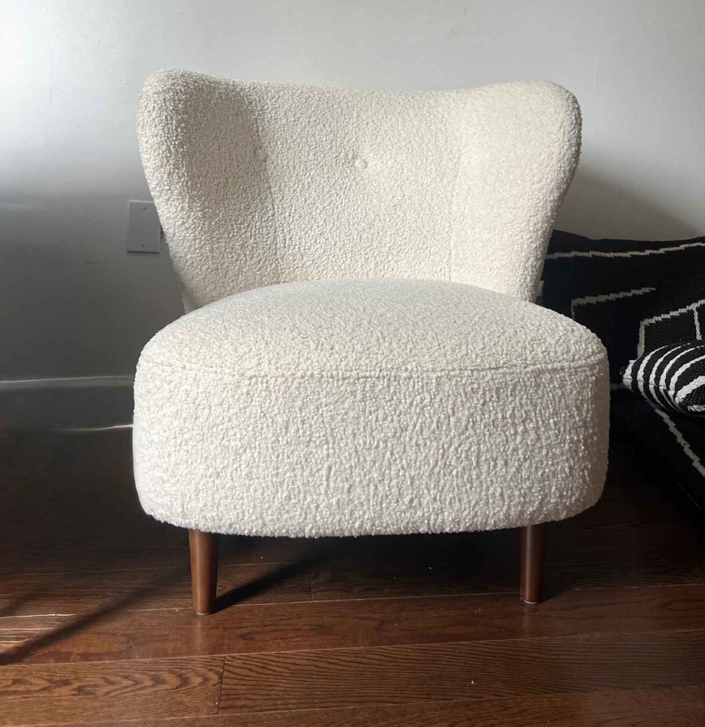 A cozy cream boucle accent chair is up for grabs! It's in great condition and ready to add a touch of warmth to any room. The soft boucle texture and elegant design make it a perfect addition to your home decor