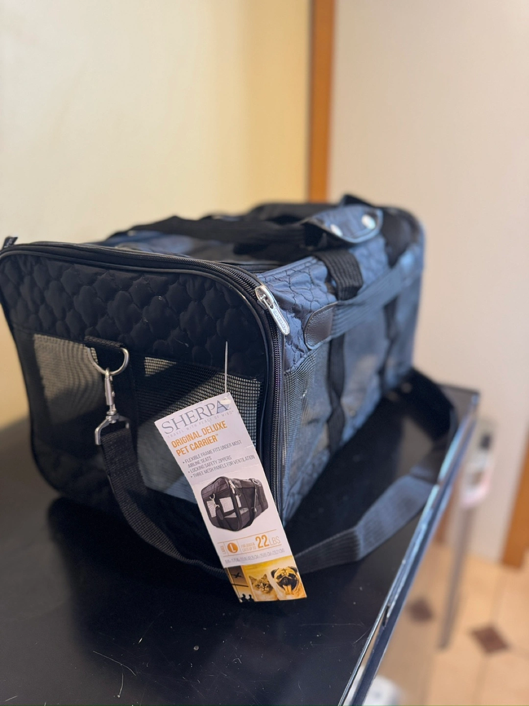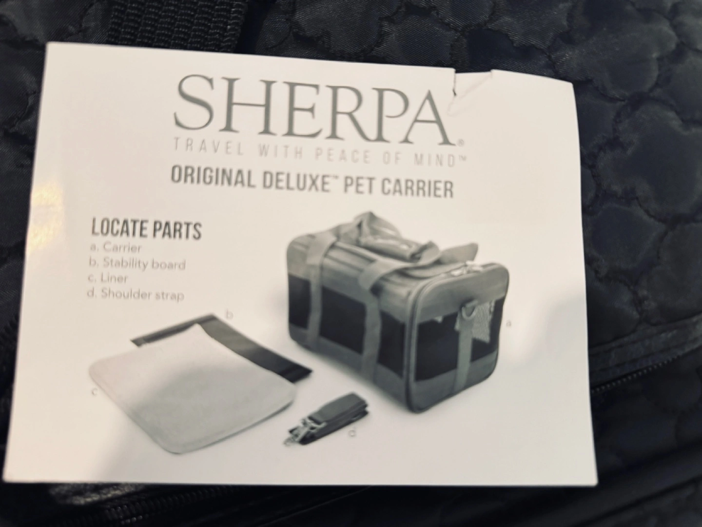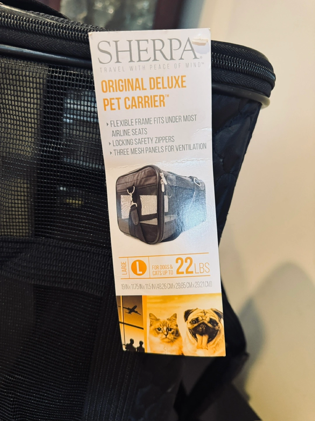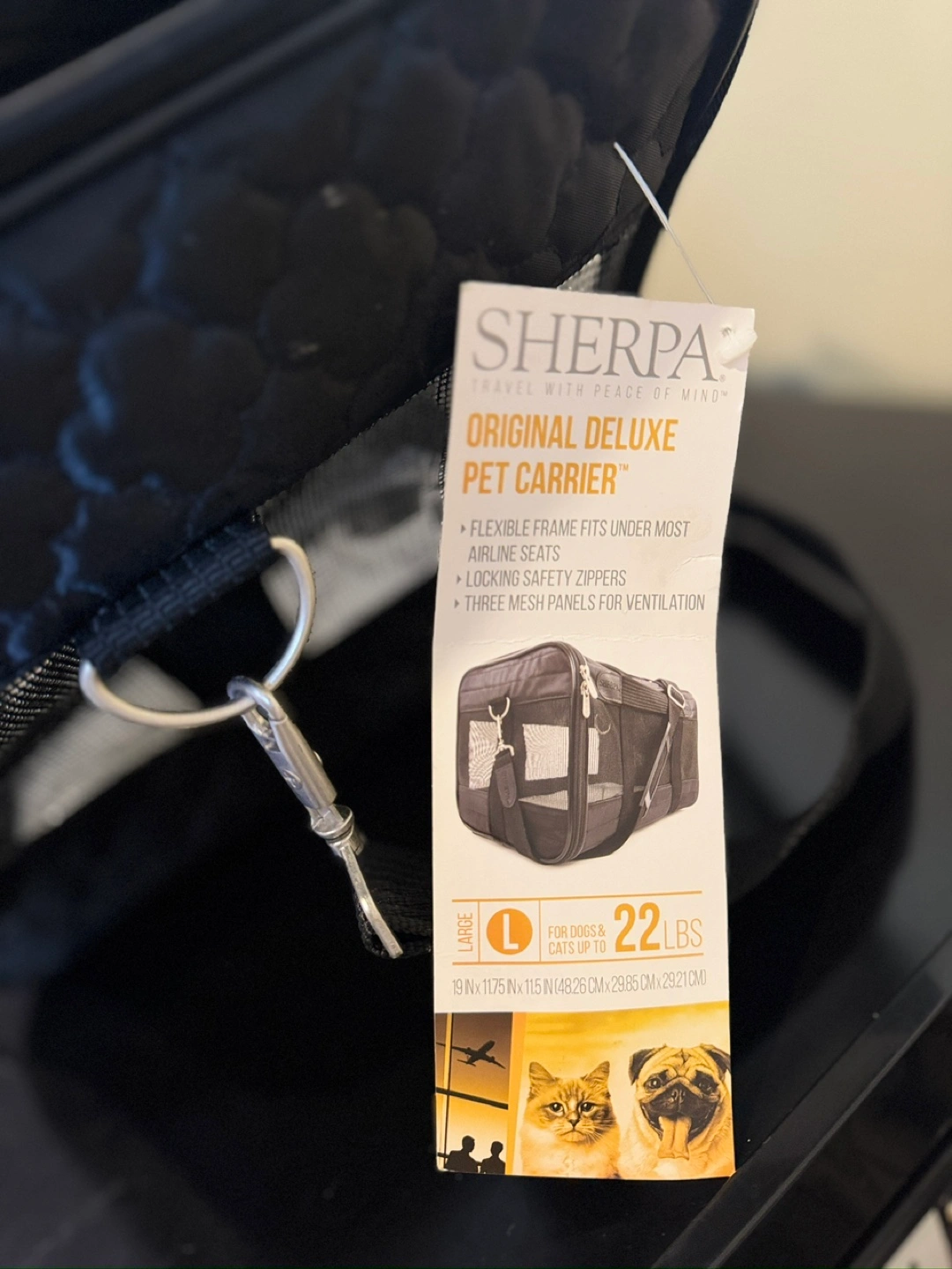 Selling a SHERPA Original Deluxe Pet Carrier in Large size! It's black and can hold pets up to 22 lbs. The carrier includes: - Carrier - Stability board - Liner - Shoulder strap It also features flexible frame, locking safety zippers, and three mesh panels for ventilation