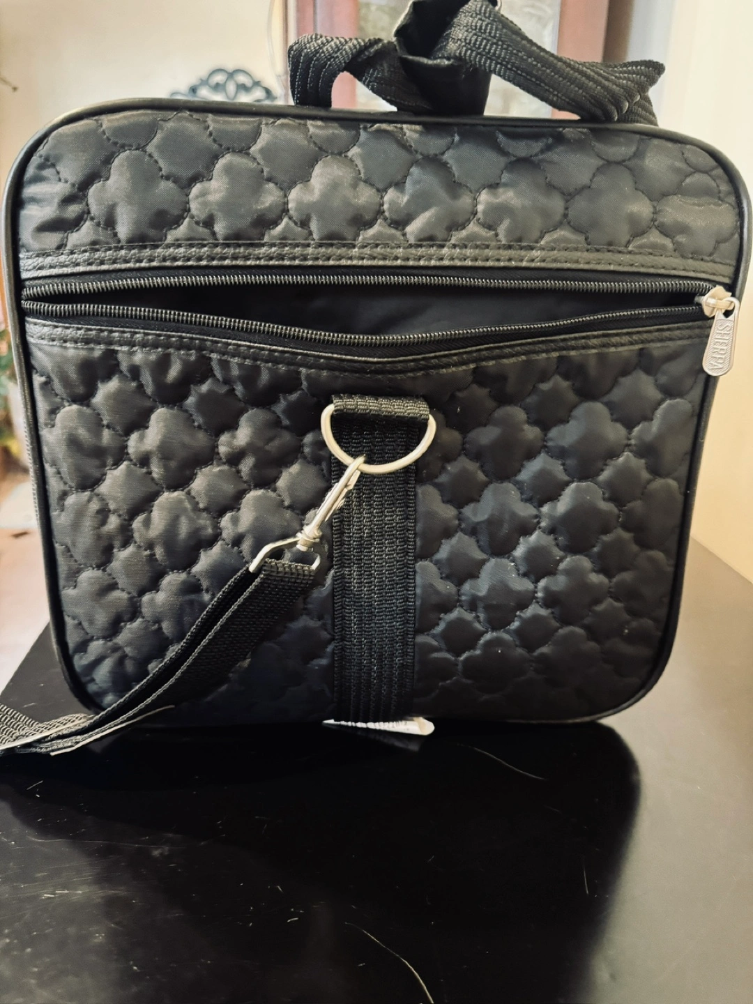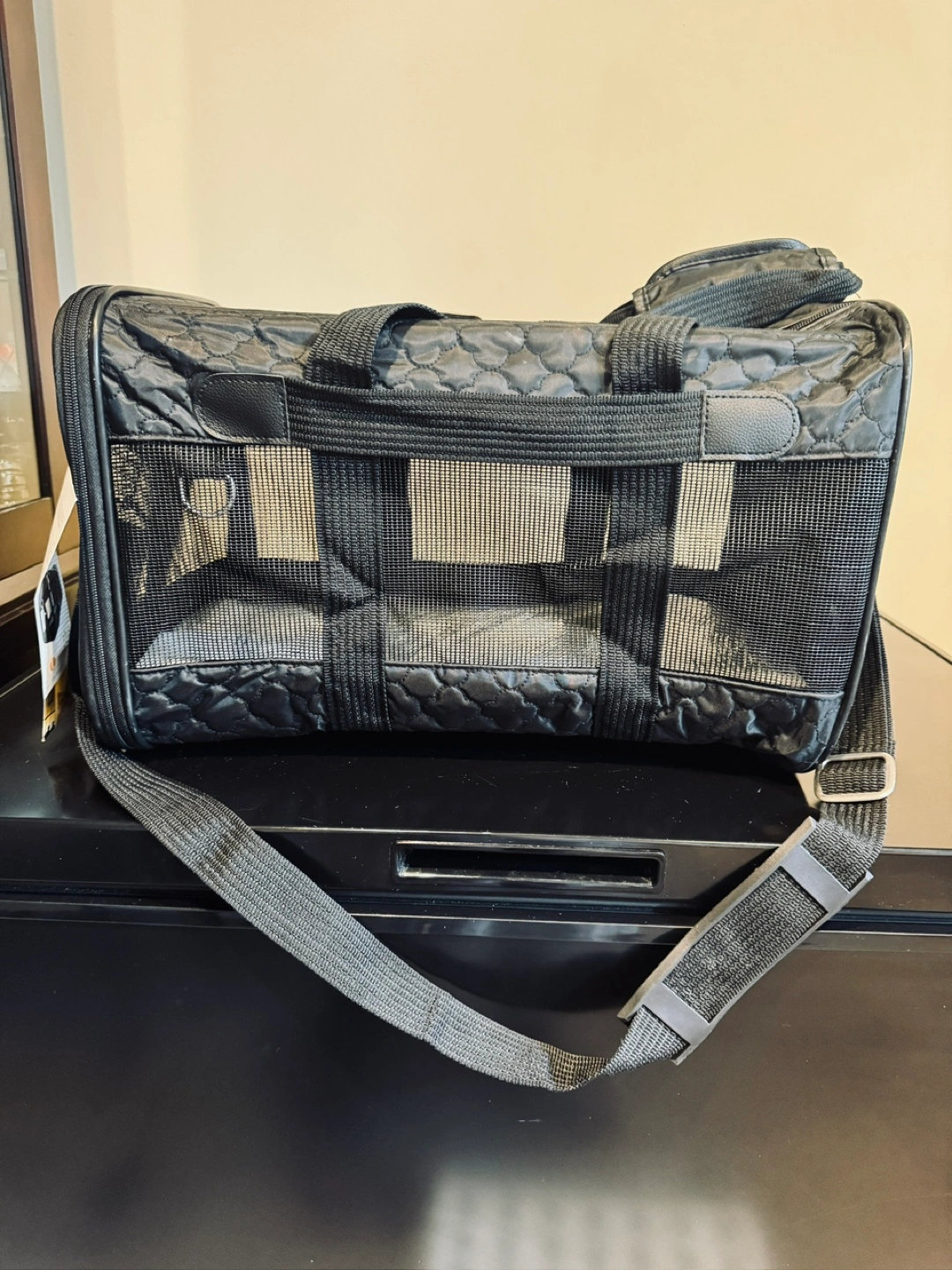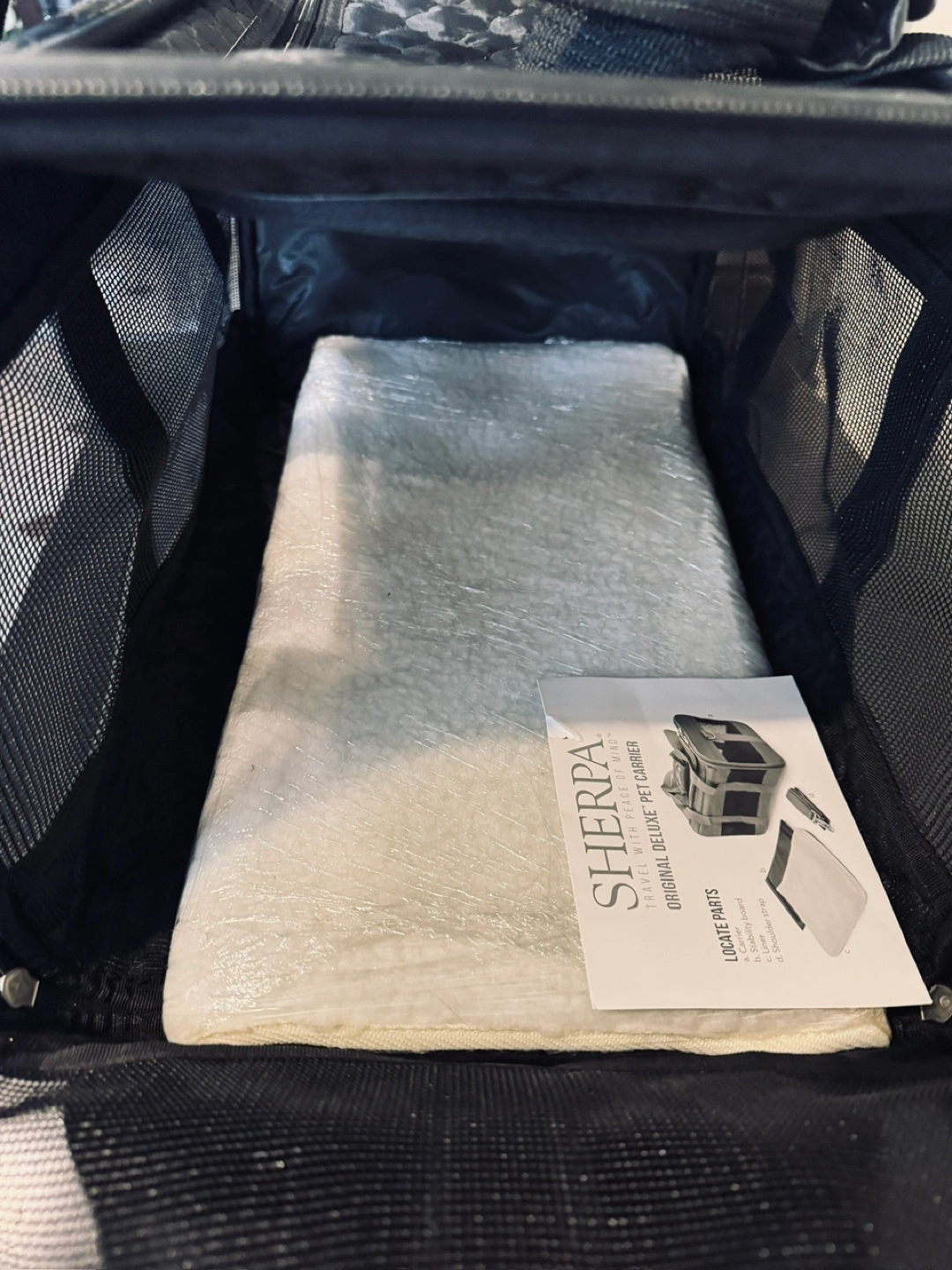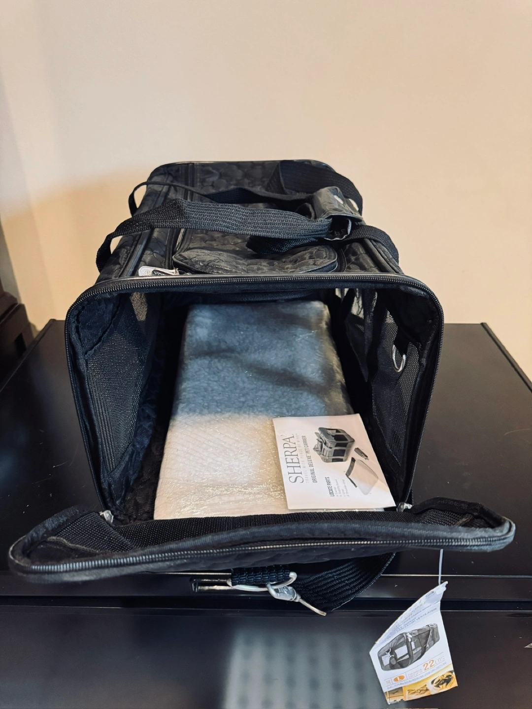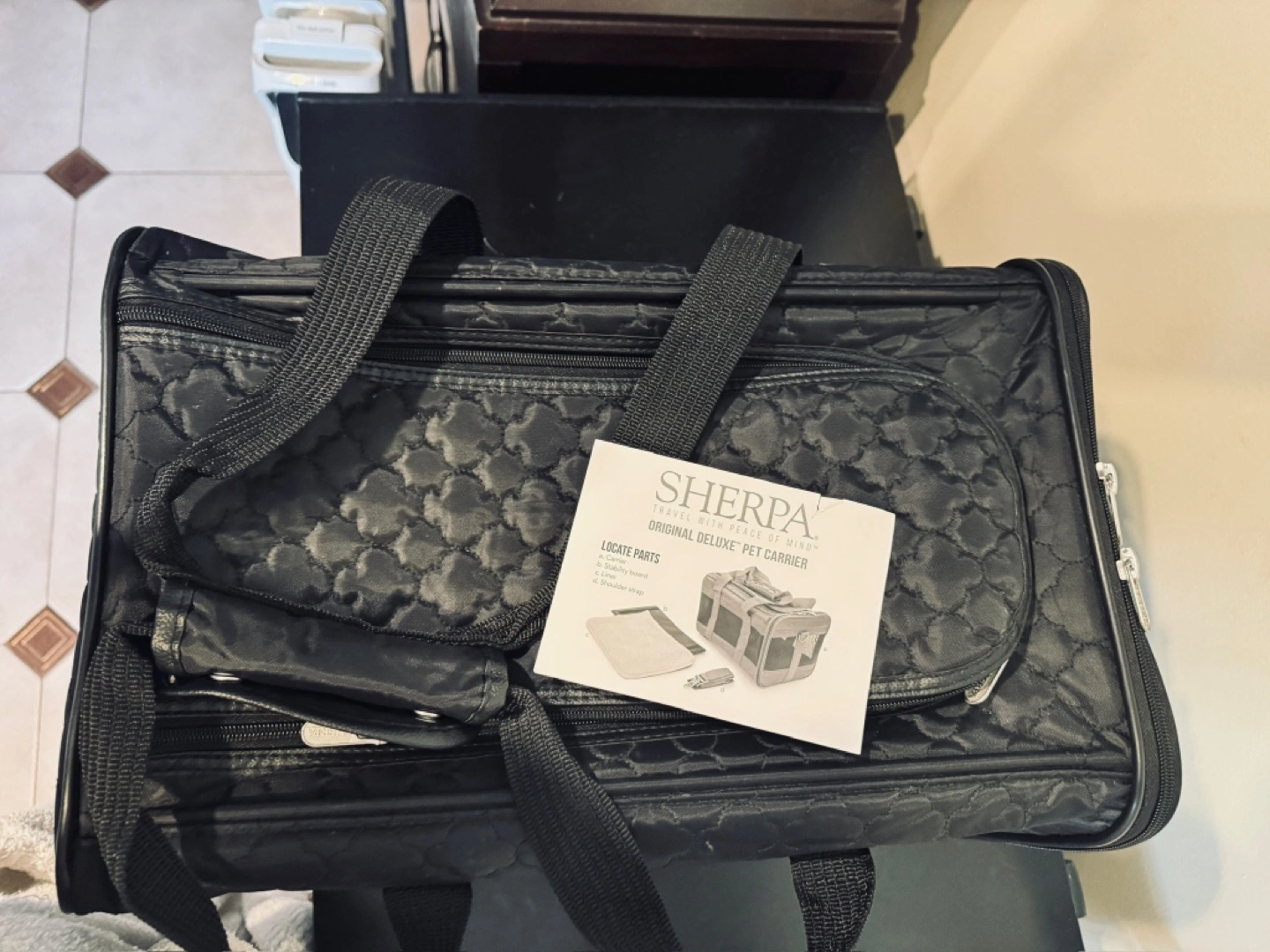 Selling a SHERPA Original Deluxe Pet Carrier in Large size! It's black and can hold pets up to 22 lbs. The carrier includes: - Carrier - Stability board - Liner - Shoulder strap It also features flexible frame, locking safety zippers, and three mesh panels for ventilation