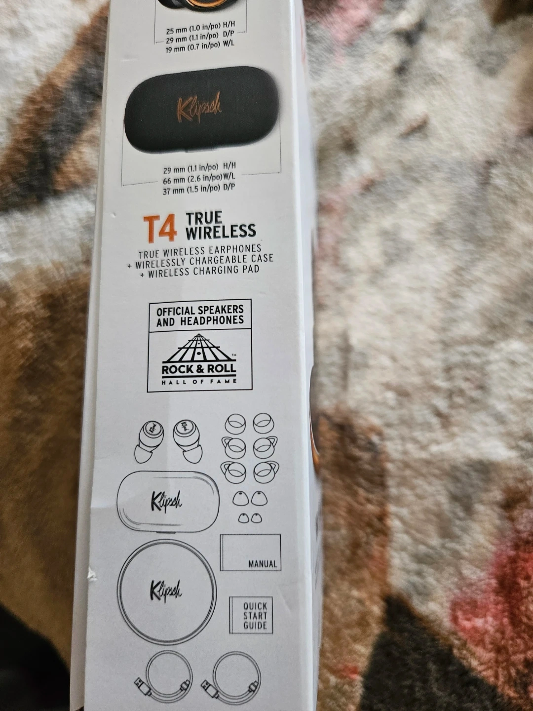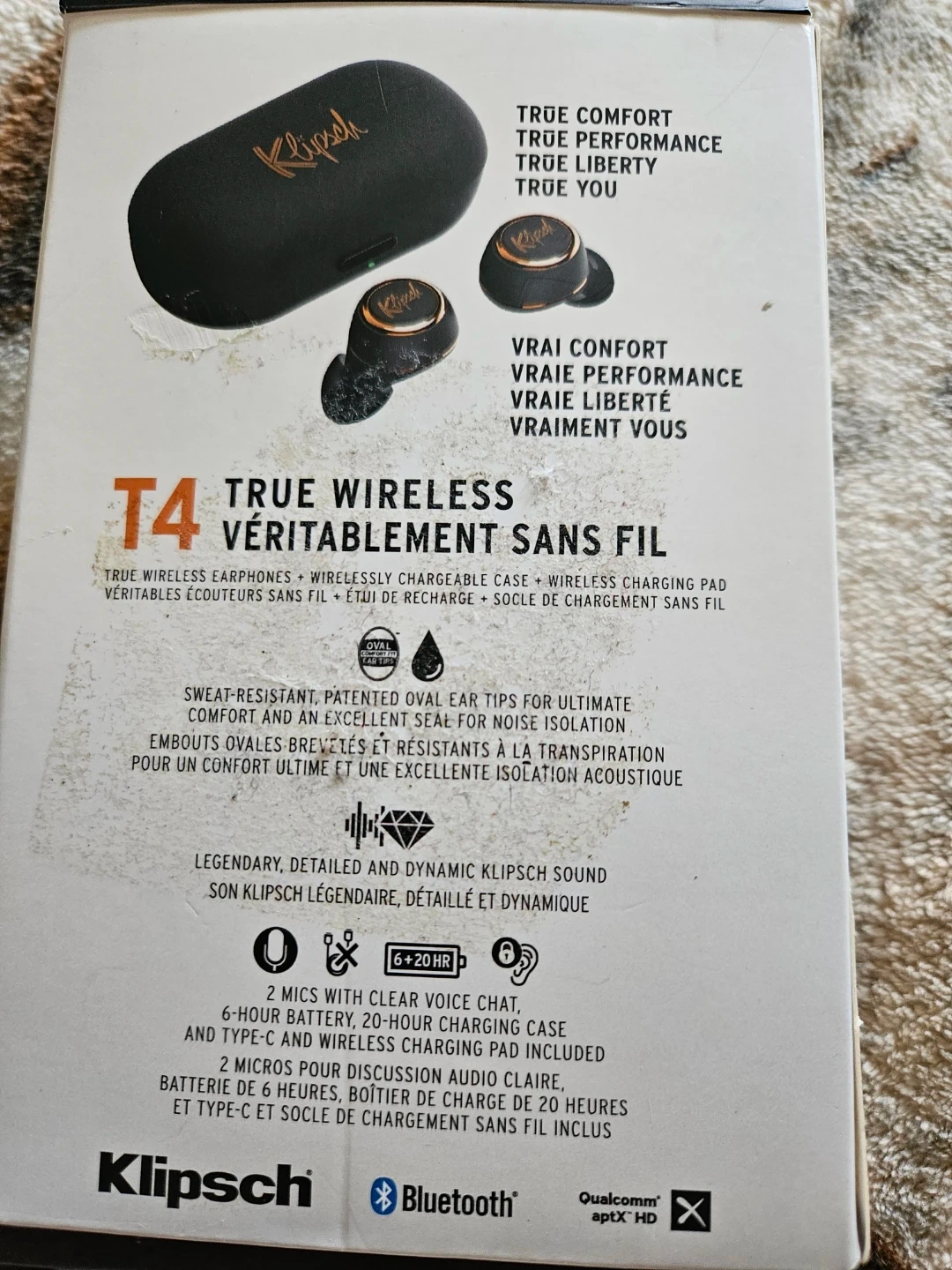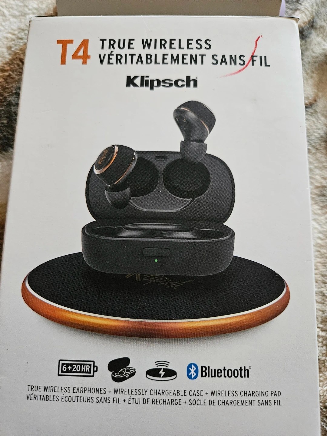 Klipsch T4 true wireless earbuds are included with a wirelessly chargeable case and charging pad. They offer 6+20 hours of battery life with clear voice chat. These earbuds feature sweat-resistant, patented oval ear tips for comfort and an excellent seal for noise isolation. Legendary, detailed, and dynamic Klipsch sound.