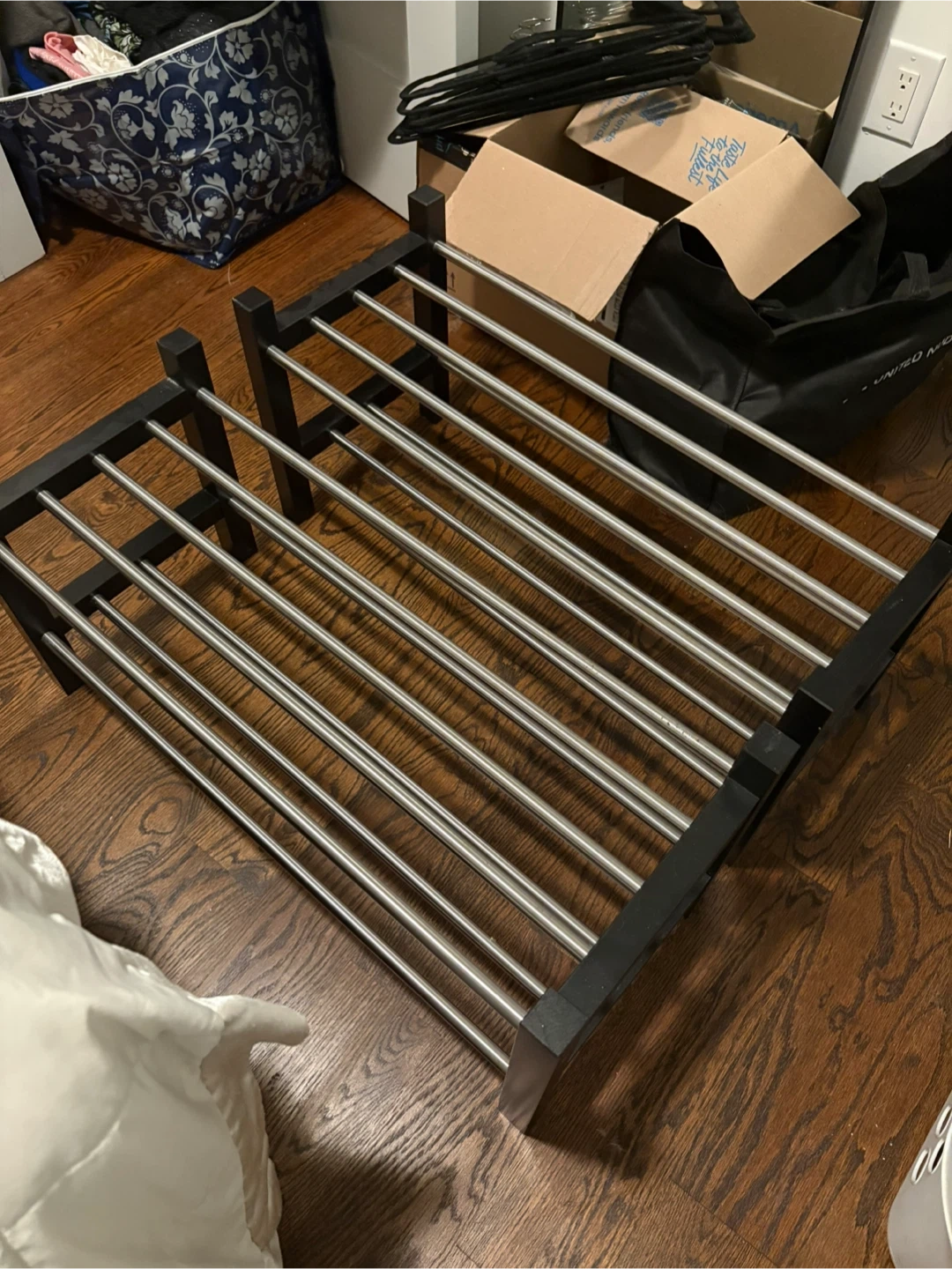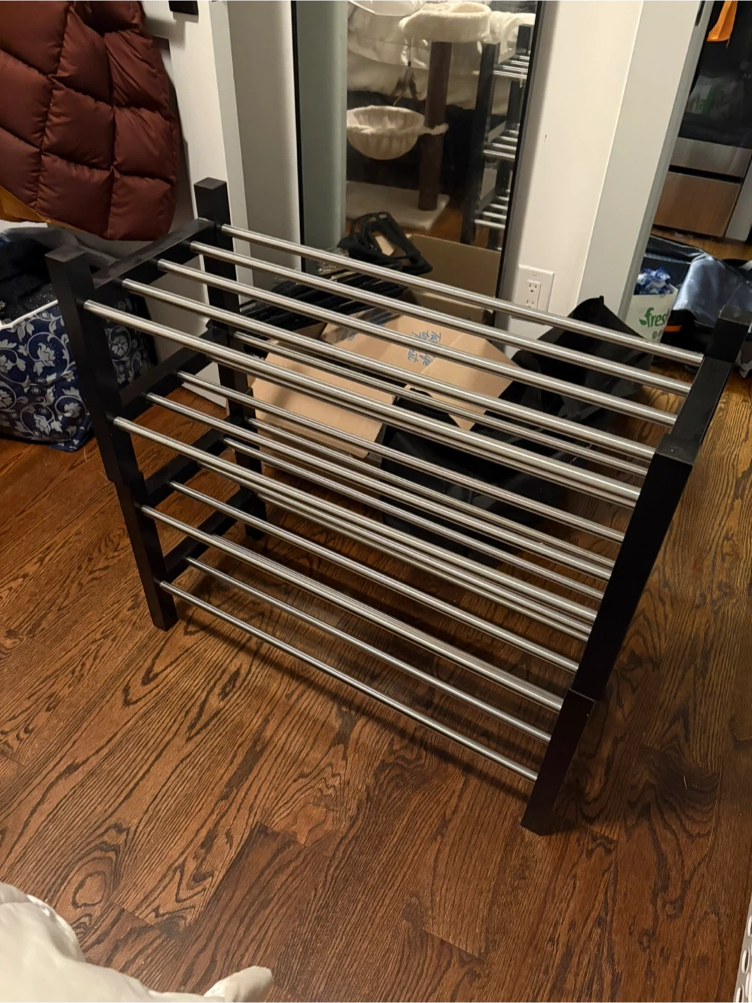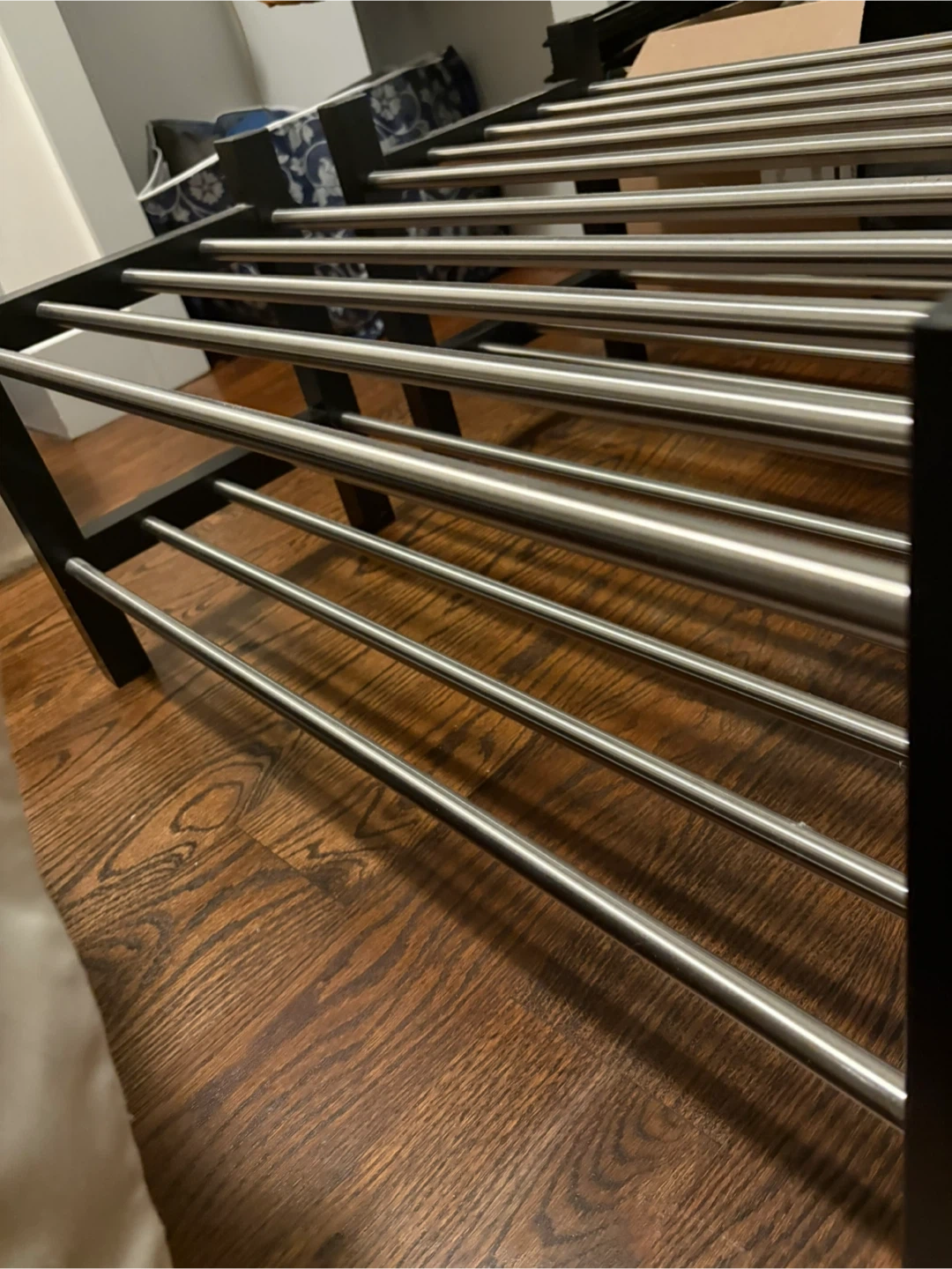 This is a shoe rack organizer. It's in great condition and ready to help you keep your shoes tidy and accessible. It has a dark brown wood frame and silver metal bars. 2 shown, but 3 are available. Price listed is for 1.