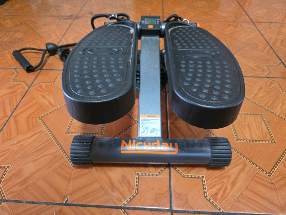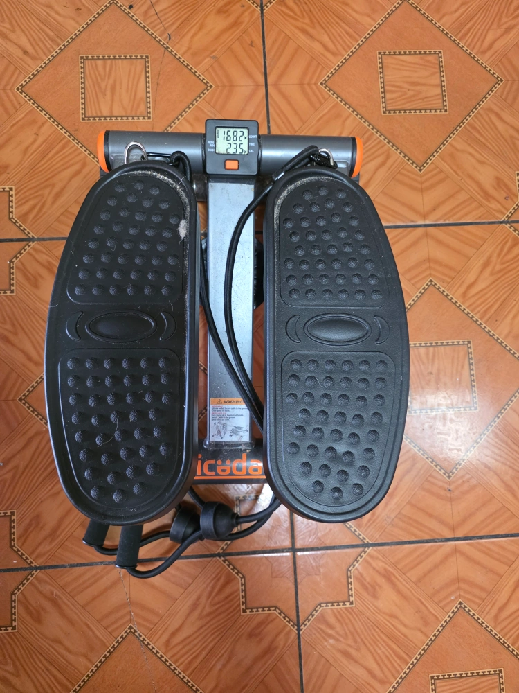 A stepper machine with two foot pedals. Comes with resistance bands. Features a digital display. Provides a great workout right at home, so that you can stay active whenever you like.