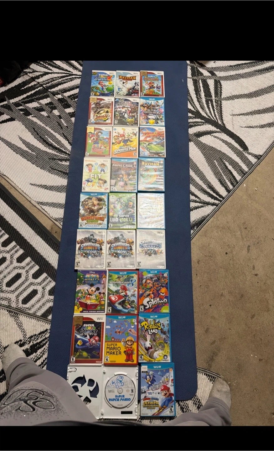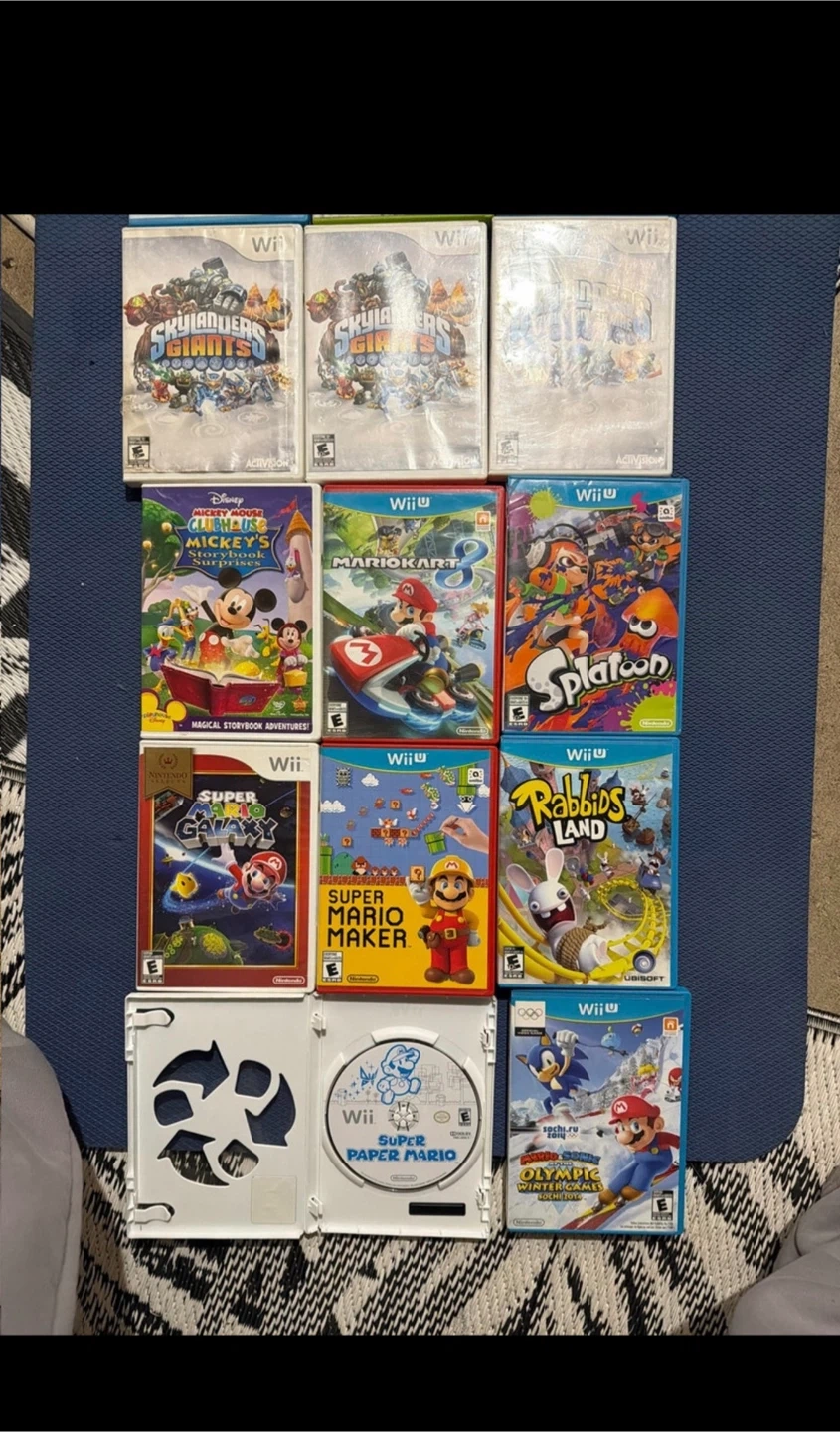 I'm selling my collection of Wii and Wii U games. There are 26 games in total, and they are all in working condition, but are used, of course. It's like a trip down memory lane, but you're the conductor! Here's a selection of the titles included: * Super Mario Galaxy * Rayman Origins * Mario Strikers Charged * Super Smash Bros. Brawl * Minecraft Wii U Edition * Mario Kart 8 * Skylanders I'm looking to sell the whole lot together. Individual game prices vary, but based on Kijiji listings, a median price for the lot would be around $130. Grab these games now. If the ad's still up, they're still available! CASH ONLY pickup only This is a collection of 26 Nintendo Wii and Wii U video games. Games include Super Mario Galaxy, Rayman Legends, Super Smash Bros., Mario Kart 8, Splatoon, and more. All games are for Nintendo Wii or Wii U consoles.