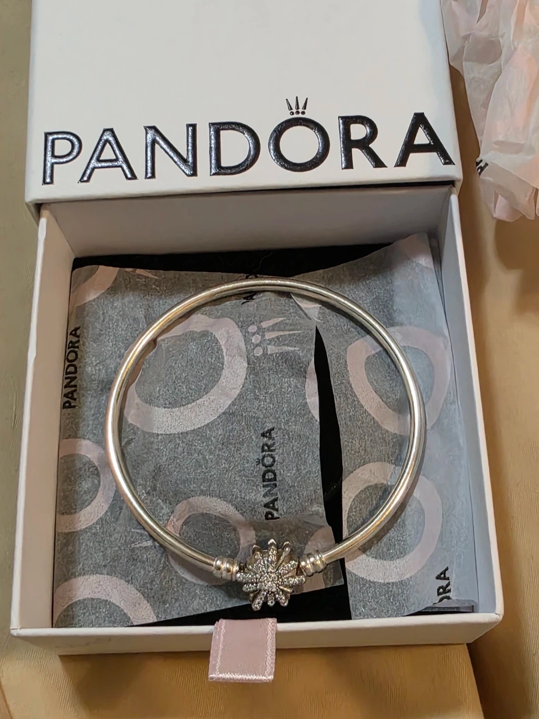 Selling a lovely Pandora bangle bracelet in silver. It features a beautiful snowflake charm. The bracelet comes with its original box!