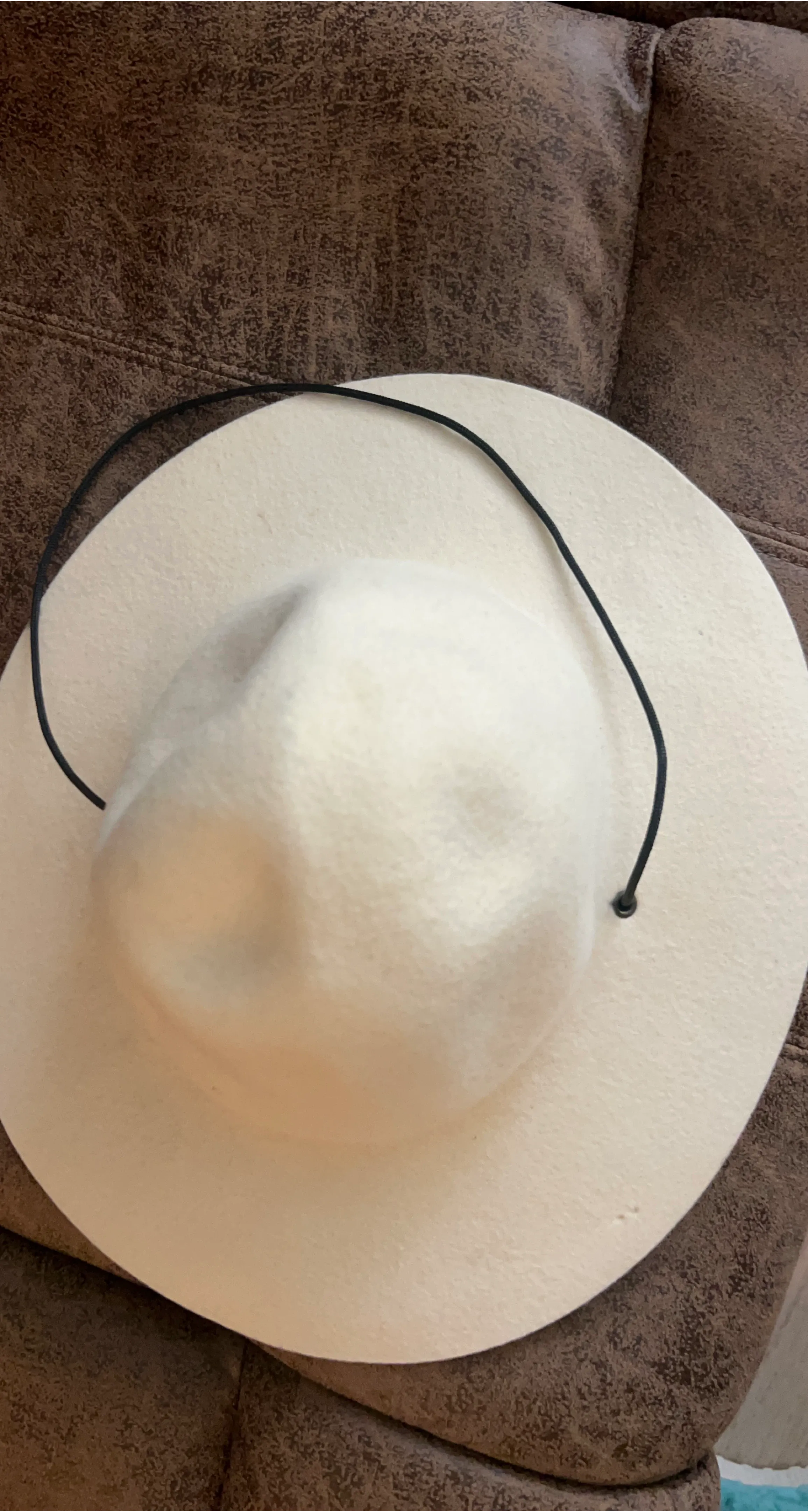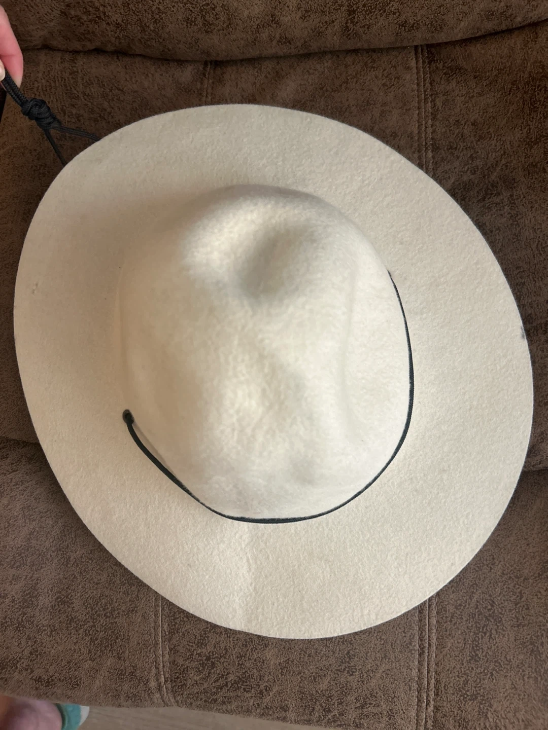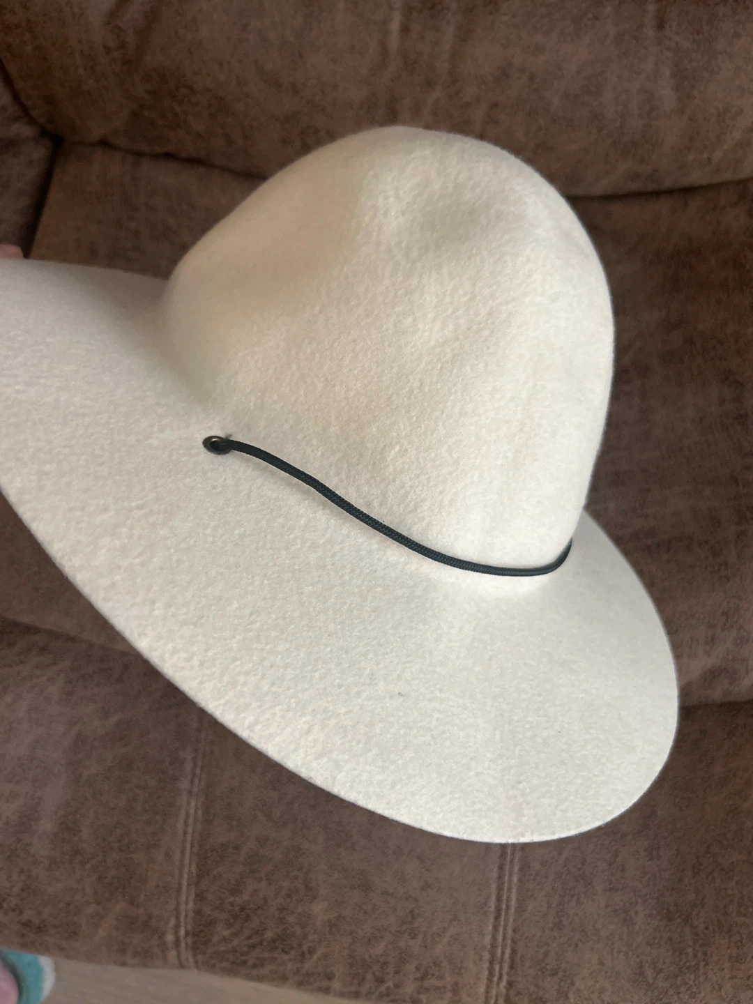 Cream felt wide brim hat. Size M. It has a black chin cord. Perfect for sun protection!