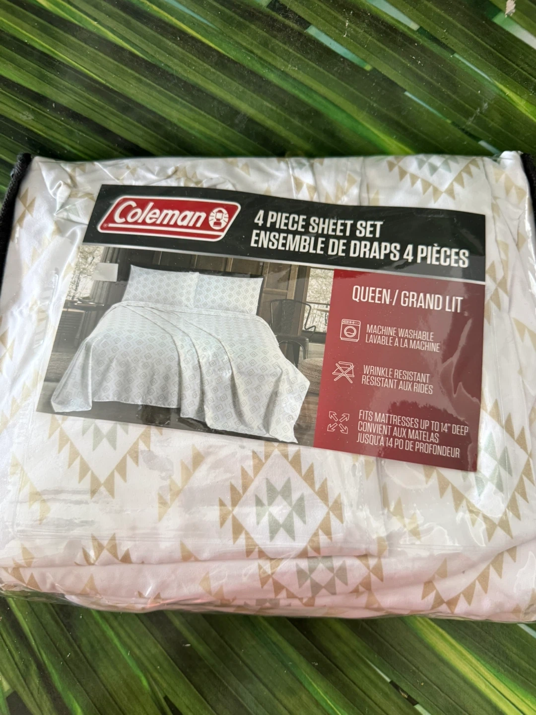 This is a Coleman 4-piece sheet set in Queen size. It's machine washable and wrinkle-resistant. Fits mattresses up to 14" deep.