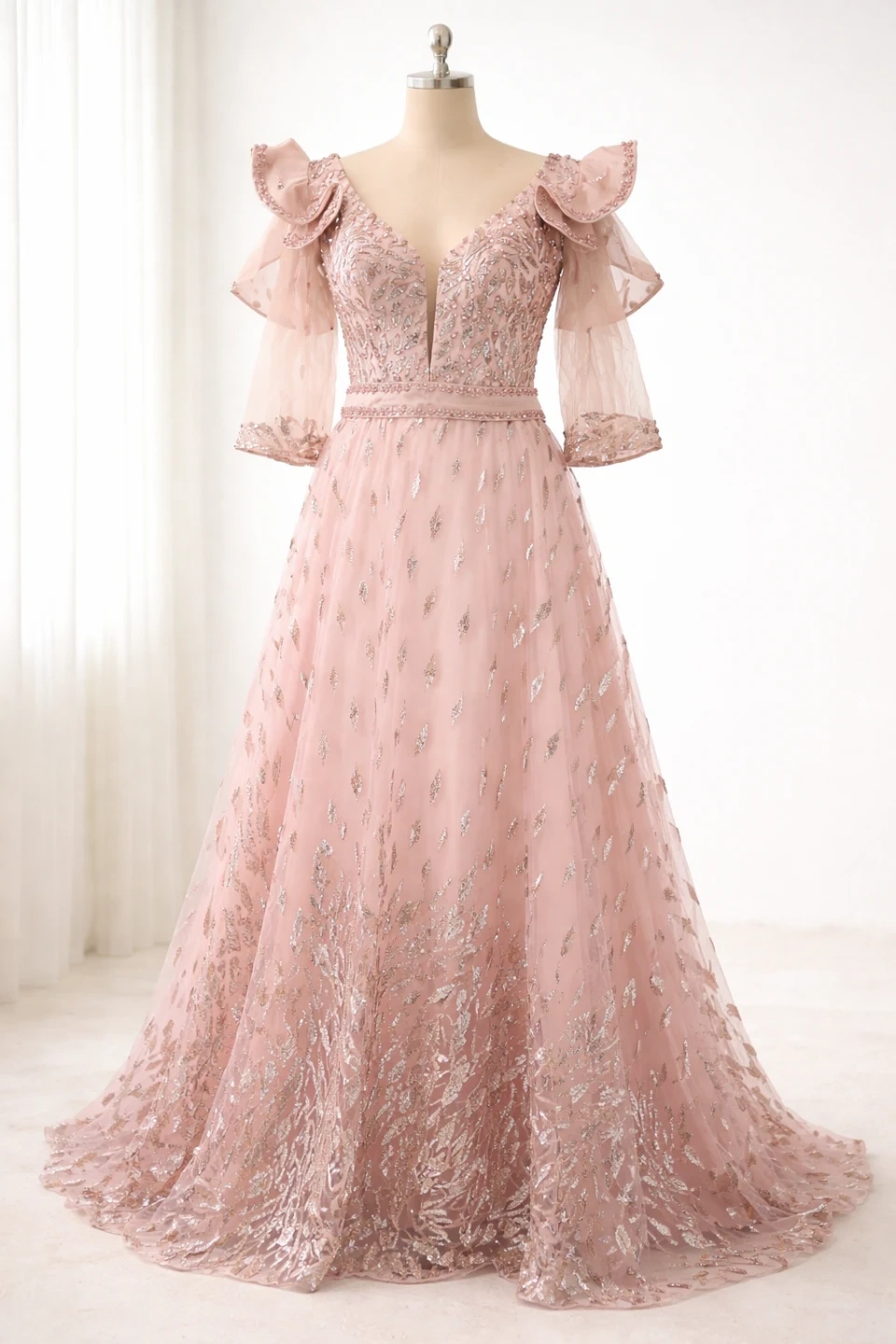 Pink Embellished Tulle Gown with Flutter Sleeves