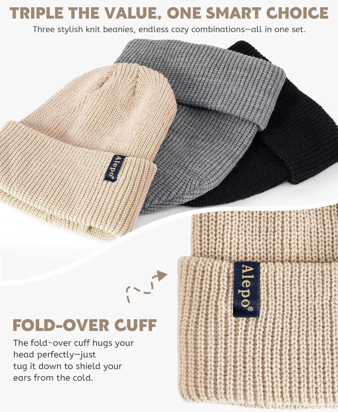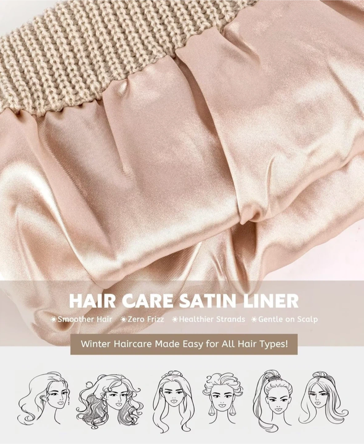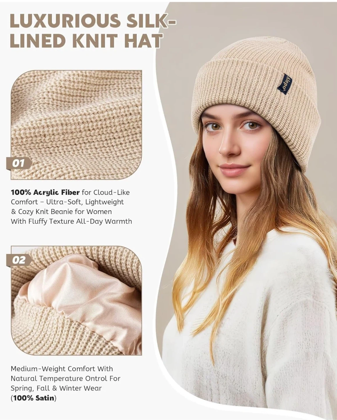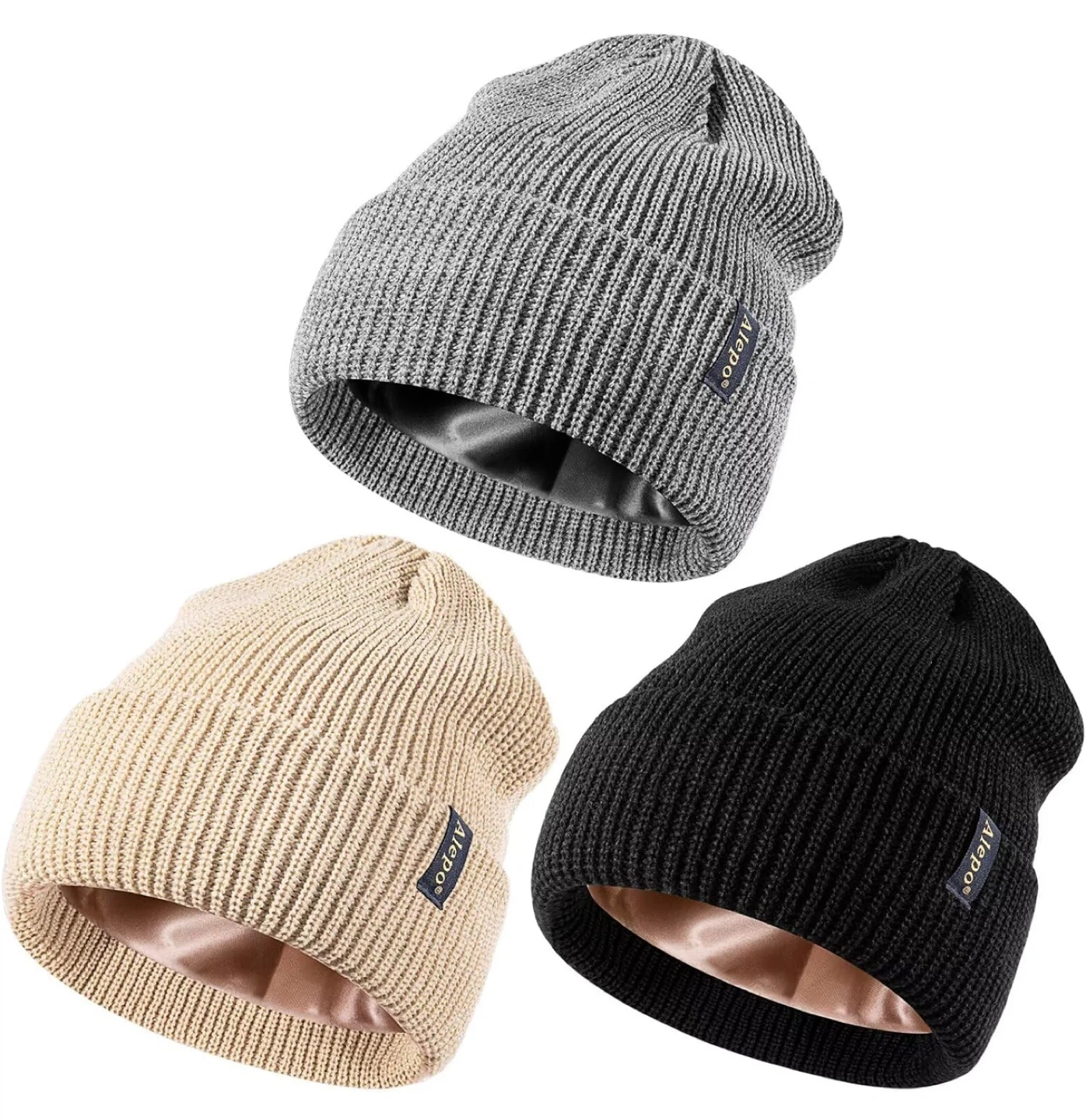 3 Pack Satin Lined Beanie for Women Men, Silk Lined Winter Hats for Cold Weather, Warm Cable Knit Skull Cap Cuffed Beanies