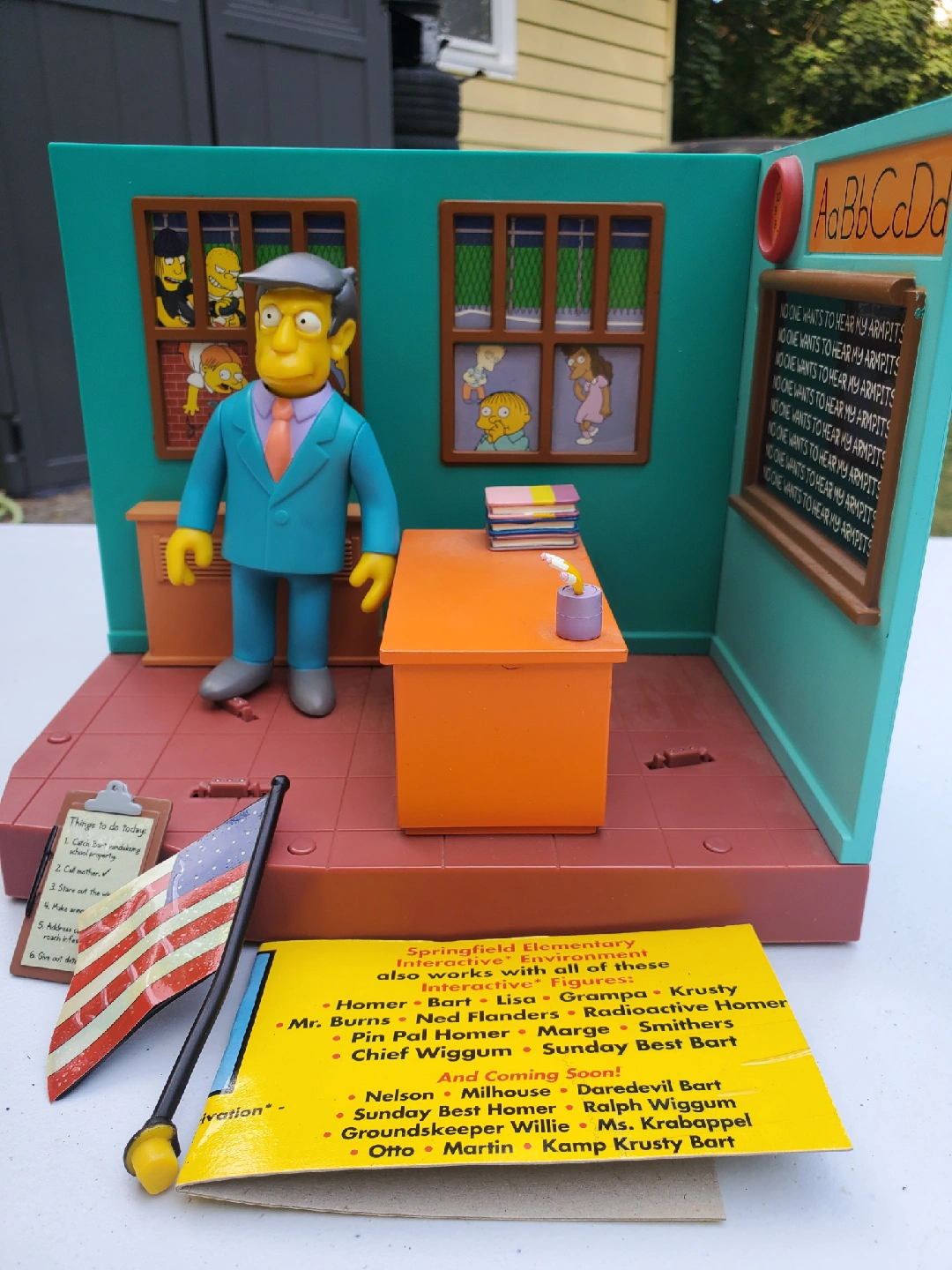 The Simpsons Springfield Elementary school talking Interactive Environment playset from 2001 WOS World of Springfield. This includes the School interactive environment, Principal Skinner, and all accessories. currently selling on eBay for $60 plus . I also have other playsets available listed under my profile. It has been tested and works fine.