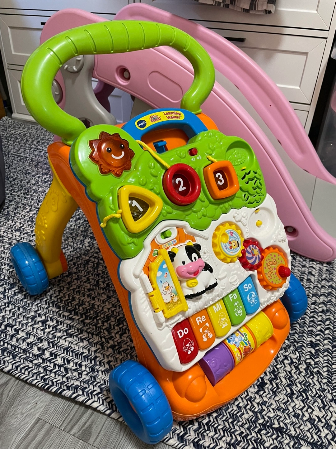Removable Tray: The activity-packed, detachable panel is perfect for babies who can sit up; it can also re-attach to the walker for on-the-run fun on both carpet and bare floors Auditory Training: The activity center for baby boys and girls includes five piano keys that play musical notes and a telephone handset to encourage creativity and role-play fun Motor Development: 3 shape sorters, light-up buttons, and colorful spinning rollers are featured on the baby rolling walker to help define motor skills Balance Development: The toddler walker activity center helps the development of stability and movement skills as well as fine motor skills and hand-eye coordination Adjustable: Two-speed control switch on the walker allows growth along with your little one's changing speeds; the perfect baby walker for boys and girls alike