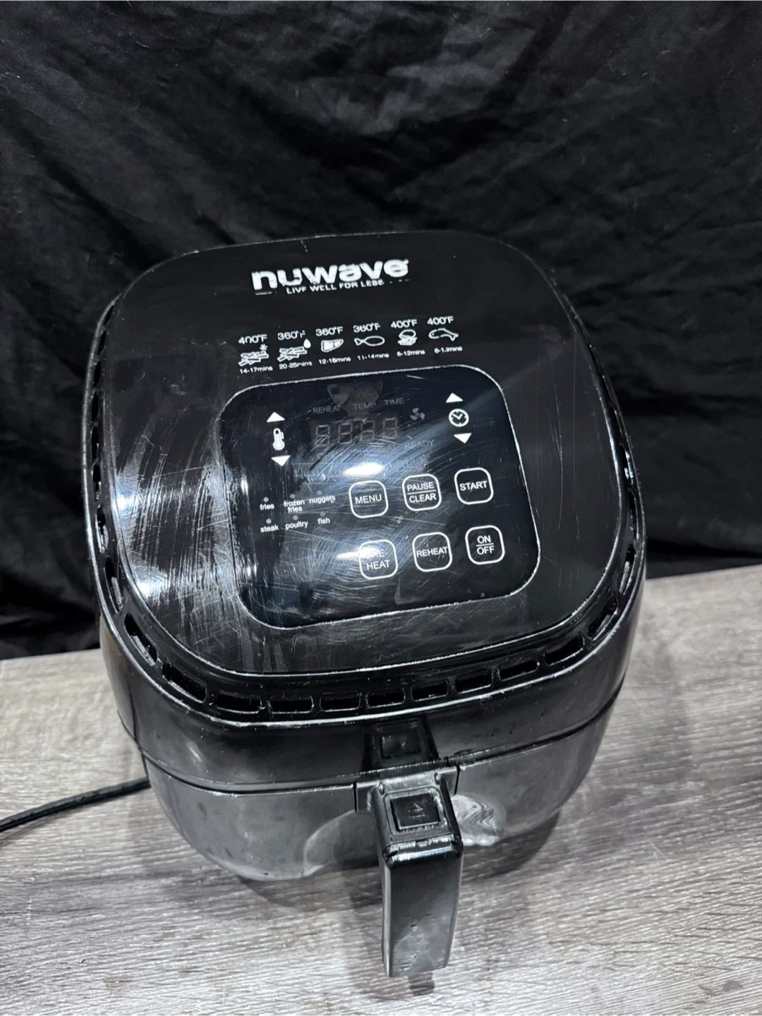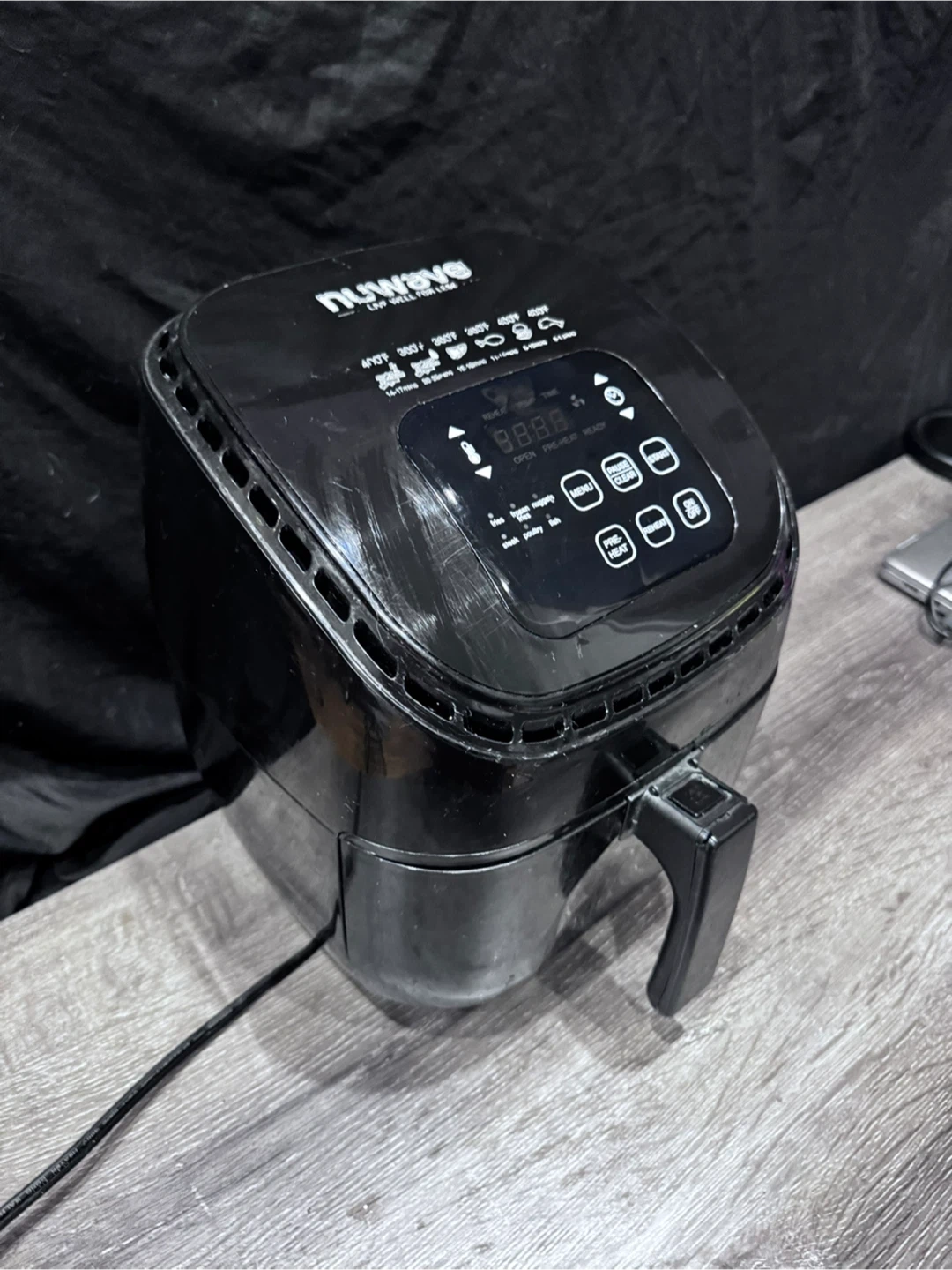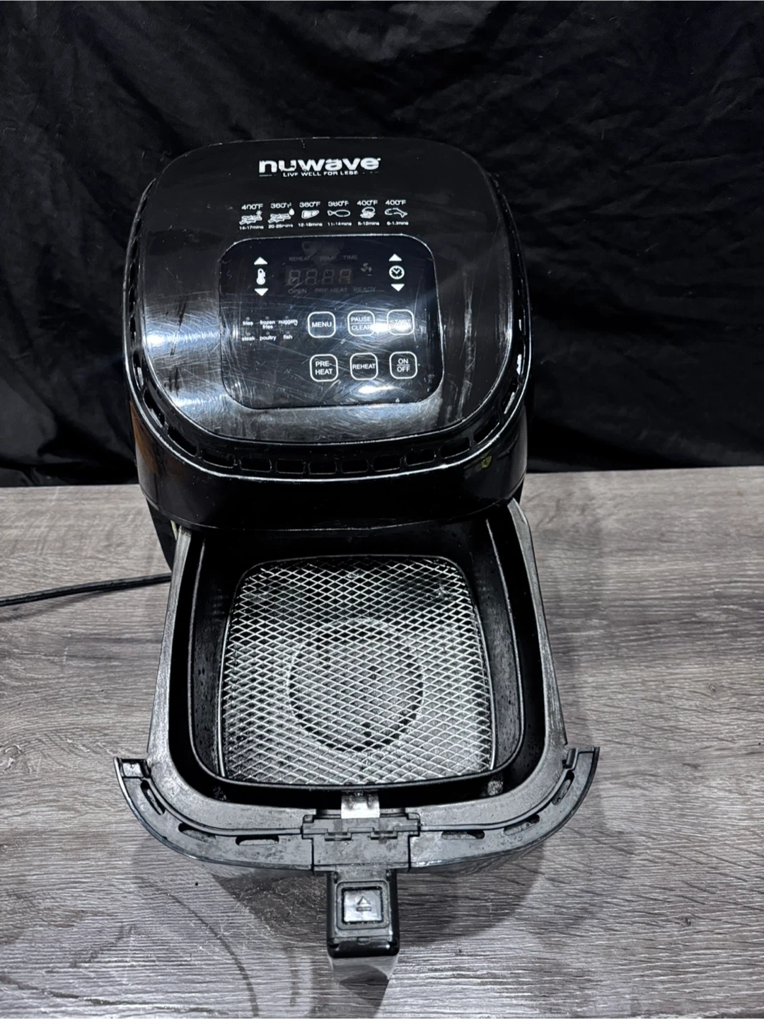 This black NuWave air fryer has several presets for cooking. Touch Screen Digital Controls & Easy to Read Display. This Airfryer is useful for making healthier fried foods.The air fry basket is non-stick, and the liner is never-rust stainless steel. All are dishwasher safe, and the cleanup is a breeze. Works perfectly just has cosmetic wear. Retails for 70$. Feel free to message if you have any questions. Willing to negotiate or barter for a kitchen trash bin.