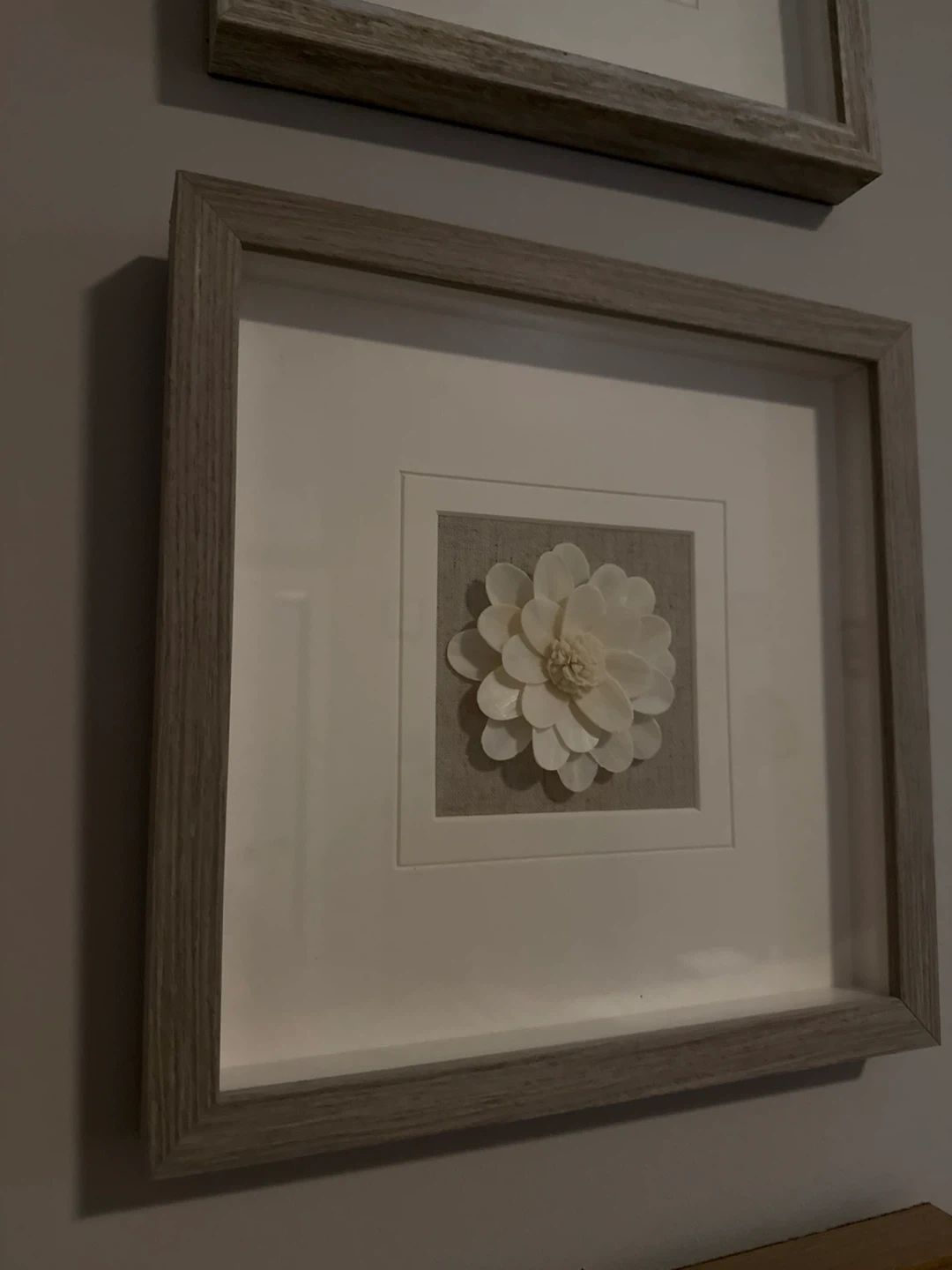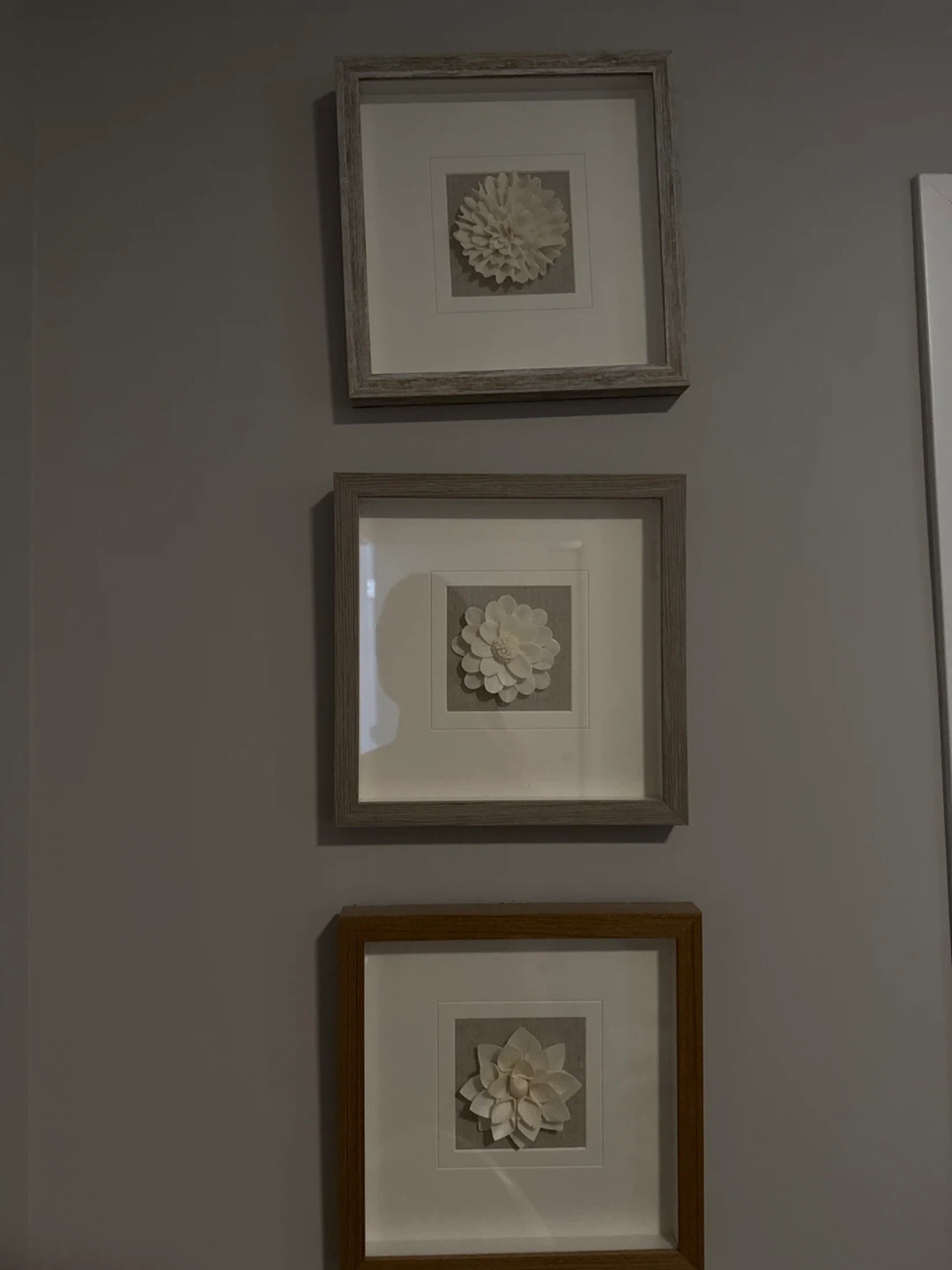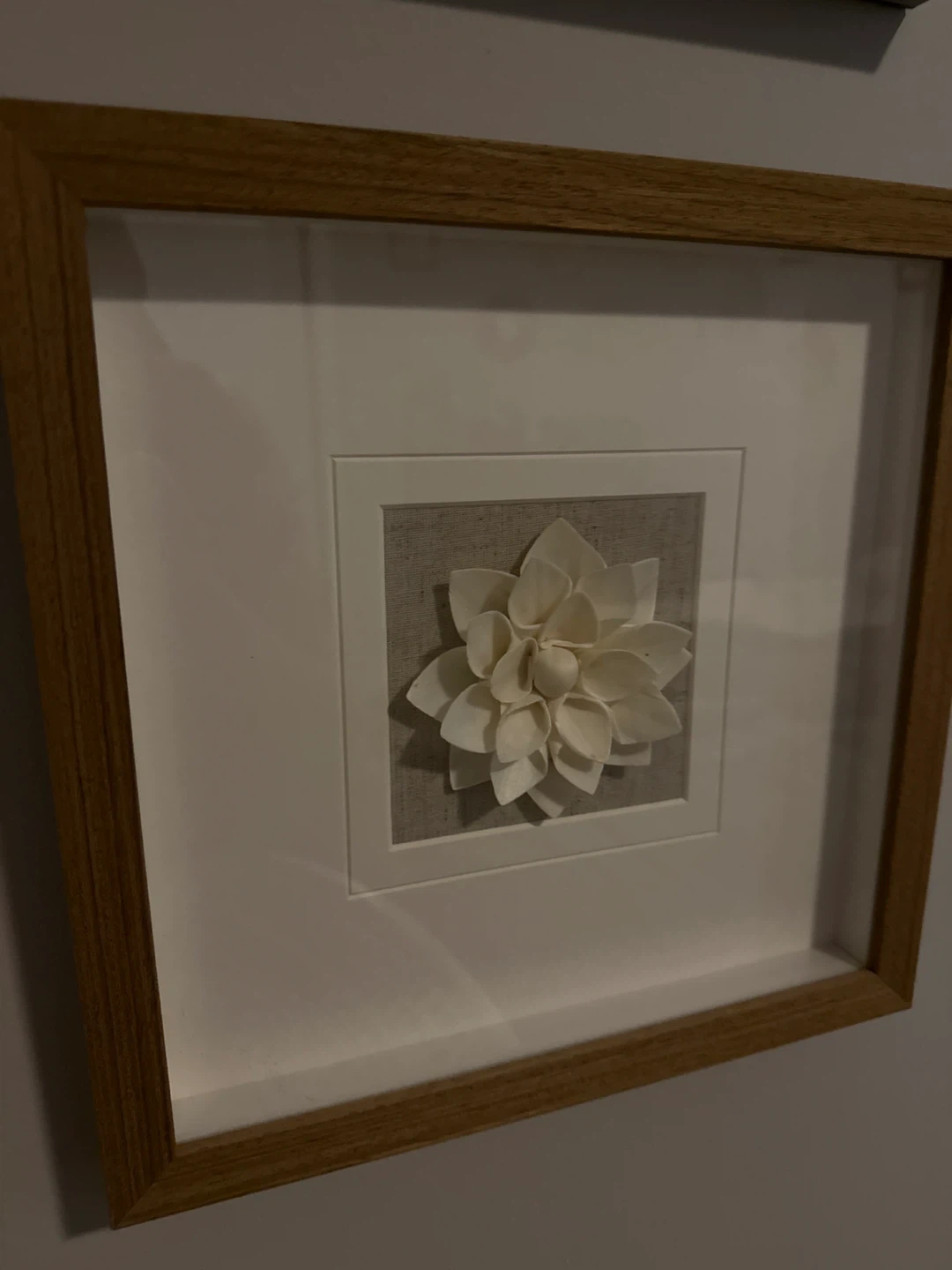 This framed wall art features a delicate white layered flower on a textured gray background. It's housed in a simple wooden frame. 2 of the prints are in a grey frame and 1 is in a soft tan frame.