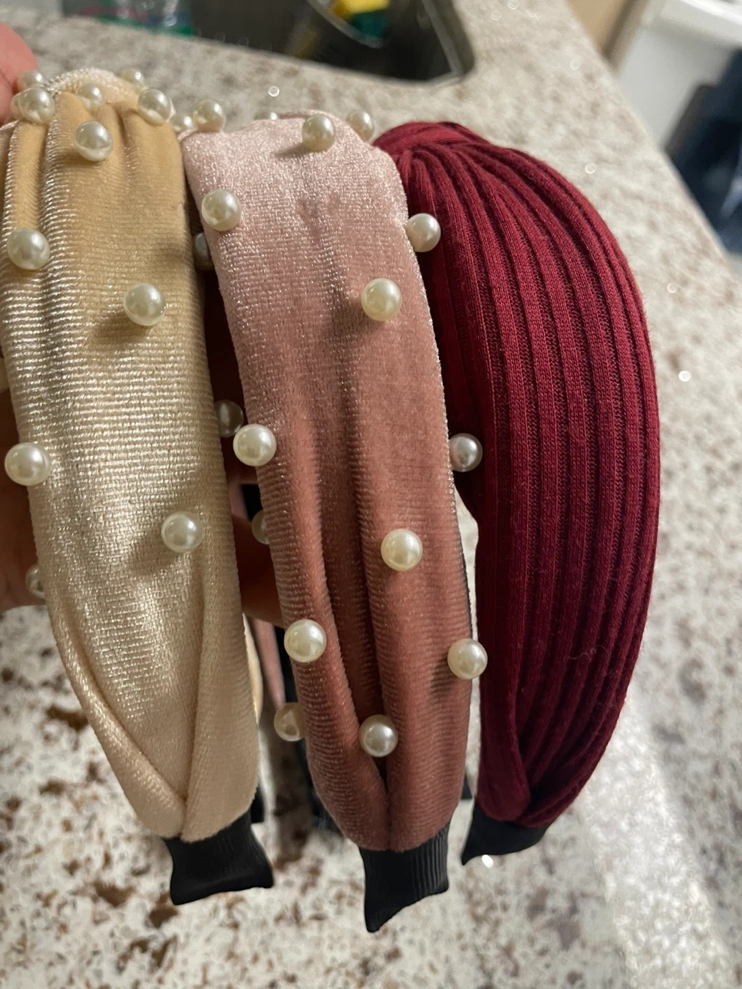 Selling a set of three new headbands, each adorned with faux pearls. They come in a beige, pink, and maroon colour. These headbands are in great condition and would add a touch of elegance to any outfit!