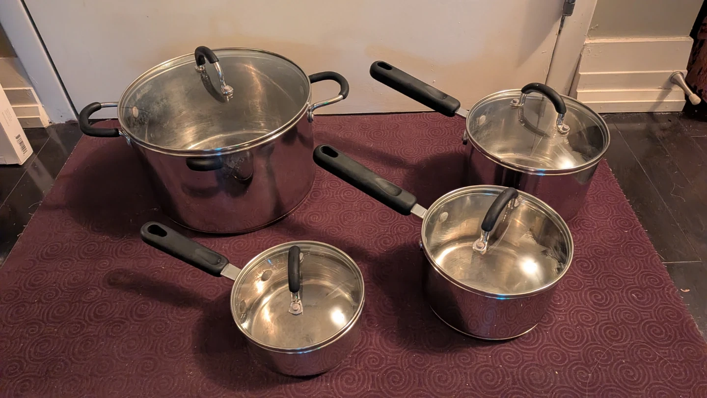 This is a set of four stainless steel pots and pans with glass lids. It includes one large pot with a lid and three smaller saucepans. The cookware is made of stainless steel with black handles.