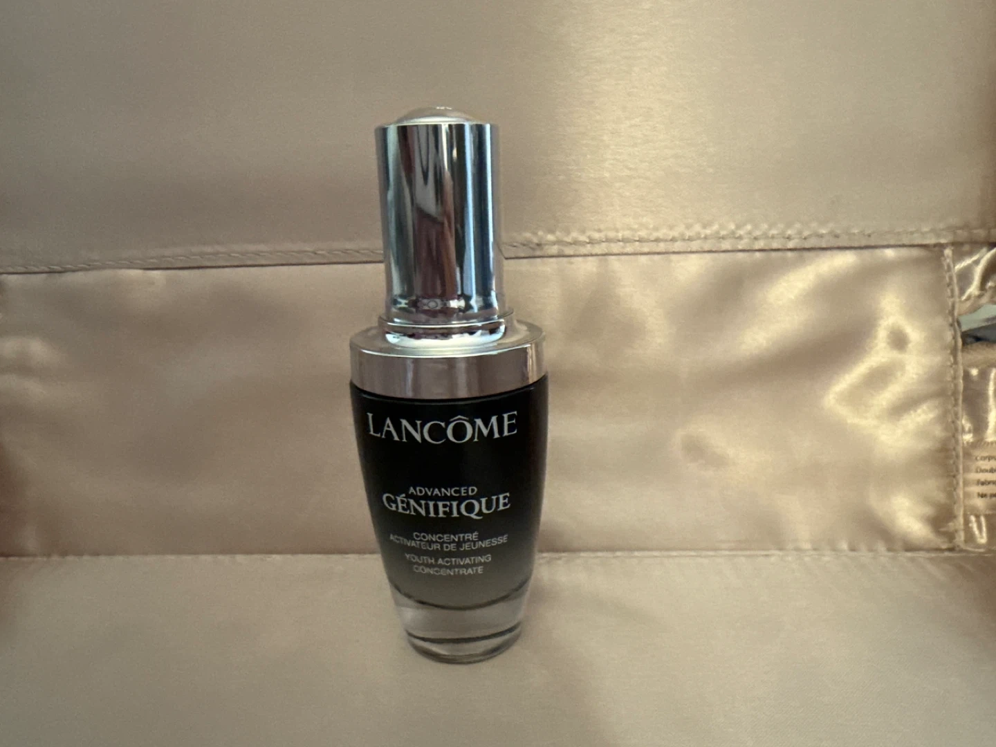 This is the Lancôme Advanced Génifique Youth Activating Concentrate serum. It's a glass bottle with a silver pump dispenser. 30 ml size.