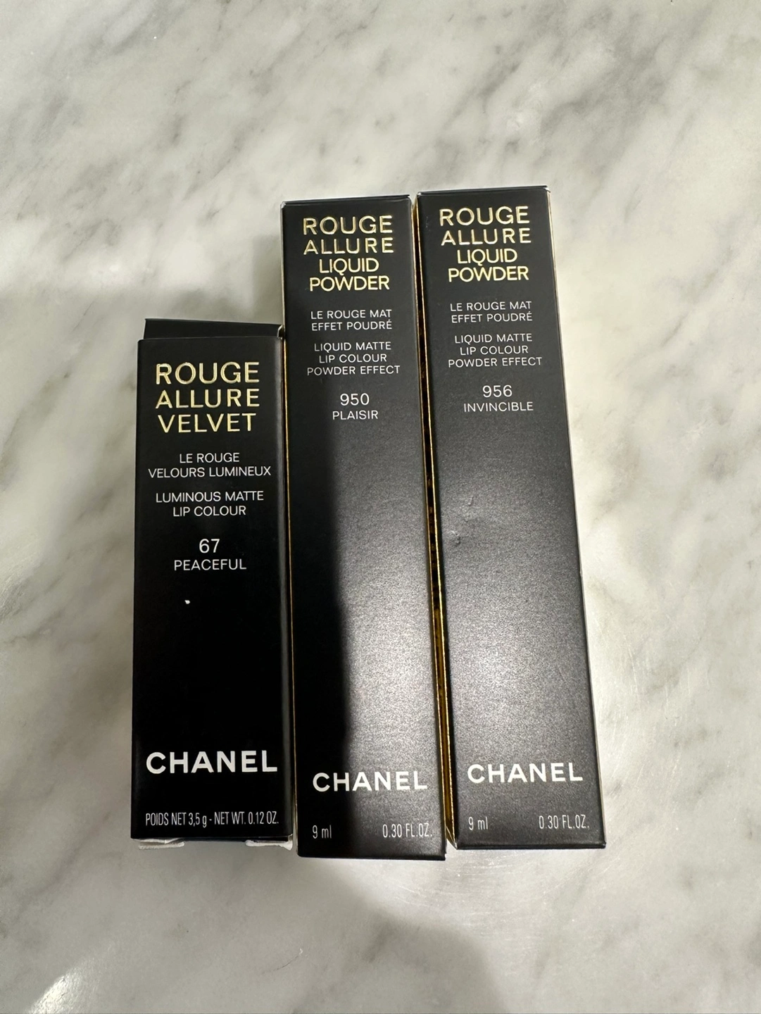 *BRAND NEW - NEVER USED* CHANEL Rouge Allure Lipstick Bundle of 3. The shades are 67 Peaceful (Rouge Allure Velvet), 950 Plaisir (Rouge Allure Liquid Powder), and 956 Invincible (Rouge Allure Liquid Powder). Regular retail value: $160+ CAD before tax.