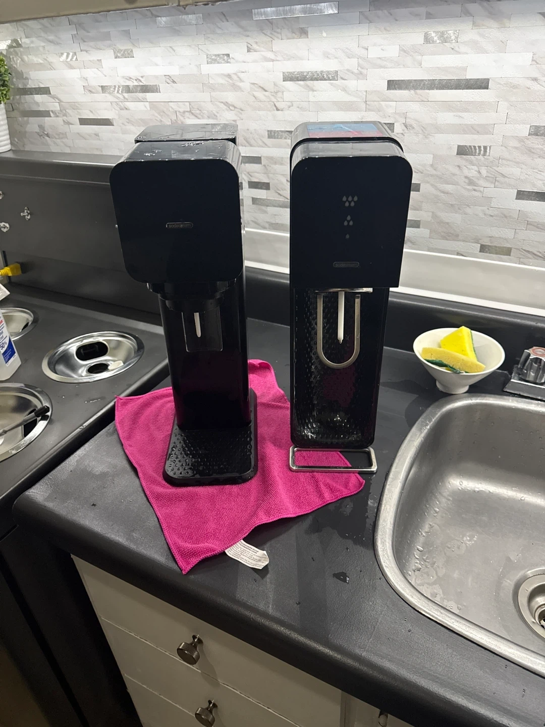 Two black SodaStream machines are available. They're used for making sparkling water at home. Both are black in colour.