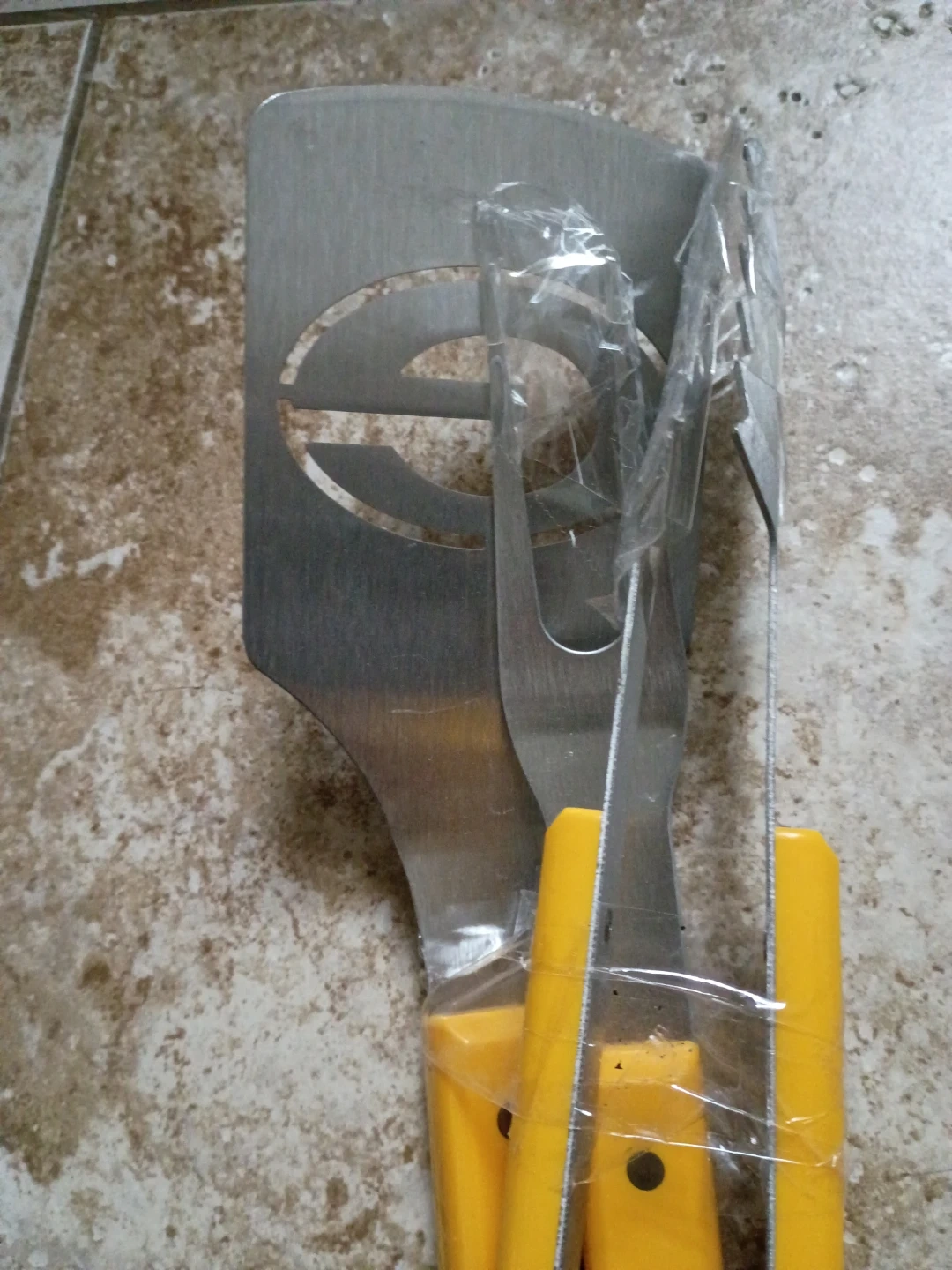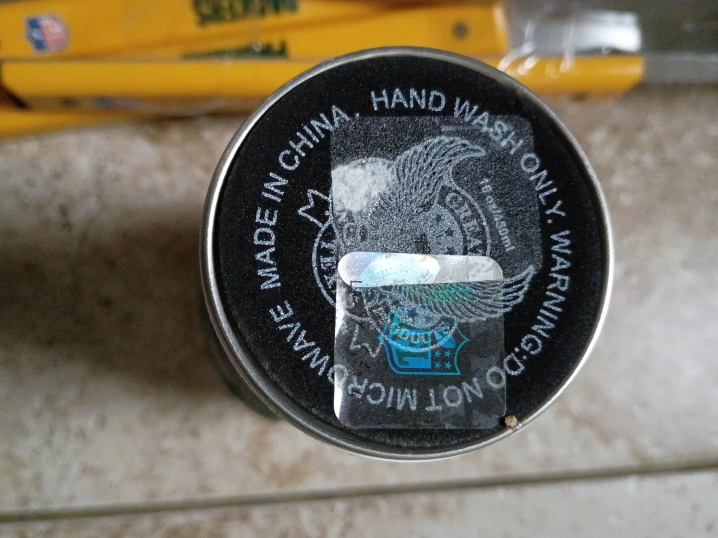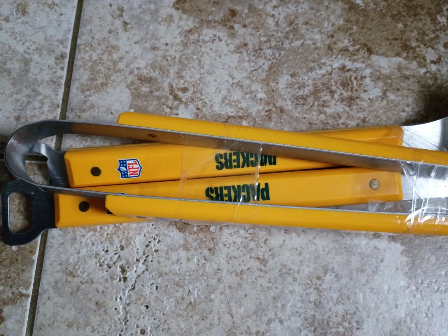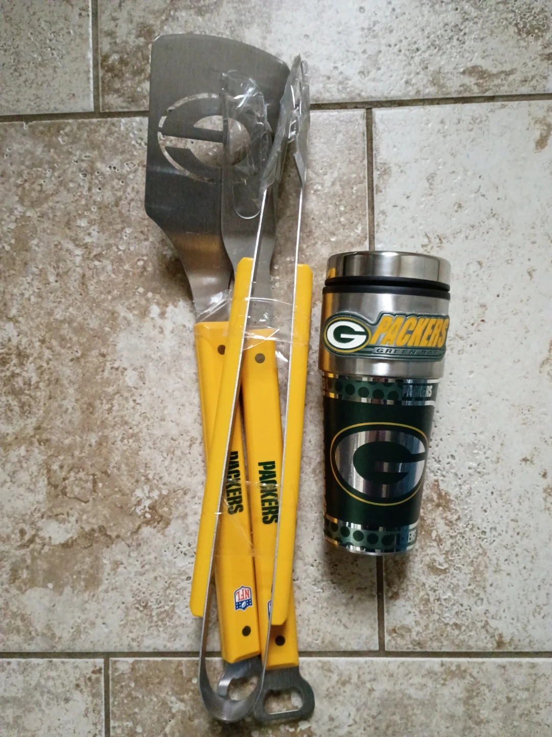 This set includes a Green Bay Packers travel tumbler and a 3-piece BBQ tool set. The tumbler holds 16 oz and is hand wash only. BBQ tools have yellow handles and are made of metal.