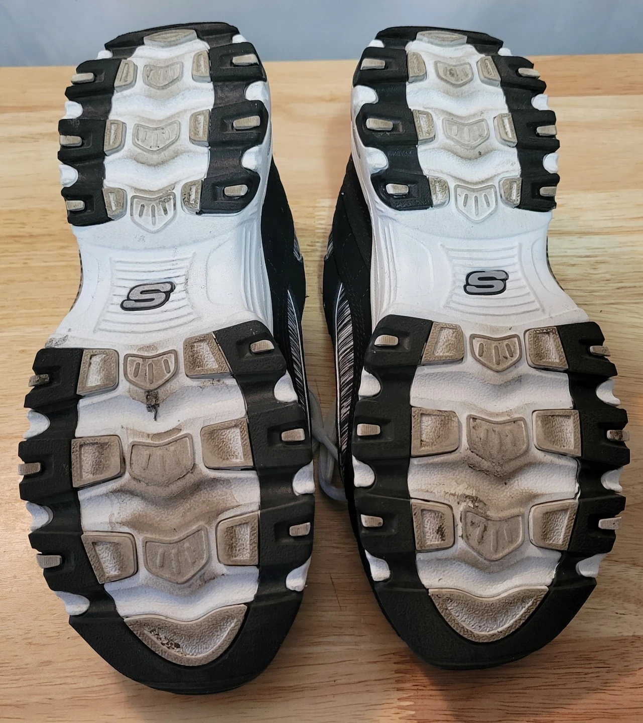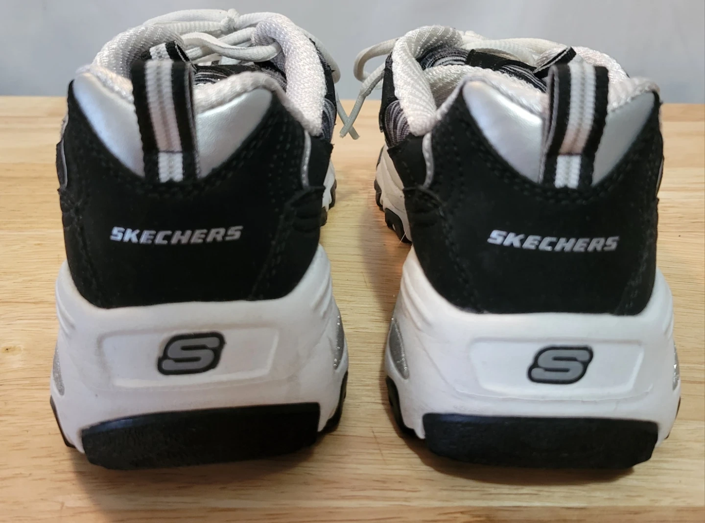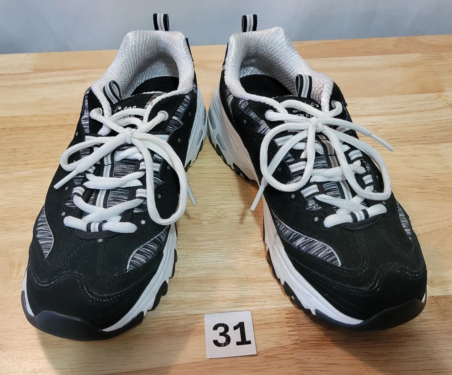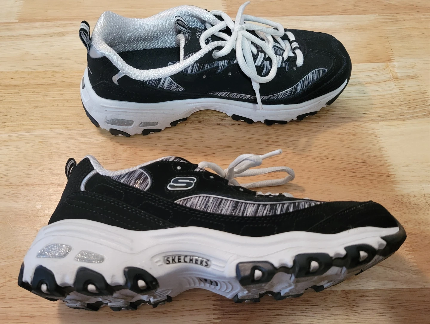 92Selling a pair of Skechers D'Lites in women's size 7! They are black and white and in excellent condition. The upper is made of leather and man-made materials.