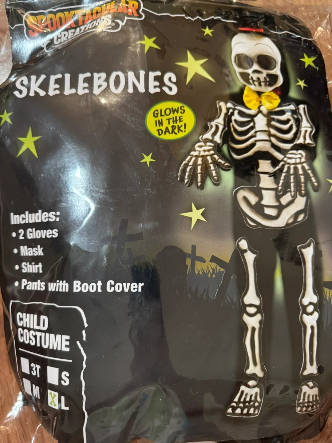 Selling a Skelebones child costume, size L! This spooky costume includes: - NO 2 Gloves - Mask - Shirt - Pants with Boot Cover It also glows in the dark!