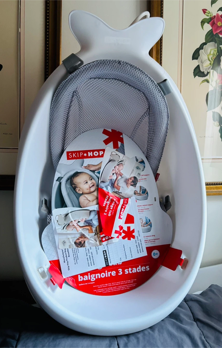 65Cash $15 This Skip Hop baby bathtub is designed to grow with your baby through three stages! It features an ergonomic sling that cradles newborns, supports infants learning to sit, and can be removed for babies who can sit on their own. Suitable for ages 0+ months