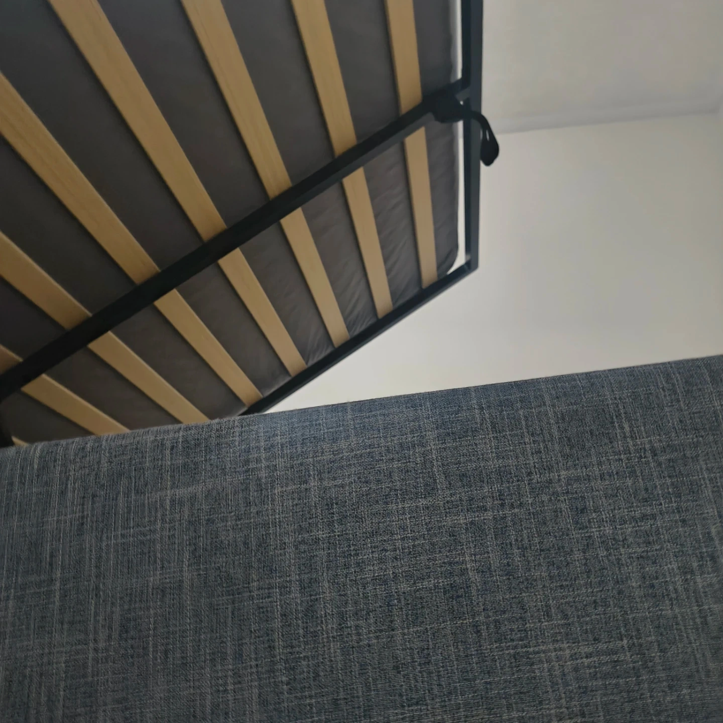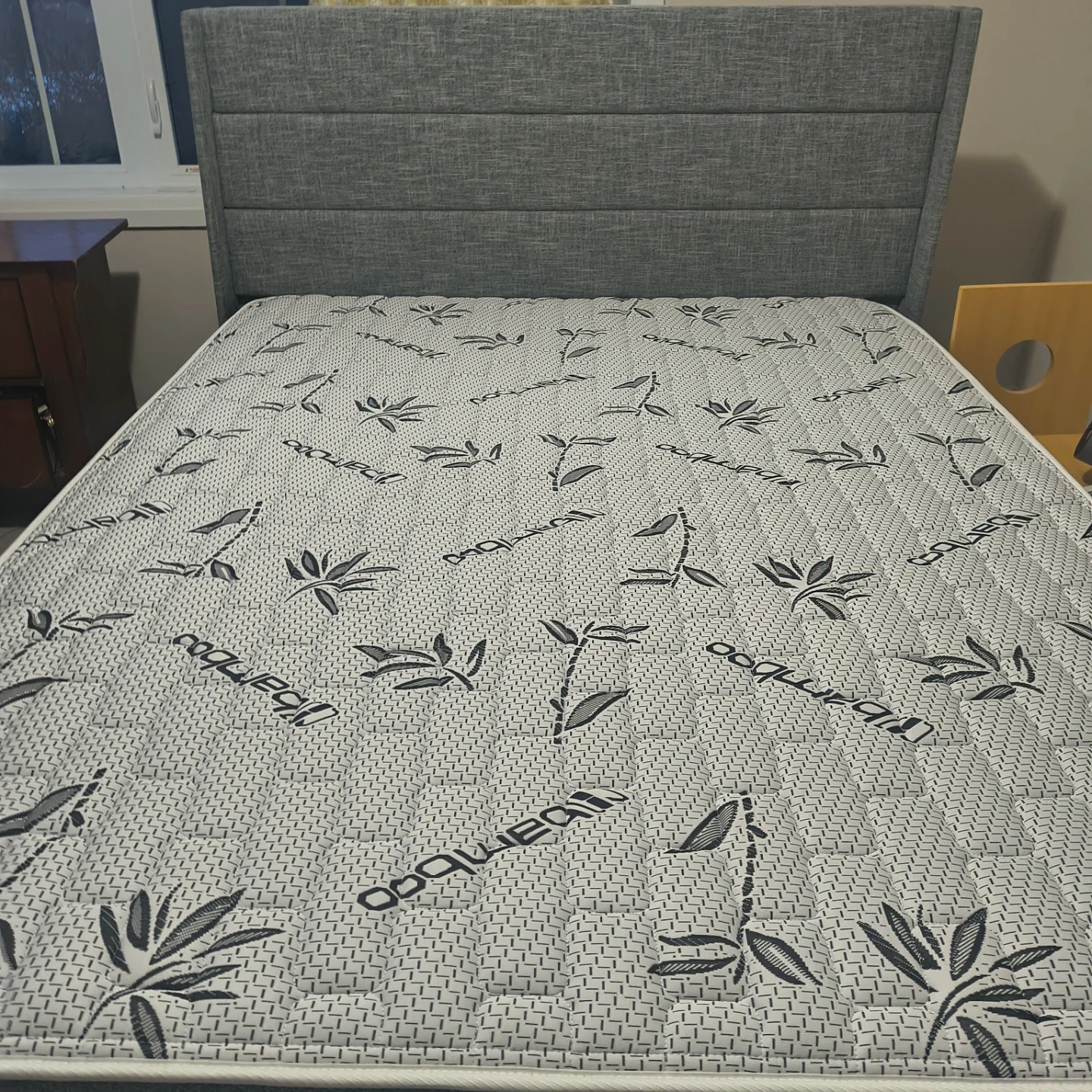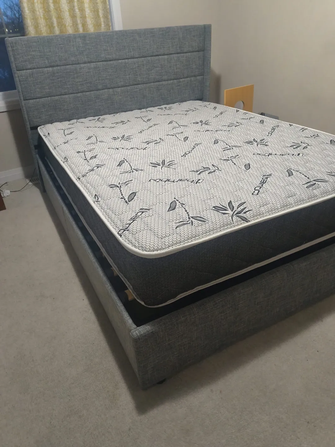 Selling a queen size bed frame that's in good condition! It comes with a comfortable mattress. Less than 1 year old. Lifts up for storage. The bed frame features a stylish grey fabric finish, and the mattress has a bamboo pattern. I purchased this for $1100, I still have the receipt. Perfect for a master bedroom or guest room.