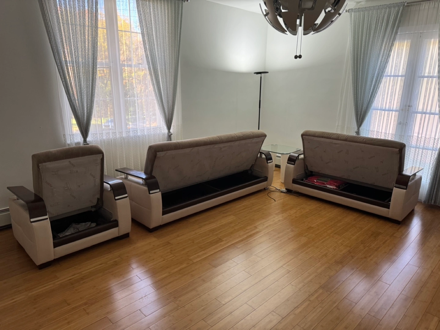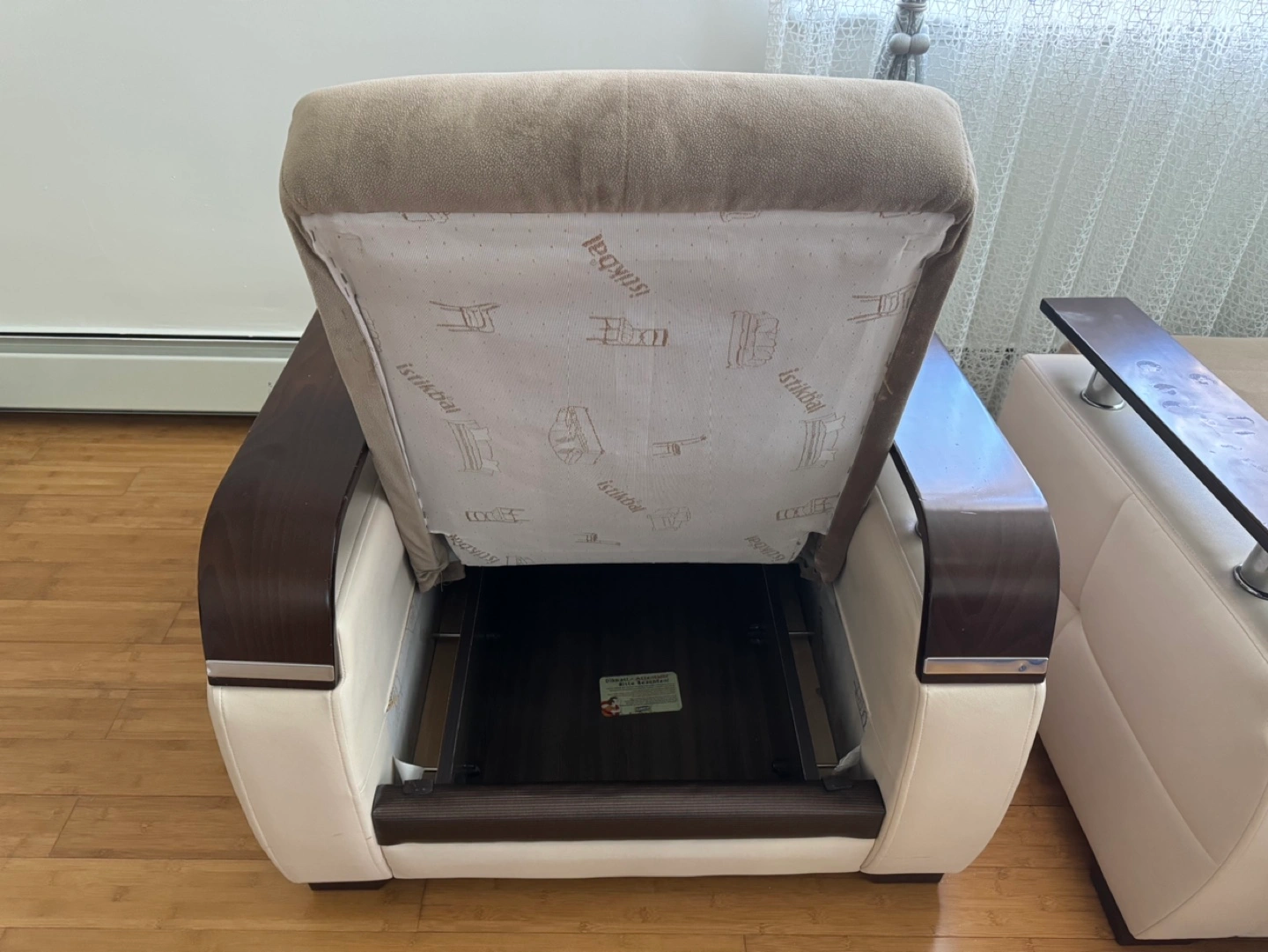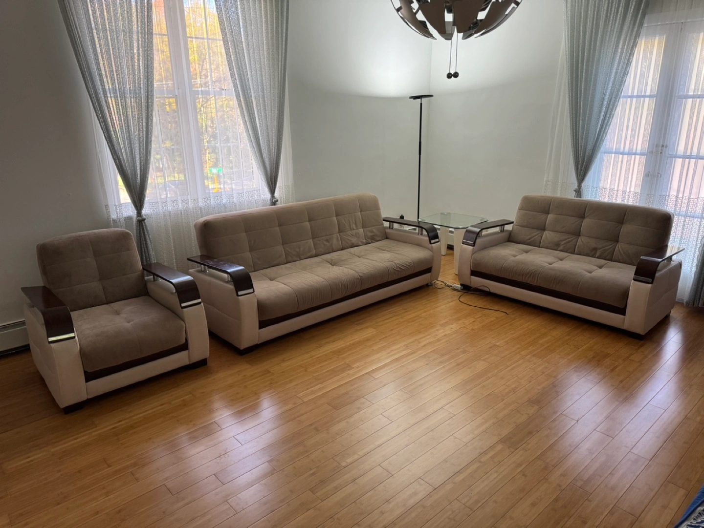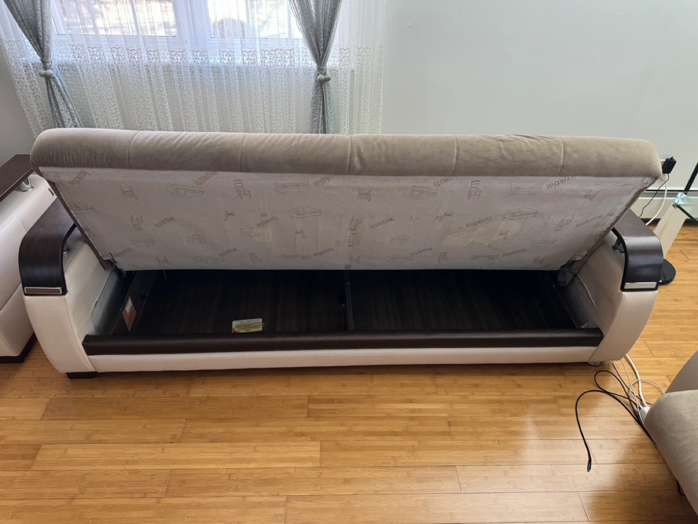 Good condition Living room furniture sets. From a smoke-free and pet-free home! This is medeteranian style ISTIKBAL (Turkish) brand, living room set that Includes a sofa, LoveSeat and ArmChair. Sofa, loveseat, and armchair all feature built-in storage compartments, perfect for organizing blankets, pillows, or other household items & all 3 easily fold out into flat beds, offering both functionality and extra sleeping space when needed. - The handle areas have a Minor scratch, and very little sticker glue remaining. - Sofa only: one leg broken ( easily can be switched) i replaced with different leg!