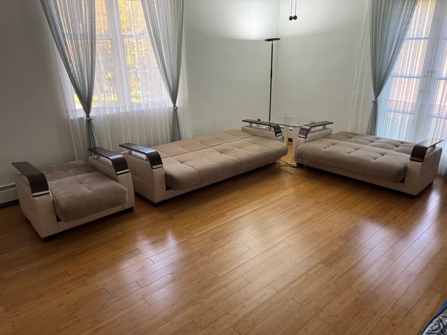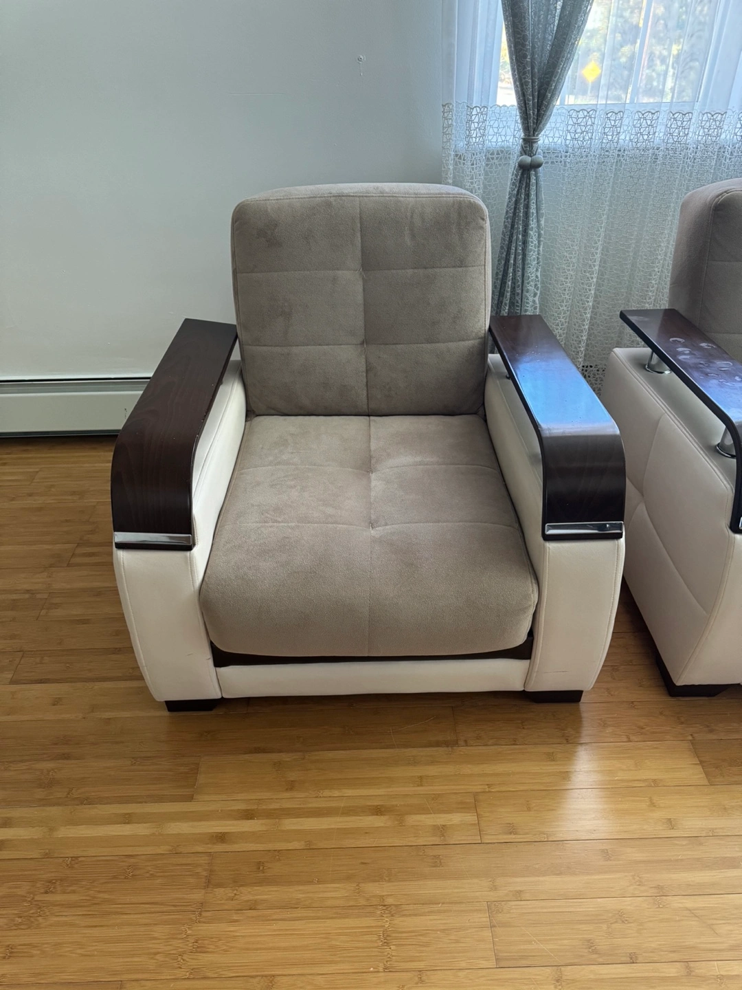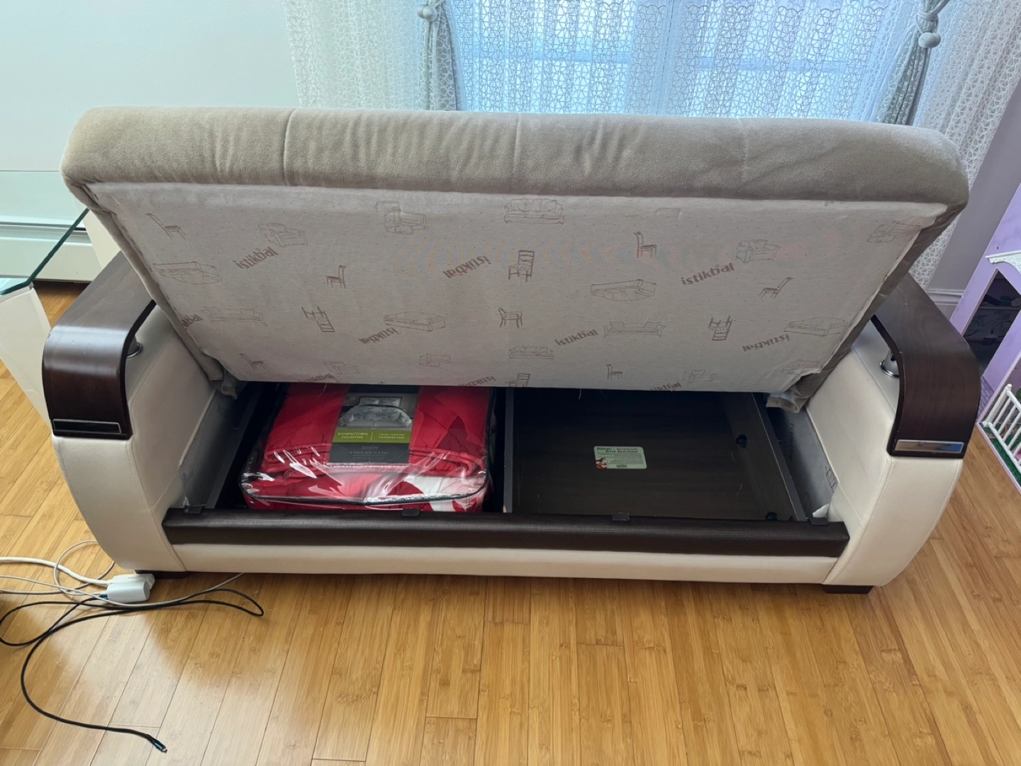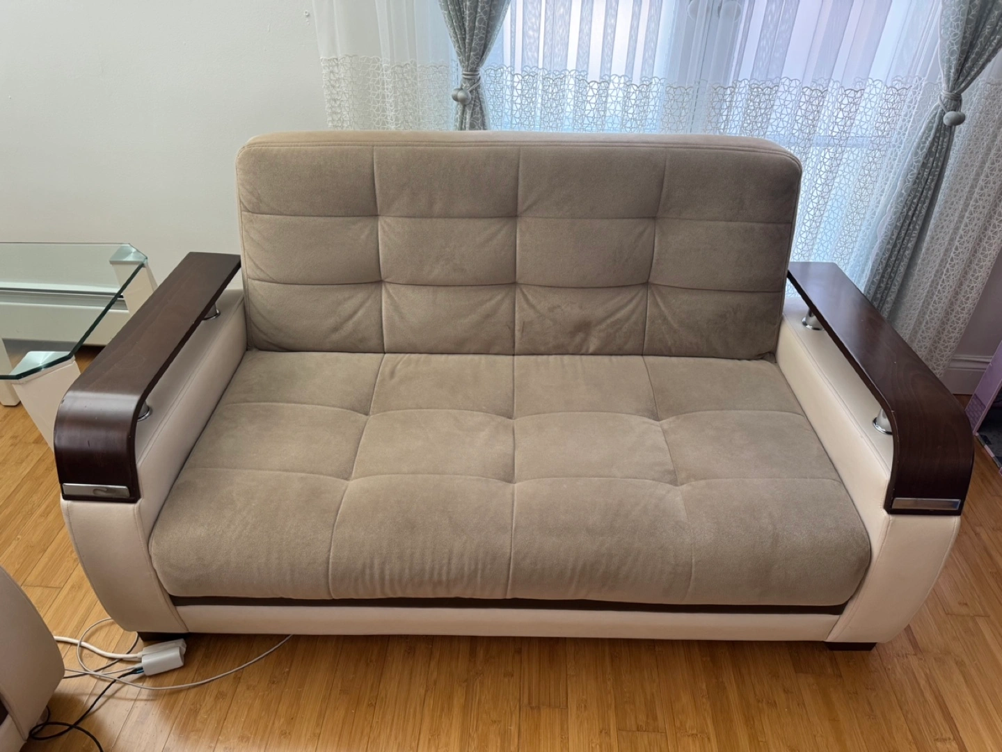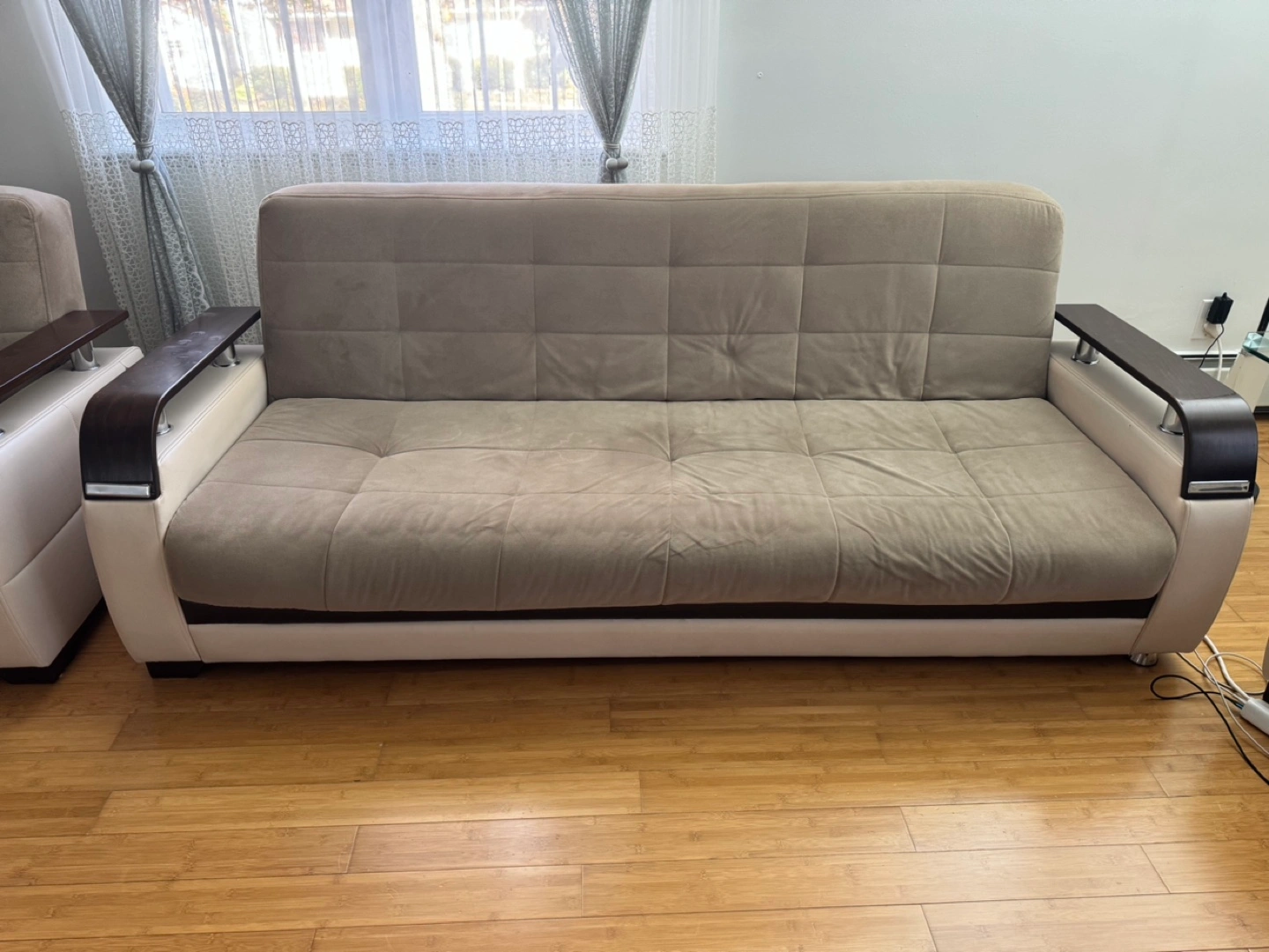 Good condition Living room furniture sets. From a smoke-free and pet-free home! This is medeteranian style ISTIKBAL (Turkish) brand, living room set that Includes a sofa, LoveSeat and ArmChair. Sofa, loveseat, and armchair all feature built-in storage compartments, perfect for organizing blankets, pillows, or other household items & all 3 easily fold out into flat beds, offering both functionality and extra sleeping space when needed. - The handle areas have a Minor scratch, and very little sticker glue remaining. - Sofa only: one leg broken ( easily can be switched) i replaced with different leg!