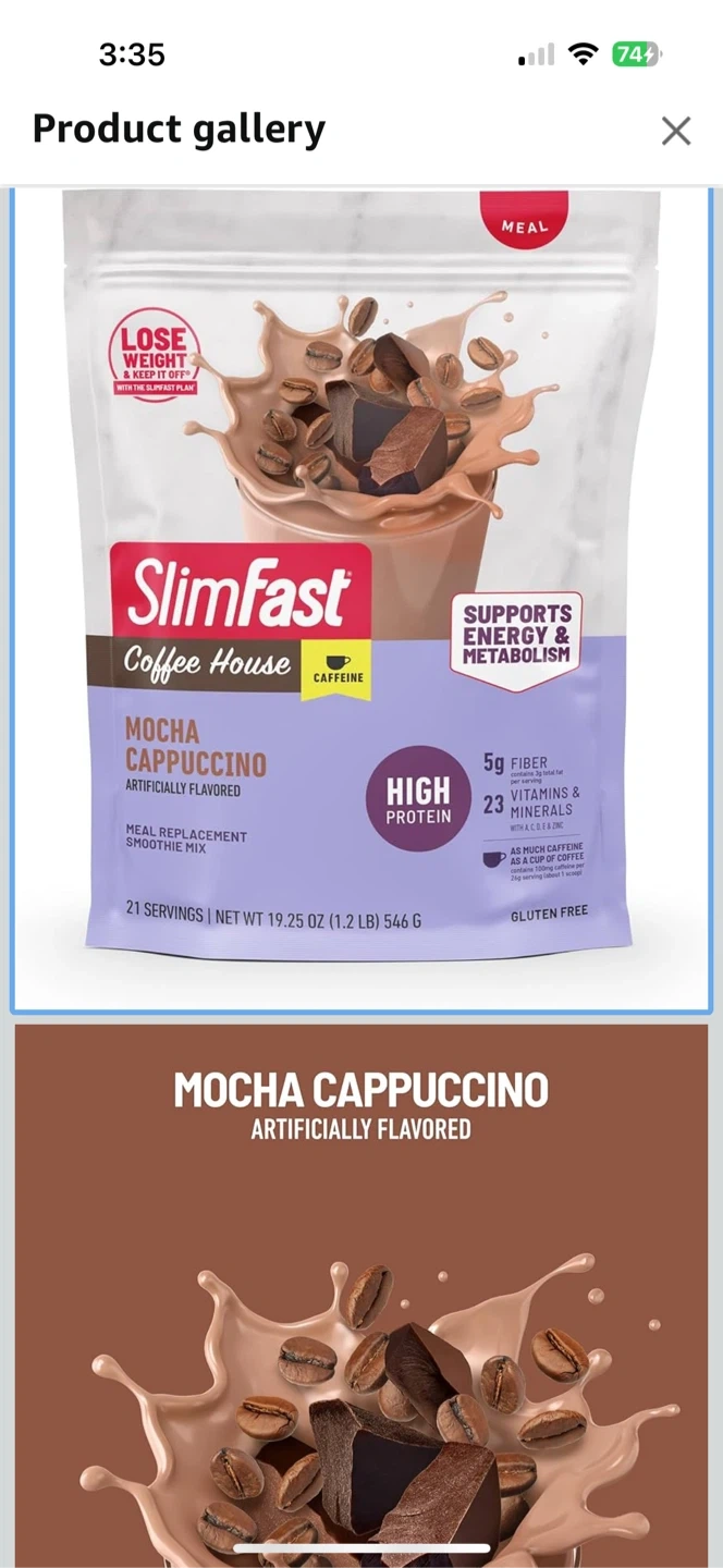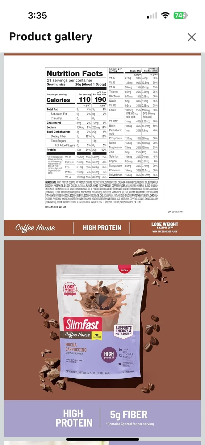 65Selling a SlimFast Coffee House Mocha Cappuccino meal replacement smoothie mix! It contains 5g of fiber and 23 vitamins and minerals per serving. It's also gluten-free and artificially flavored