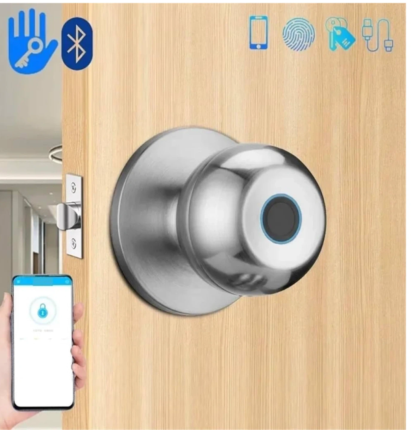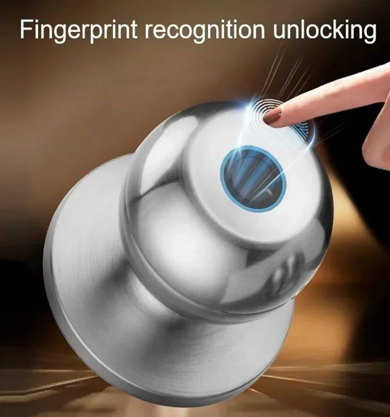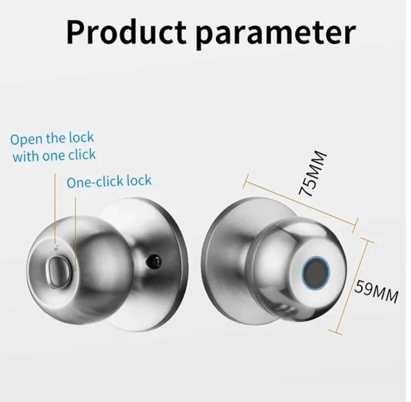 Selling a smart lock door knob featuring fingerprint recognition unlocking. It comes with the box and installation instructions. This lock has a one-click lock feature and is easy to install! Dimensions are 75mm x 59mm