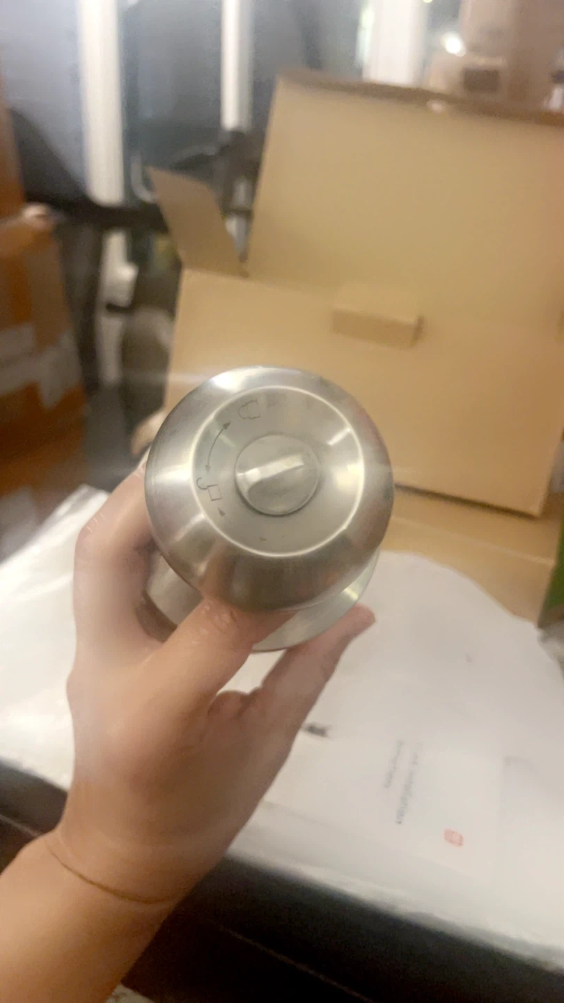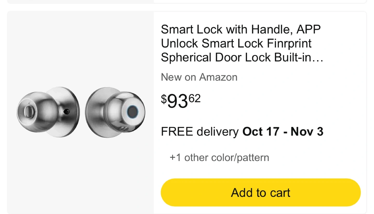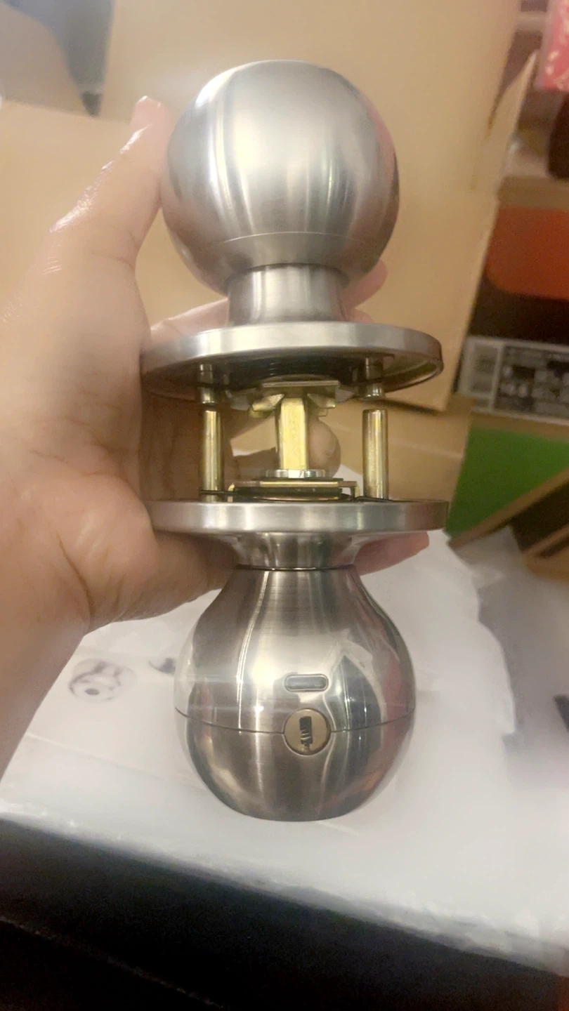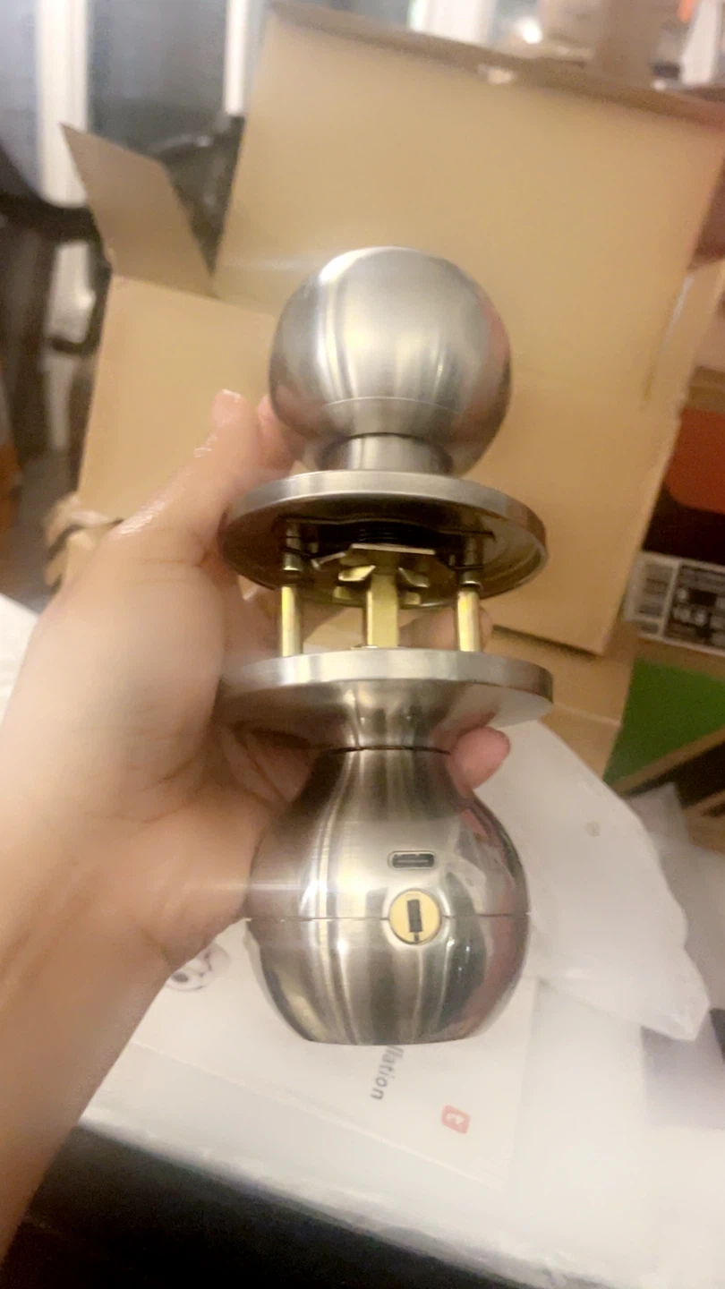 Selling a smart lock door knob featuring fingerprint recognition unlocking. It comes with the box and installation instructions. This lock has a one-click lock feature and is easy to install! Dimensions are 75mm x 59mm