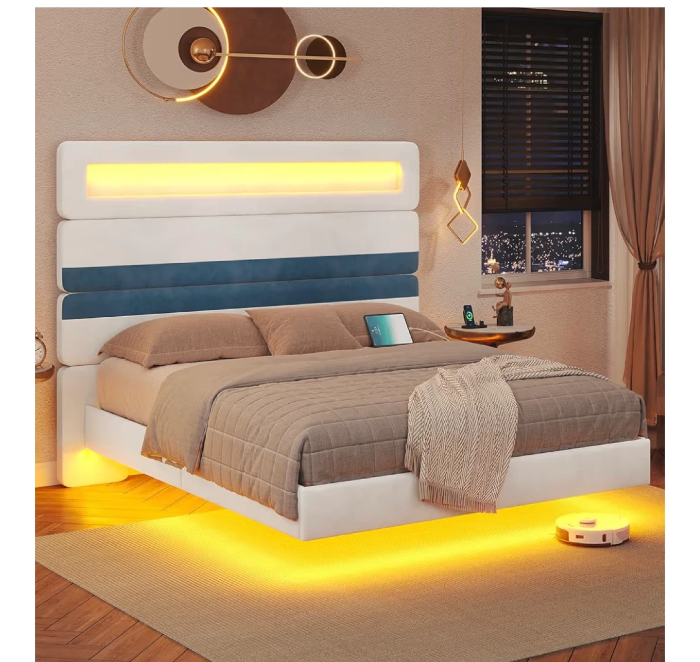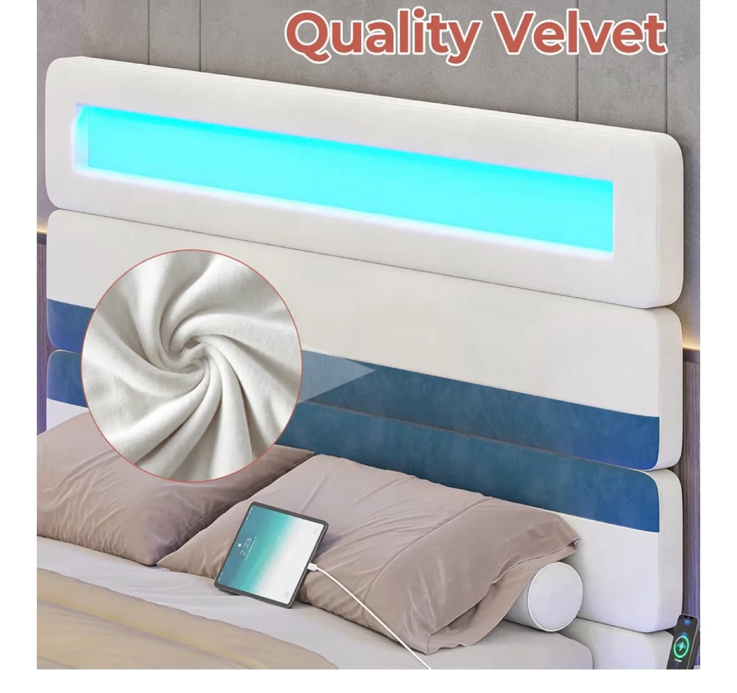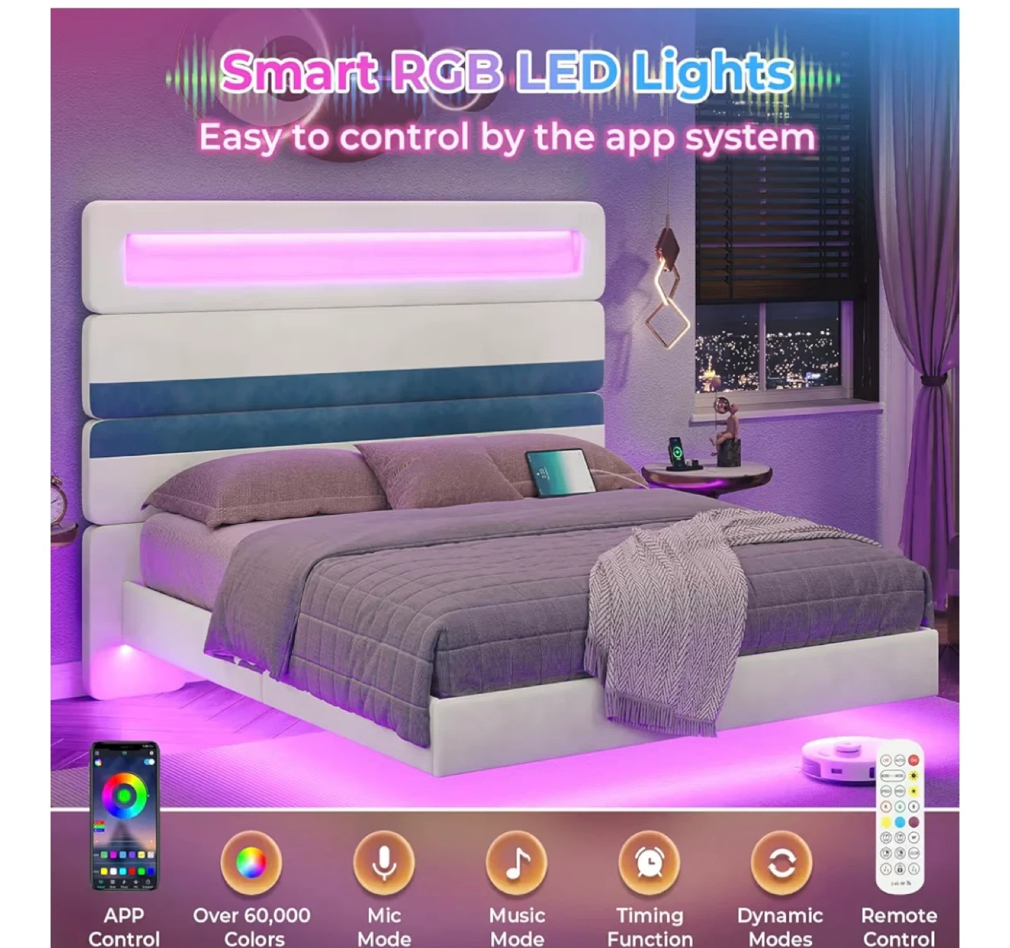 Selling a bed frame with smart RGB LED lights that are easy to control with the app system. It features a built-in charging station with 2 AC outlets, USB ports, and Type C ports. The headboard is made with quality velvet. The bed also has dynamic modes and a remote control