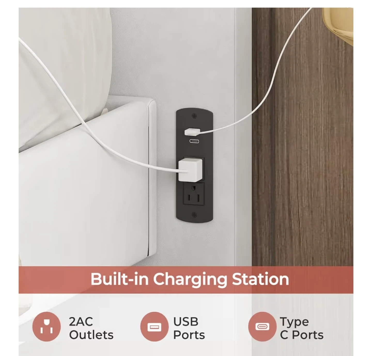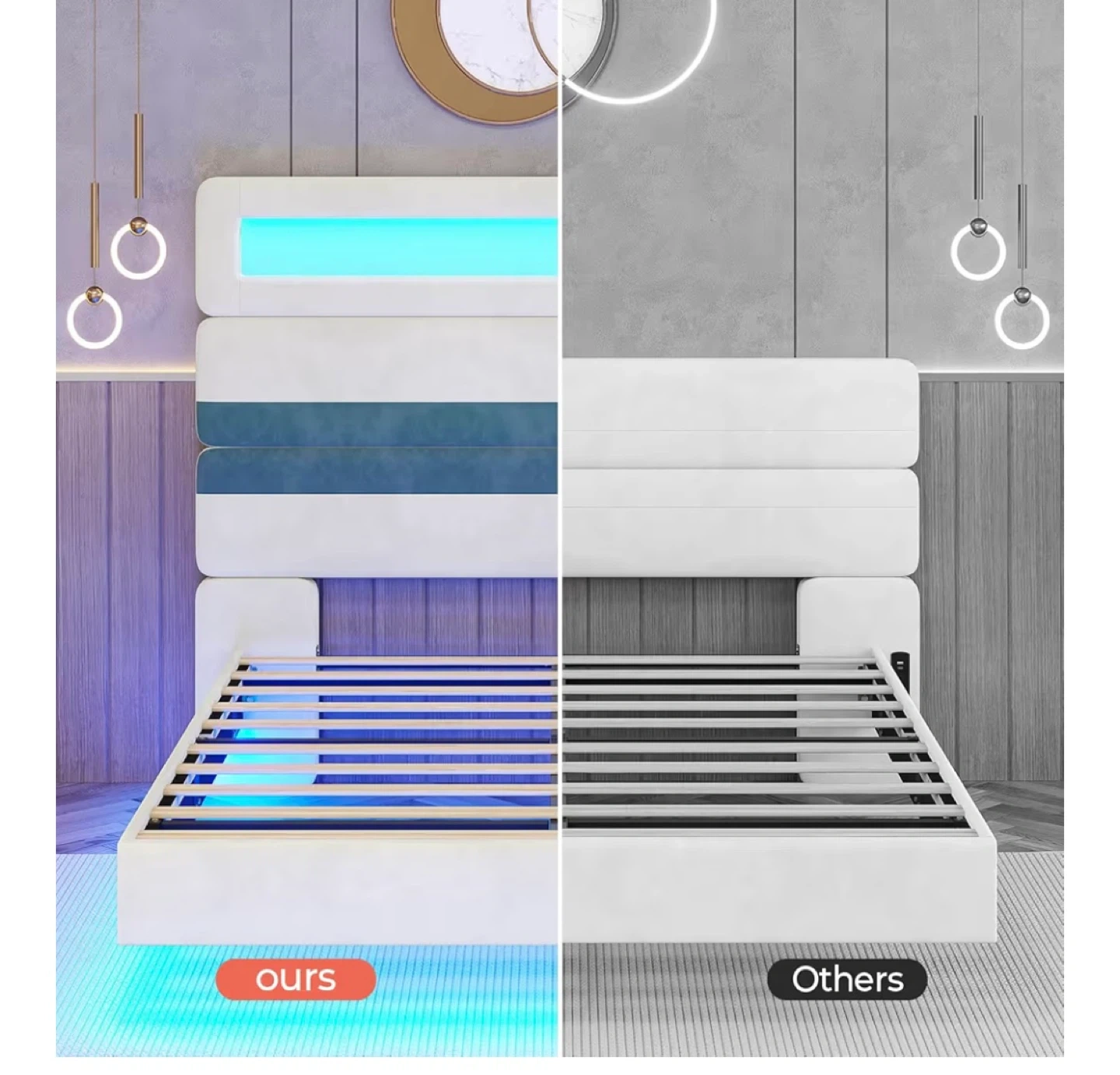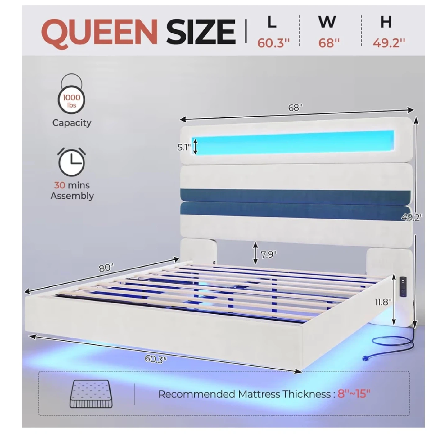 Selling a bed frame with smart RGB LED lights that are easy to control with the app system. It features a built-in charging station with 2 AC outlets, USB ports, and Type C ports. The headboard is made with quality velvet. The bed also has dynamic modes and a remote control