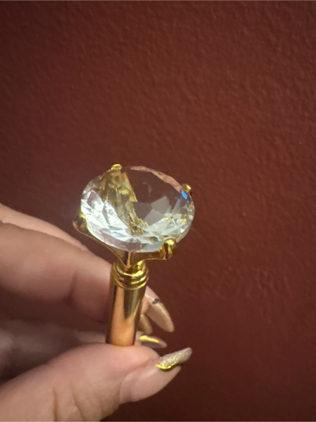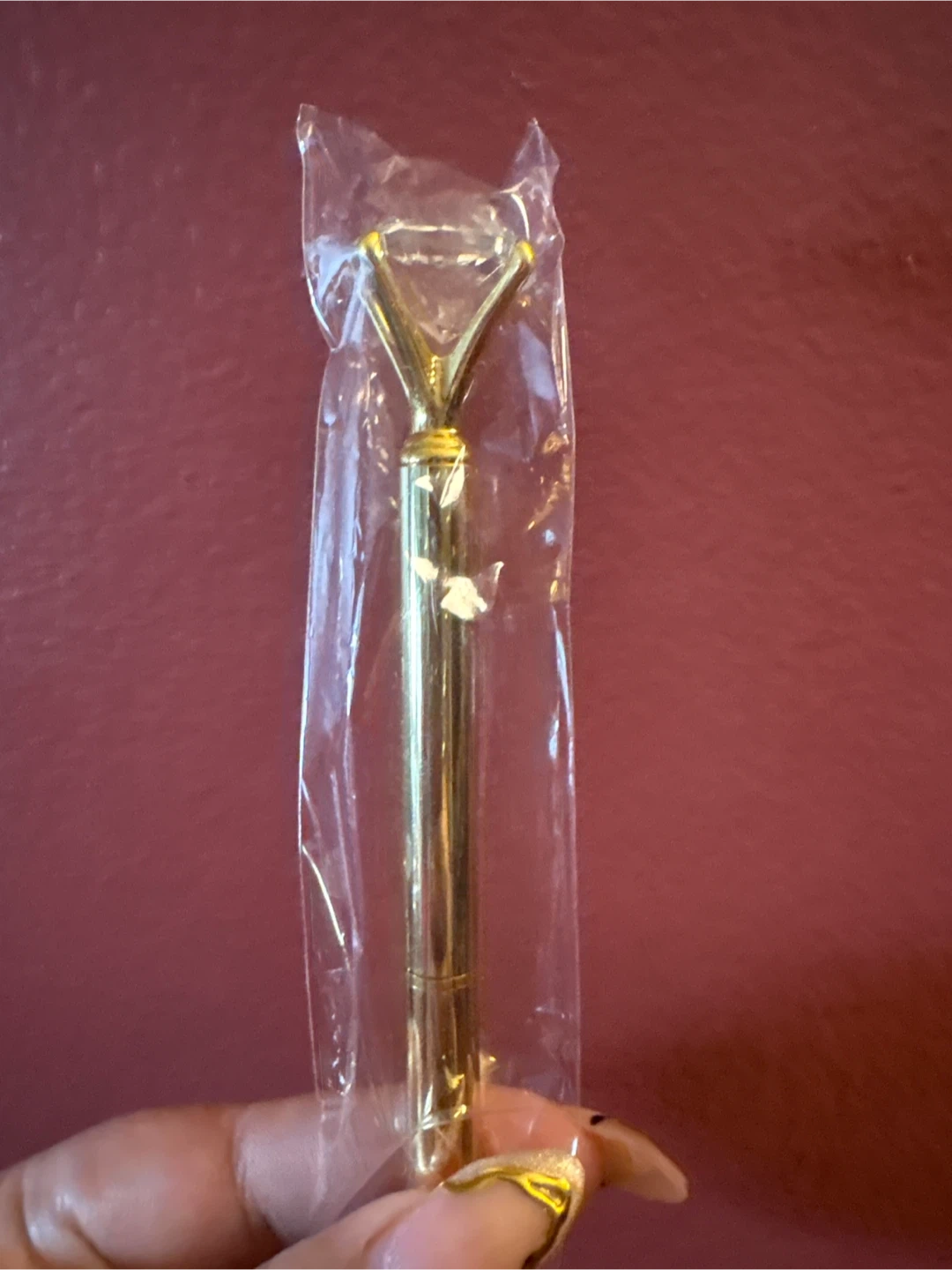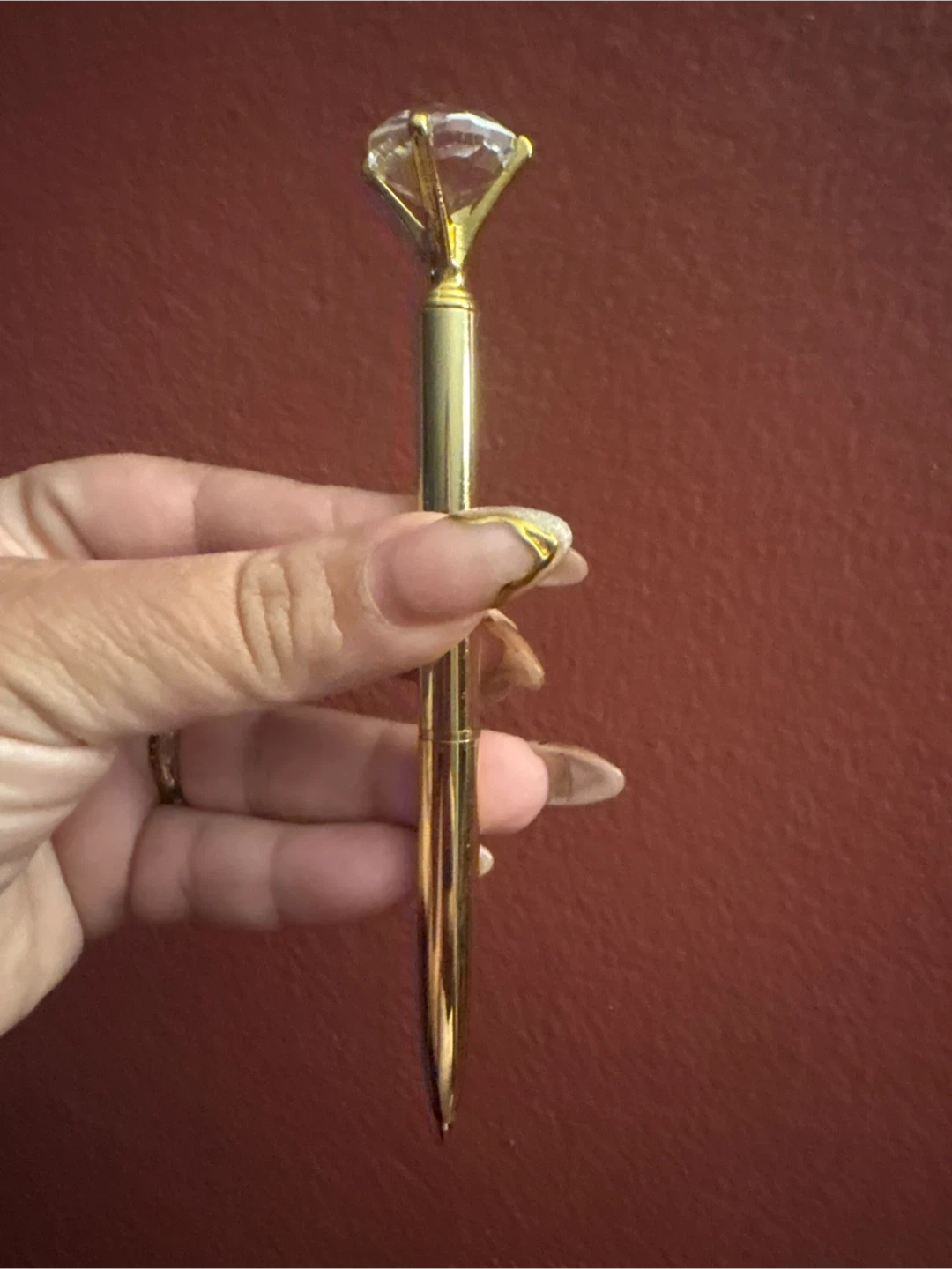 This decorative ballpoint pen features a gold finish and a large faceted crystal top that resembles a diamond. It's branded "ICD Private Jewelry" and comes in protective plastic packaging. It's a stylish addition to any desk or bag! New
