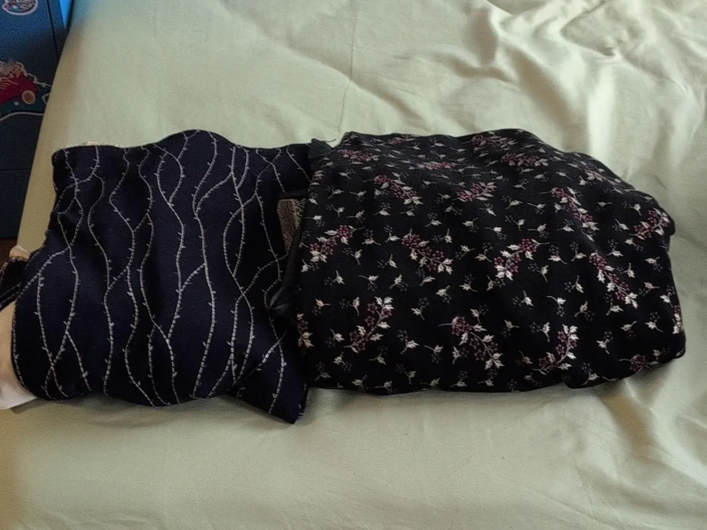Two tops with different floral prints. One features a navy background with a white vine pattern. The other has a black background with a berry and floral design. Both are folded and ready to wear. Both 25dollars