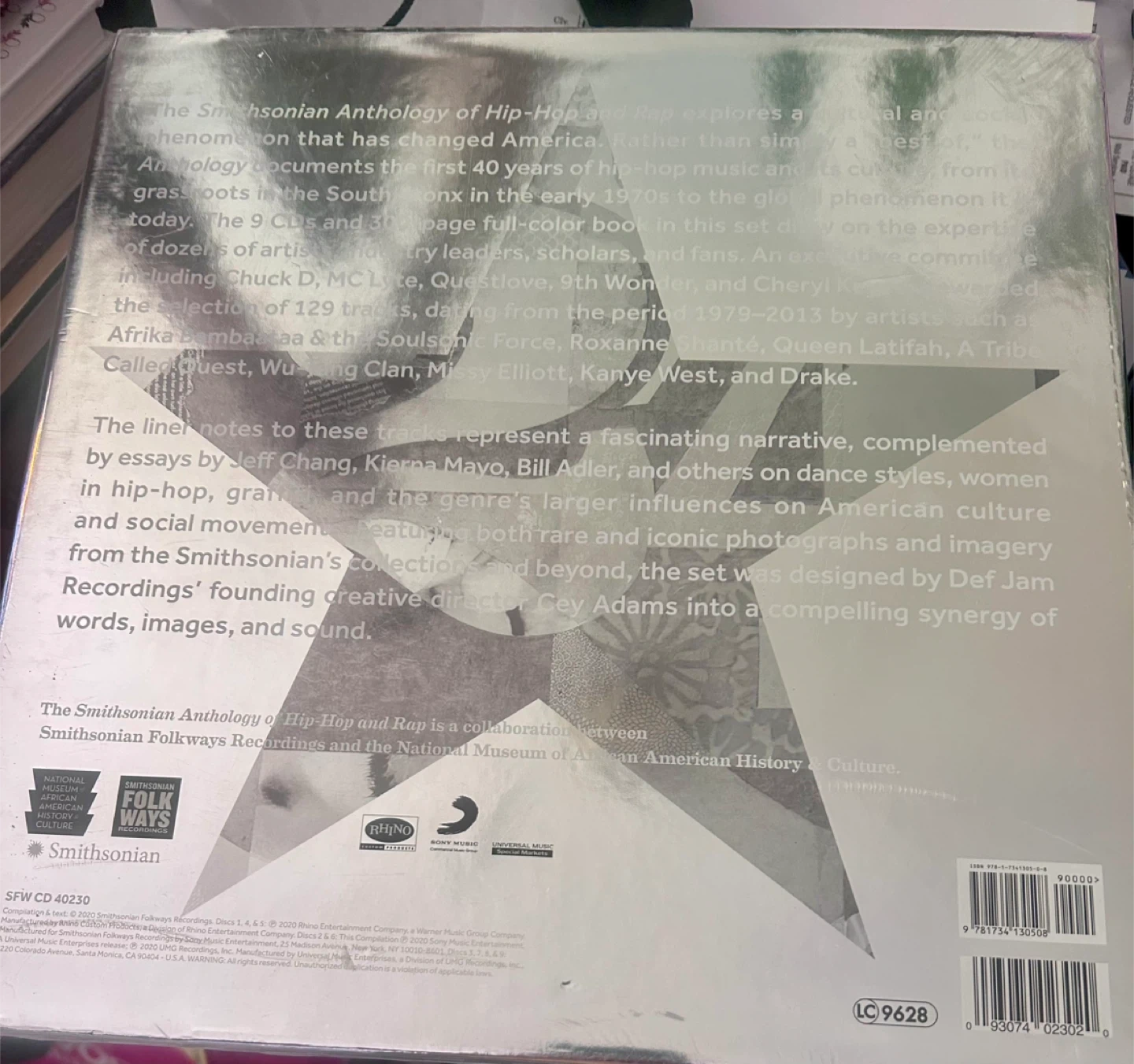 Selling the Smithsonian Anthology of Hip Hop and Rap, which includes 9 CDs and a full-color book. This set explores the history of hip-hop and its cultural and social phenomenon. It features 129 tracks from 1979-2013 by artists such as Afrika Bambaataa, Wu-Tang Clan, Missy Elliott, and Kanye West. Brand new unopened.